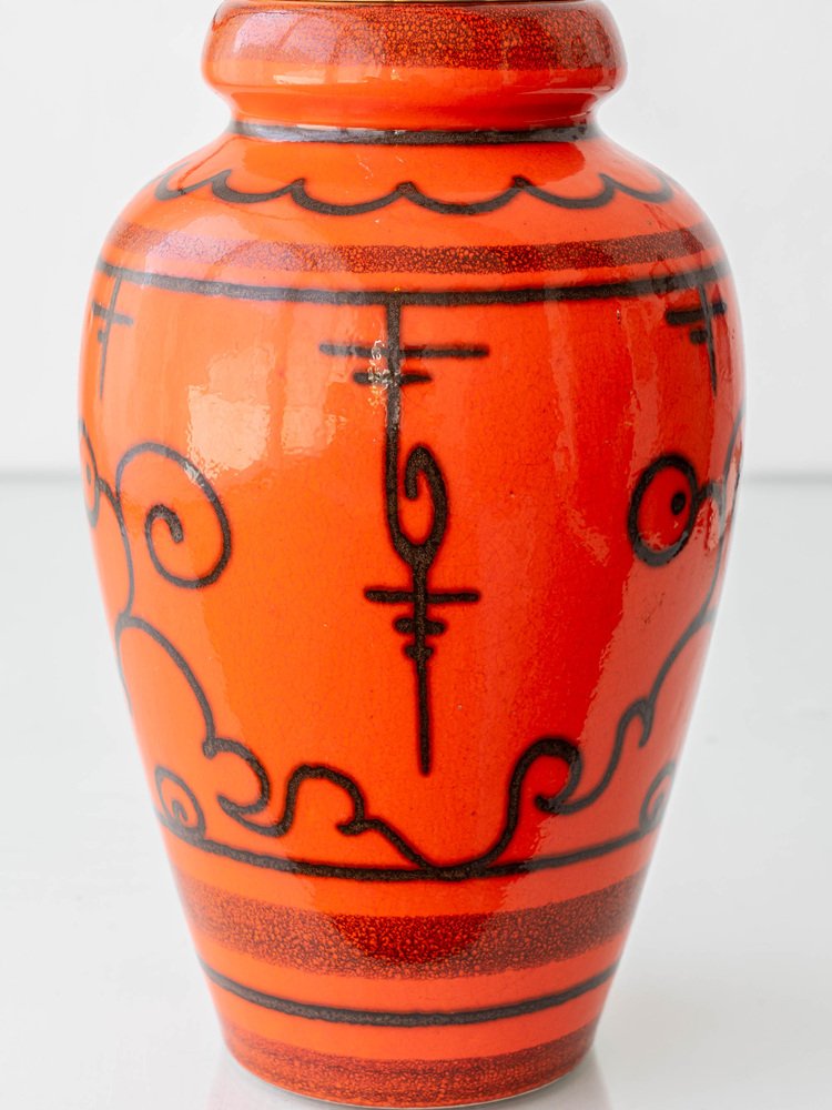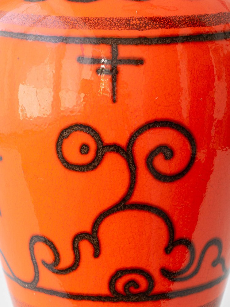 The ceramic body is defined by its vivid fire-orange glaze, layered with matte black linear motifs that wrap rhythmically around the form. The decoration is emblematic of Flora Gouda’s late-modern output: abstract, architectural, and deliberately graphic, with strong horizontal banding and calligraphic symbols that feel both mid-century and subtly postmodern. The saturated orange glaze has a molten, almost lava-like depth, while the black ornamentation provides sharp contrast and visual structure.