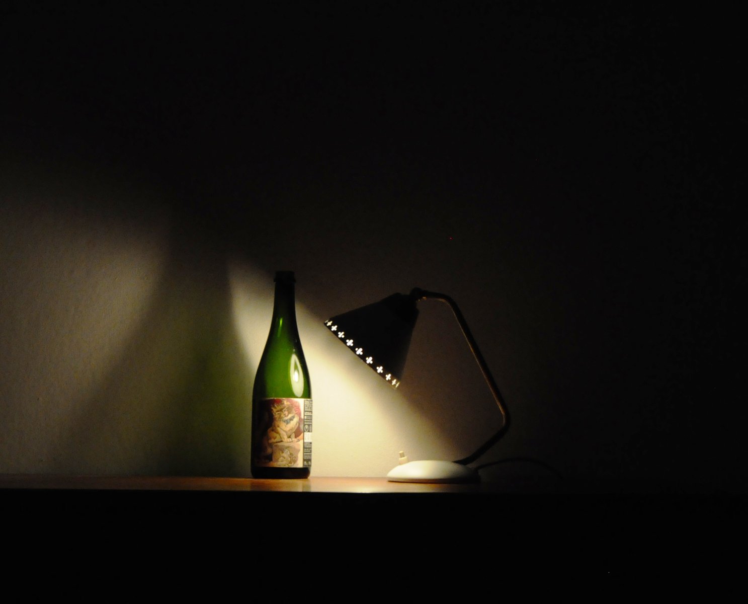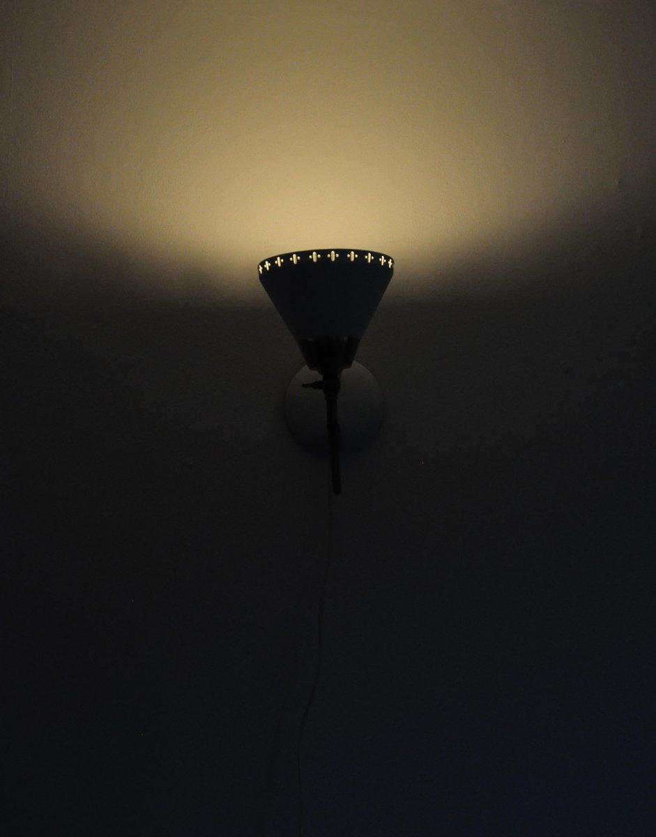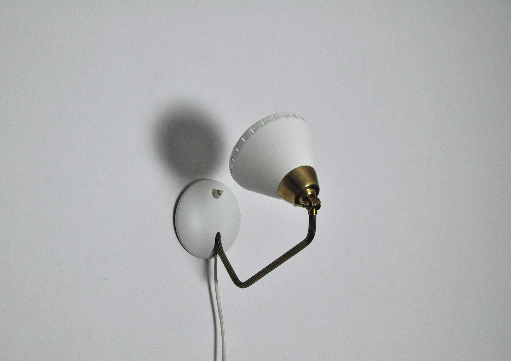 Il paralume regolabile presenta perforazioni decorative nel bordo inferiore. Il braccio è in ottone con struttura scanalata.