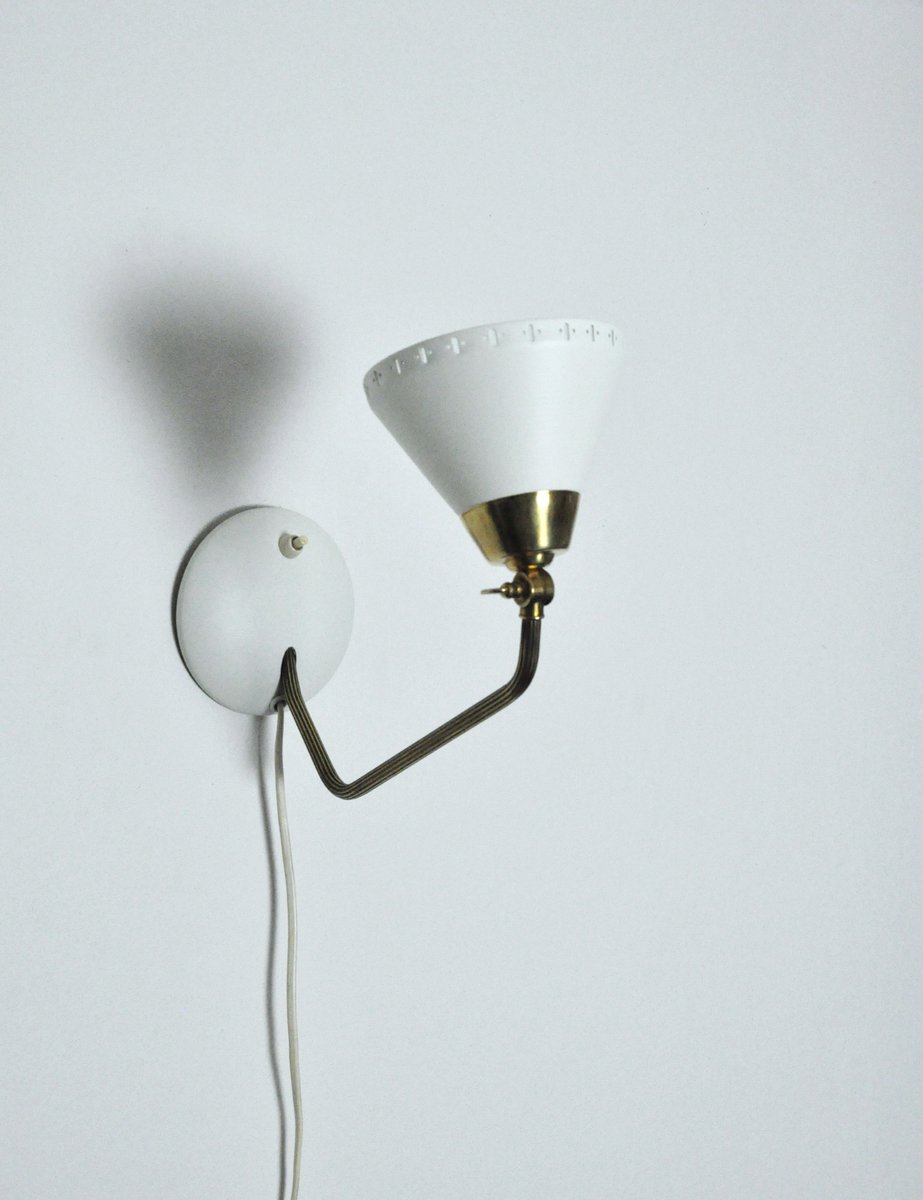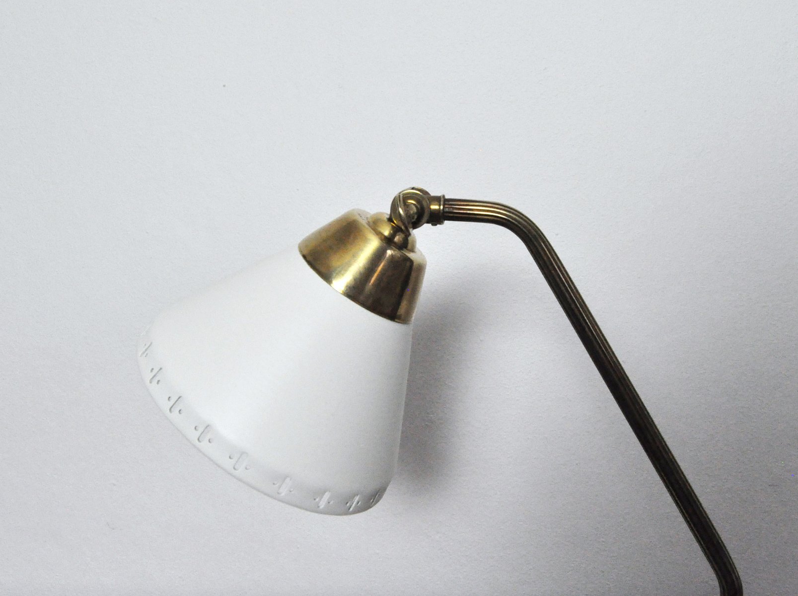 The adjustable shade has decorative perforations in the lower rim. The arm is made of brass with a grooved structure.
