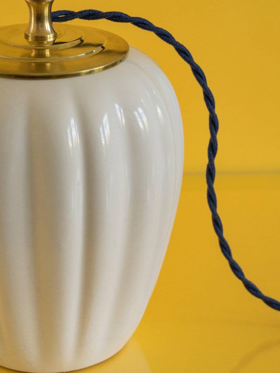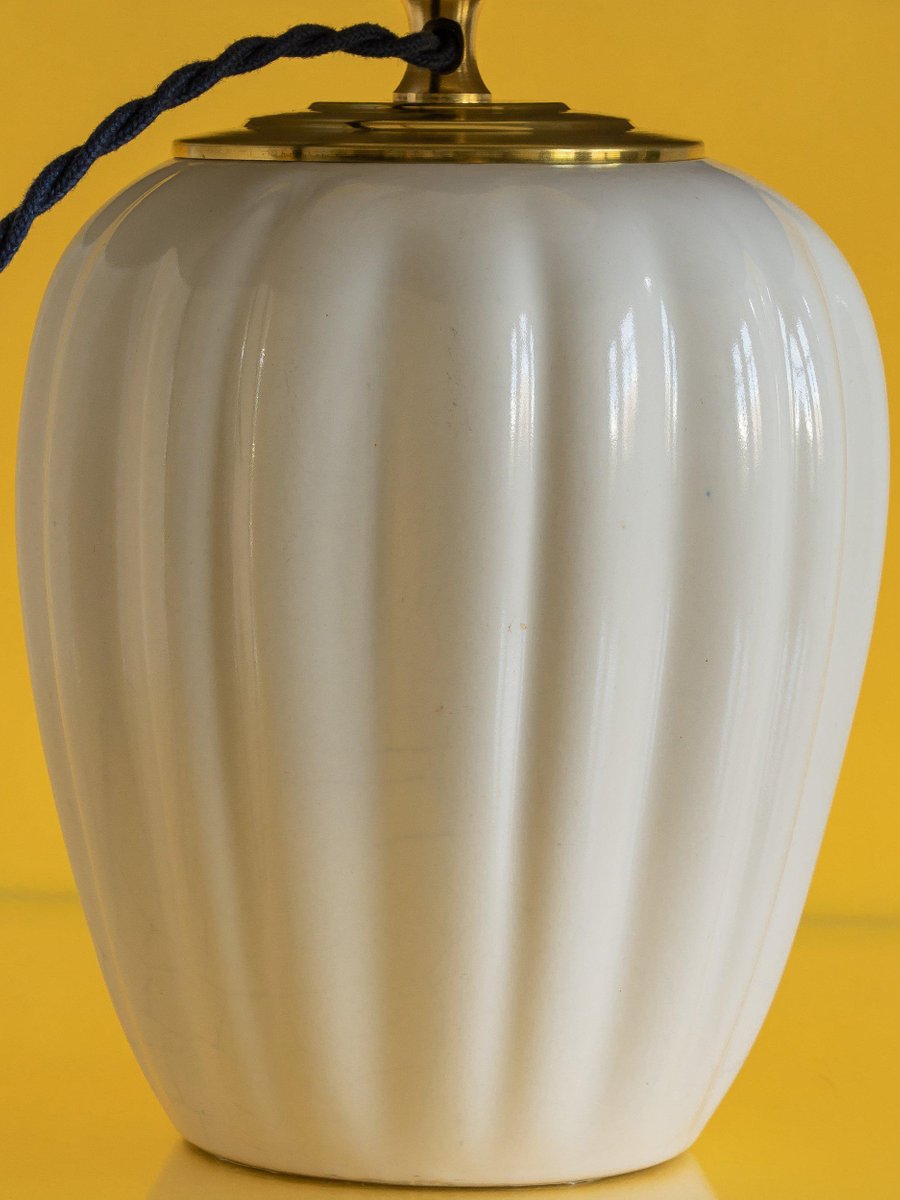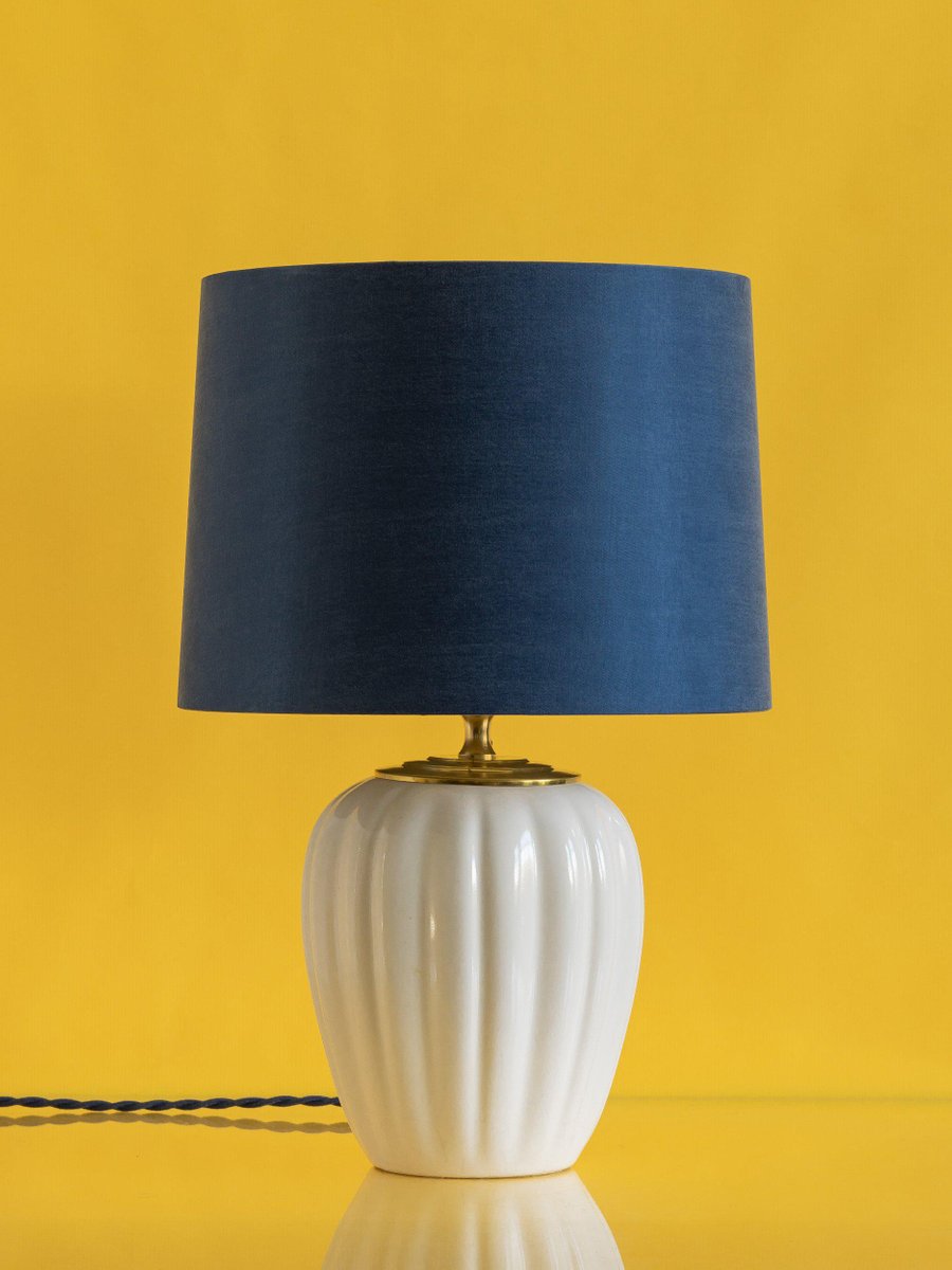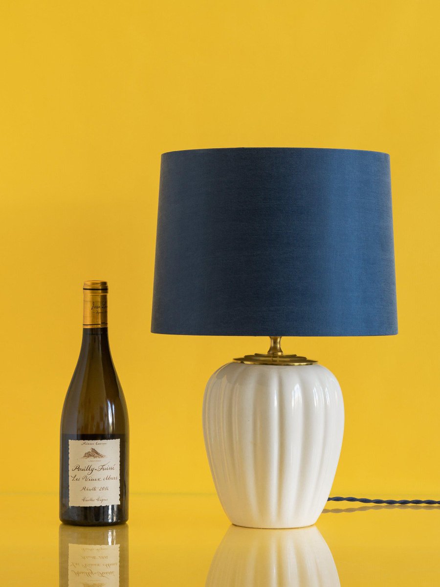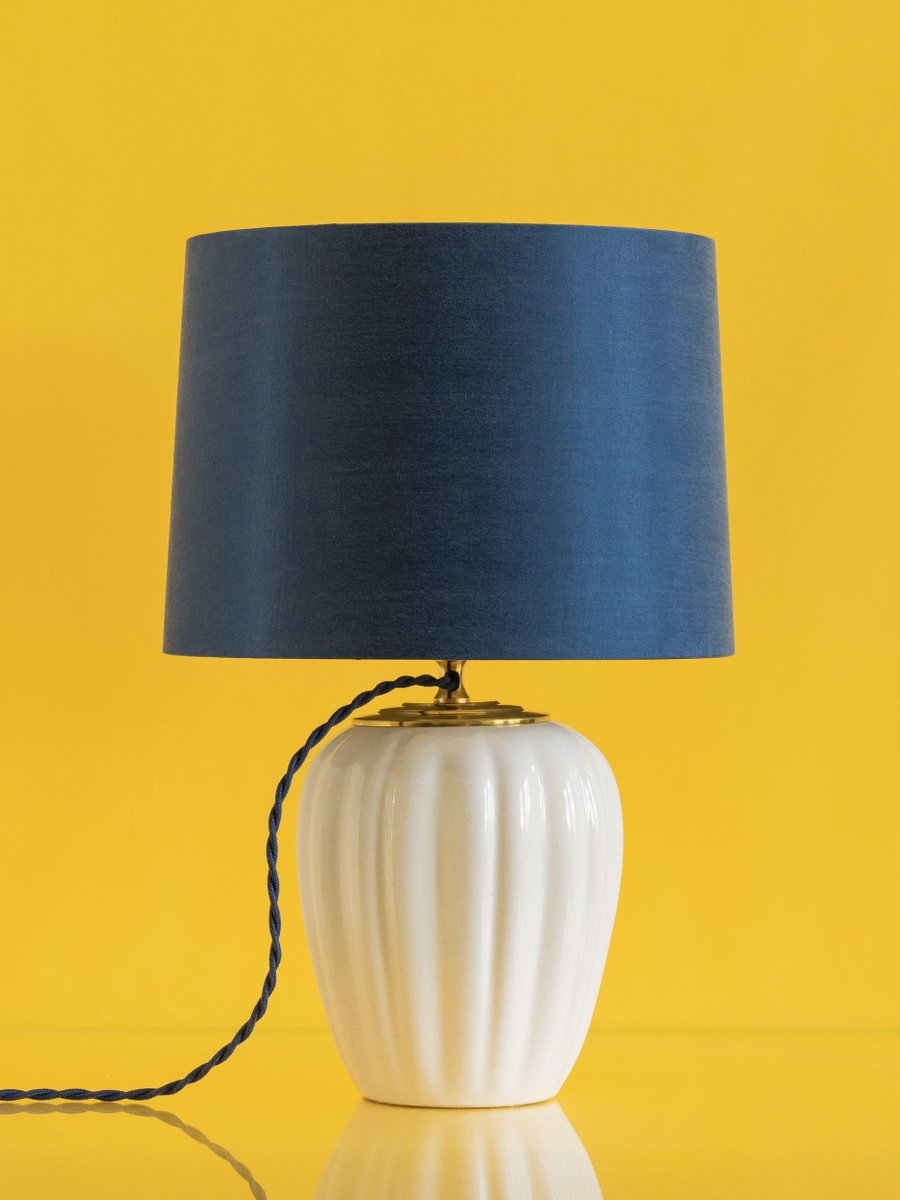Sometimes, simple is best. Unadorned and elegant, Plain Jane is a one-of-a kind lamp lovingly handcrafted from a vintage Royal Delft ( De Porceleyne Fles ) White ( Delfts Wit ) vase. We’ve paired the base with a lampshade in a deep capri blue fabric with a luminosity, soft gorgeous texture & platinum inner lining, custom made at an atelier near Amsterdam, along with a matching blue cord. De Porceleyne Fles started making White Delft in the 1930’s. Because of the economic depression and the outbreak of the Second World War, the market for hand painted Delftware all but disappeared. The Delft White models were seen as more utilitarian, but still had a unique artistry to them. Instead of the feature being the hand-painting, it became the shape of the vase itself. At the end of the sixties the total collection, consisted of more than 174 different creatively shaped models. In 1976 production was stopped. Today, only the tulip vases are made in Delfts Wit . Height: 54 cm (21.25 in) with shade Width: 30 cm (11.8 in) with shade E14 fitting
