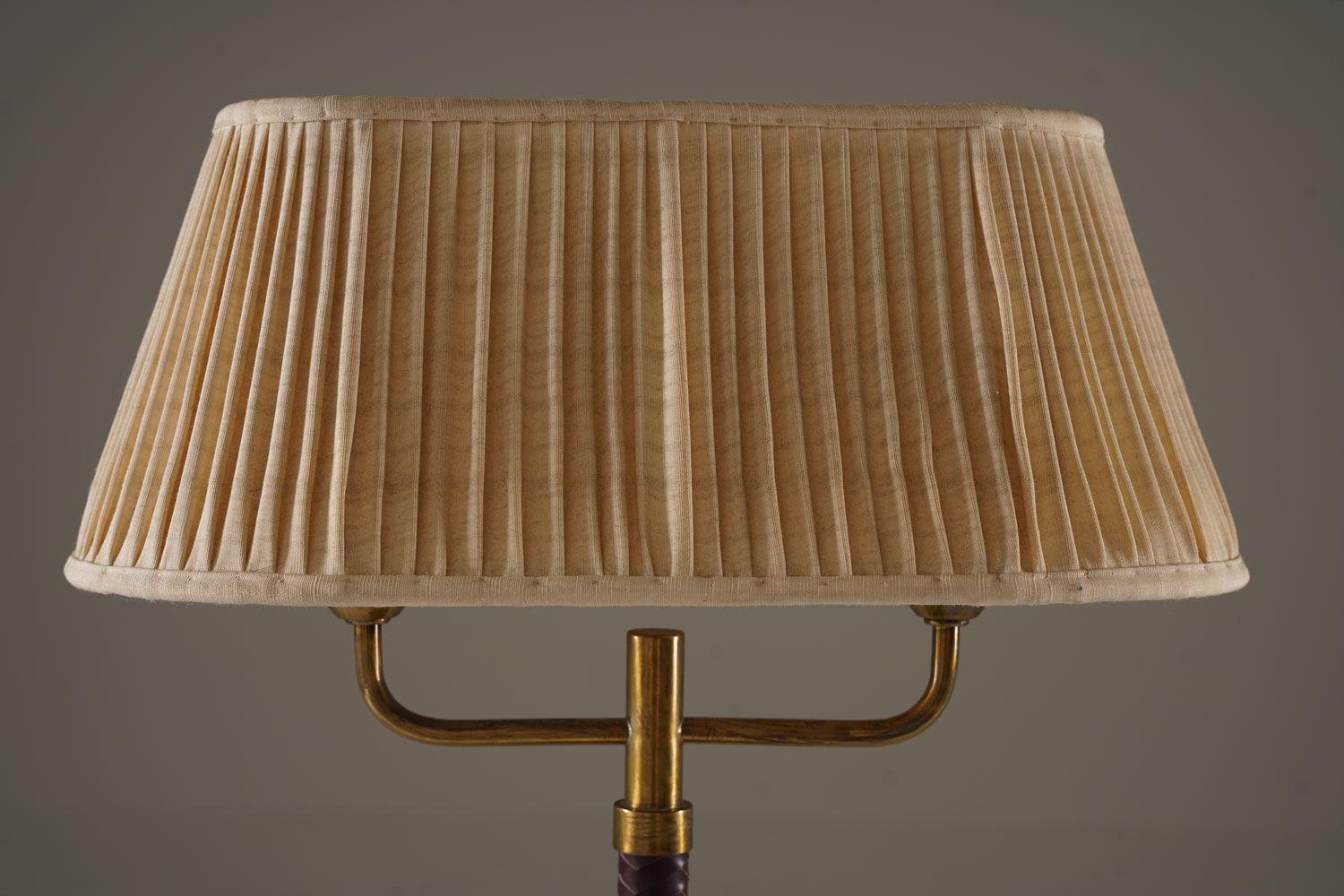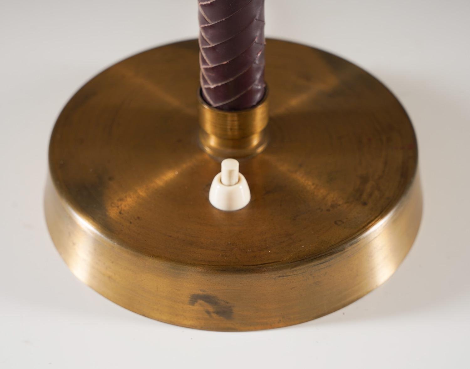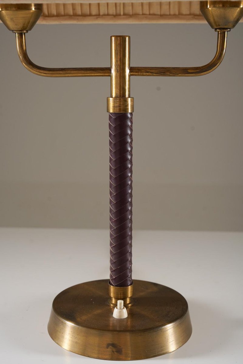 Swedish table lamp manufactured by Karlskrona Lampfabrik, 1950s. This lamp features two light sources, hidden by oval-shaped shades. The lamp is made of brass with a wreathed leather handle. Condition: Very good original condition. Some imperfections and light damage on the backside of the shade, as shown in pictures, Wiring: All our lamps are wired for EU standards. We, unfortunately, have neither the means nor the qualifications to wire them for US standards.