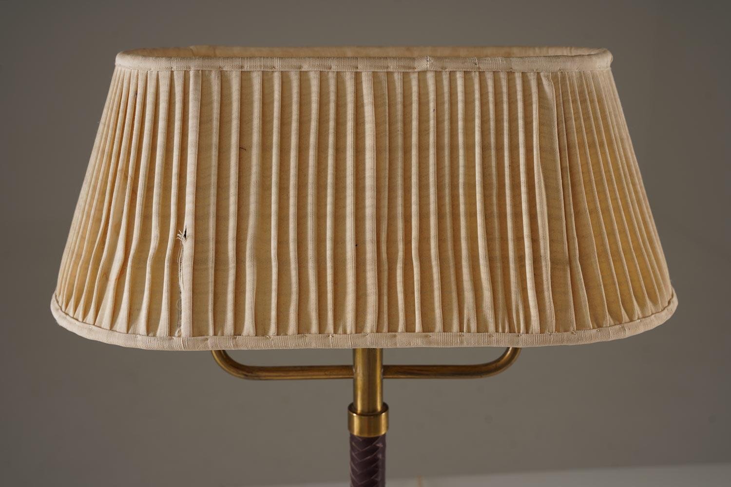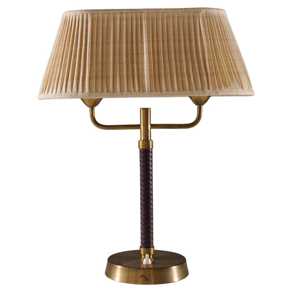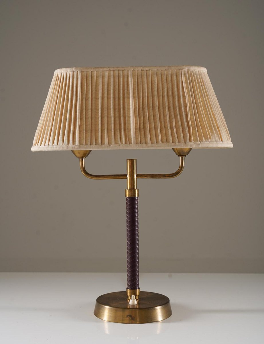 Swedish table lamp manufactured by Karlskrona Lampfabrik, 1950s. This lamp features two light sources, hidden by oval-shaped shades. The lamp is made of brass with a wreathed leather handle. Condition: Very good original condition. Some imperfections and light damage on the backside of the shade, as shown in pictures, Wiring: All our lamps are wired for EU standards. We, unfortunately, have neither the means nor the qualifications to wire them for US standards.