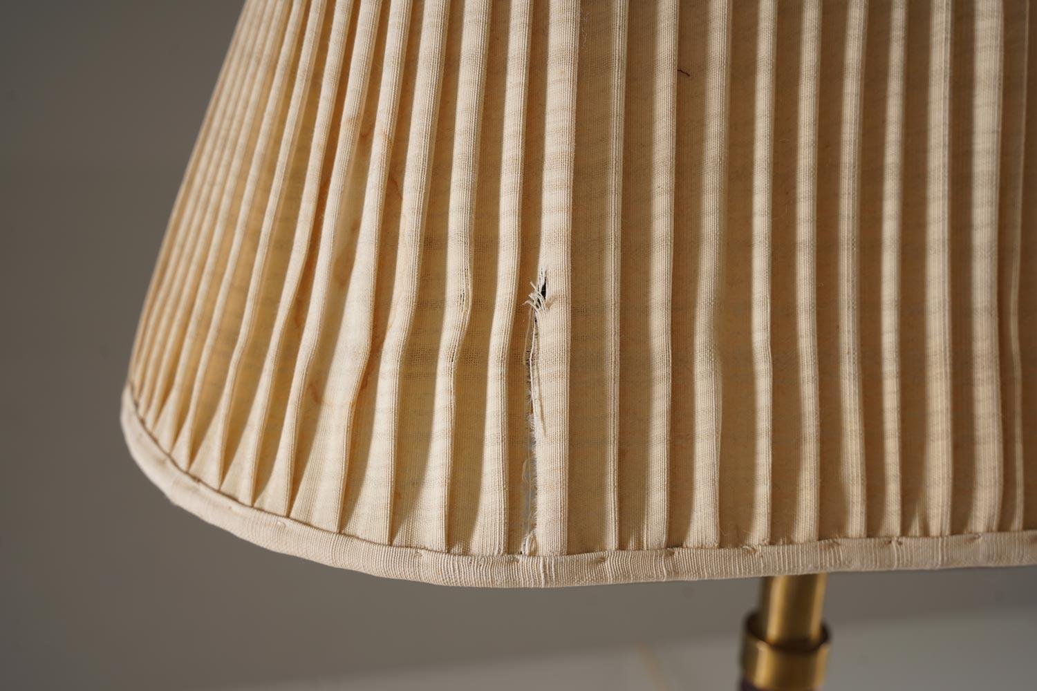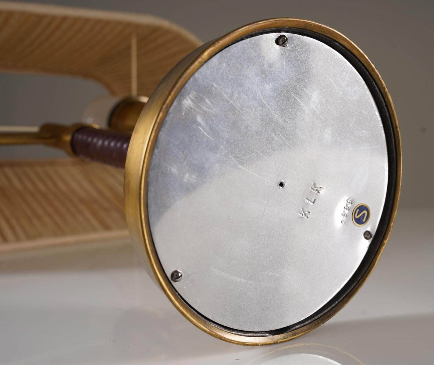 Lampada da tavolo svedese prodotta dalla Karlskrona Lampfabrik, anni Cinquanta. Questa lampada presenta due sorgenti luminose, nascoste da paralumi di forma ovale. La lampada è realizzata in ottone con una maniglia in pelle a forma di corona. Condizioni: Ottime condizioni originali. Alcune imperfezioni e leggeri danni sul retro del paralume, come mostrato nelle foto: Tutte le nostre lampade sono cablate secondo gli standard UE. Purtroppo non abbiamo né i mezzi né le qualifiche per cablarle secondo gli standard statunitensi.