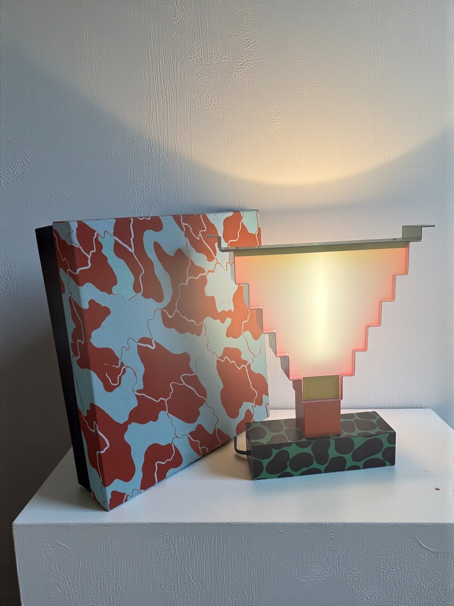 La lampada "Ruskin" è un'icona indiscussa del design postmoderno, creata da George Sowden nel 1983 per la celebre collezione "Objects for the Electronic Age". Questa serie, sebbene sia un progetto collaborativo con Nathalie Du Pasquier, presenta design individuali in cui la "Ruskin" si distingue come il capolavoro architettonico di Sowden.