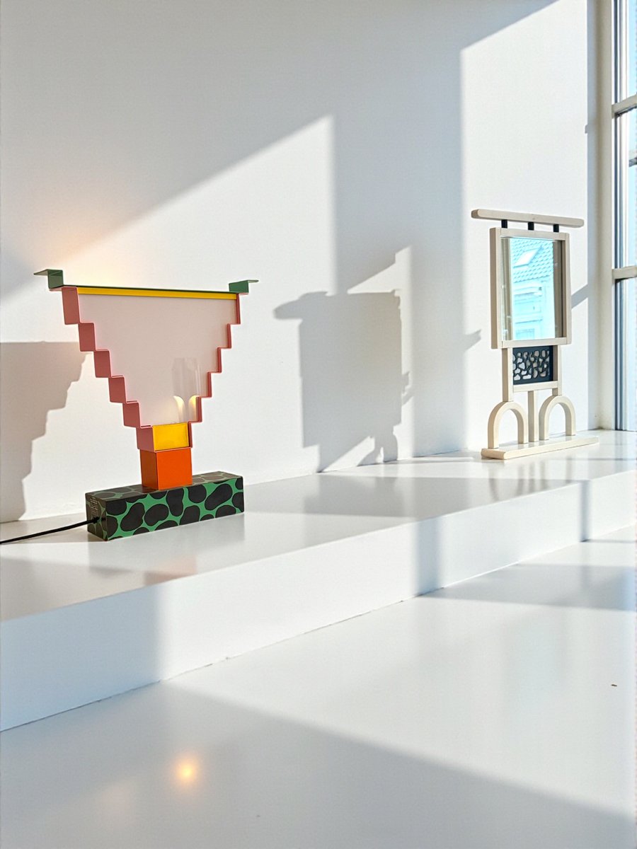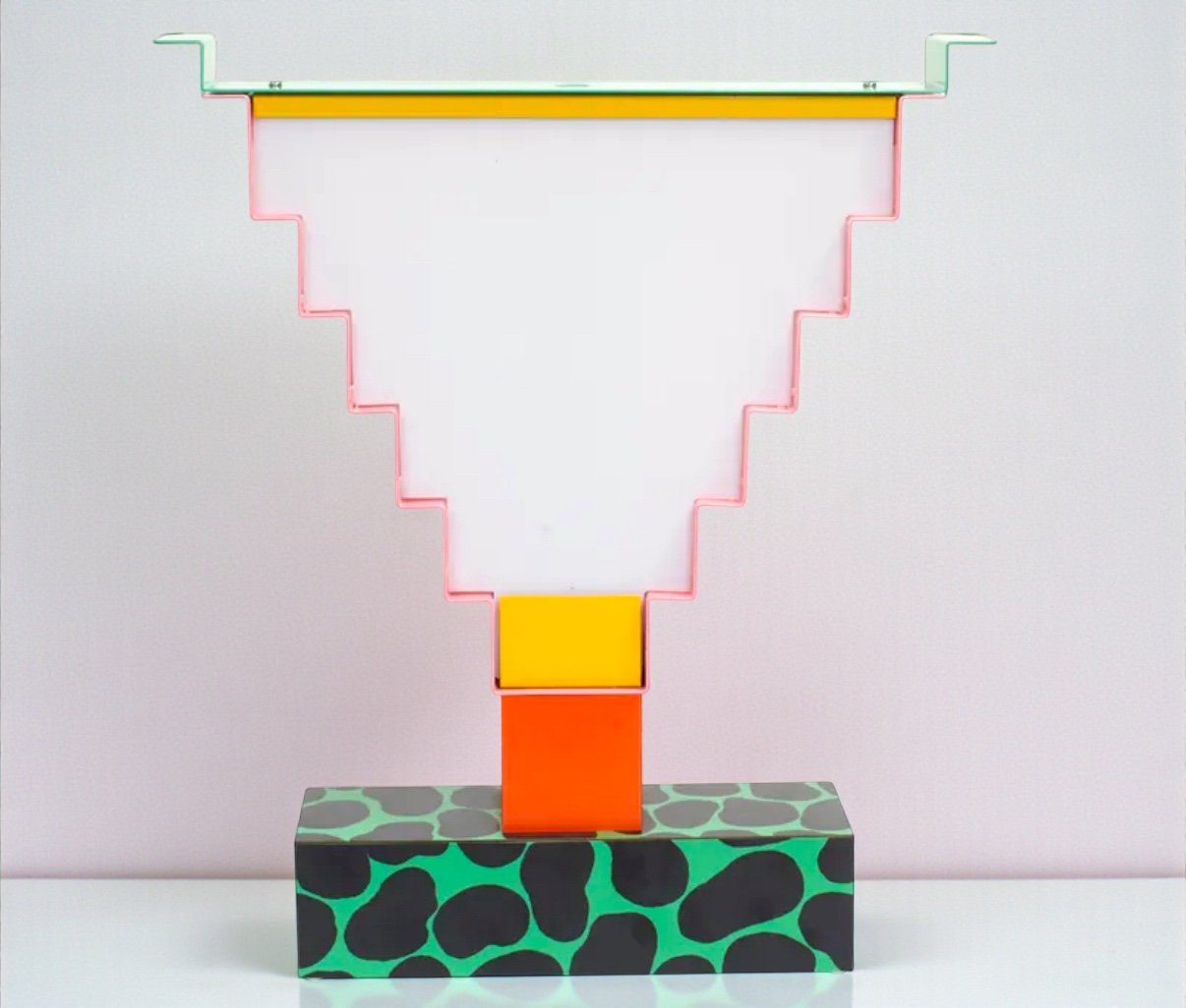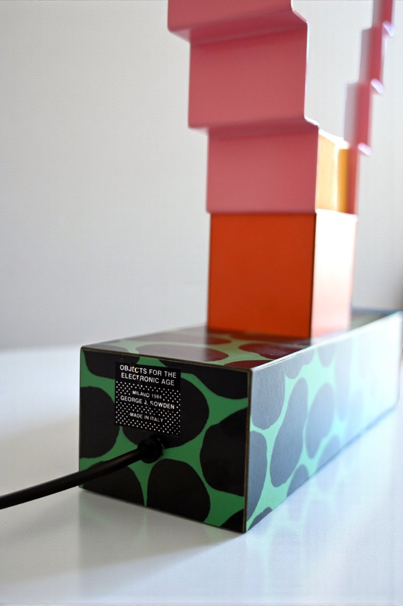The "Ruskin" lamp is a definitive icon of Postmodern design, created by George Sowden in 1983 for the celebrated 'Objects for the Electronic Age' collection. This series, although a collaborative project with Nathalie Du Pasquier, features individual designs where the "Ruskin" stands as Sowden’s architectural masterpiece.