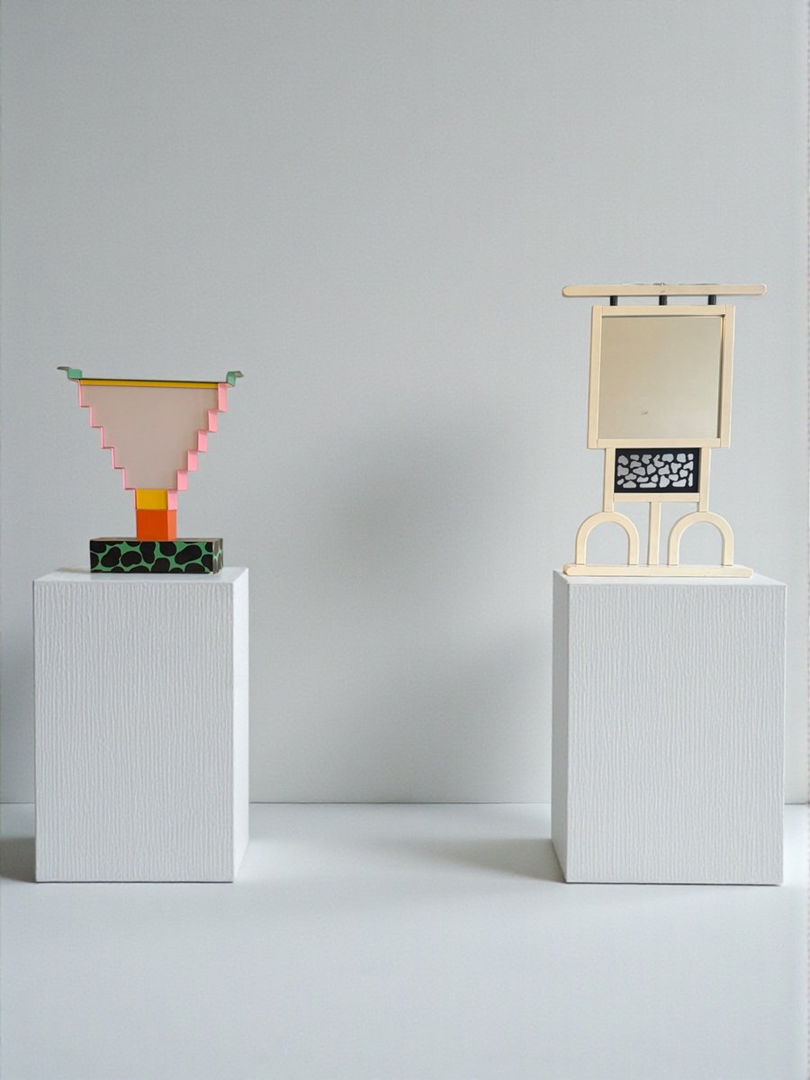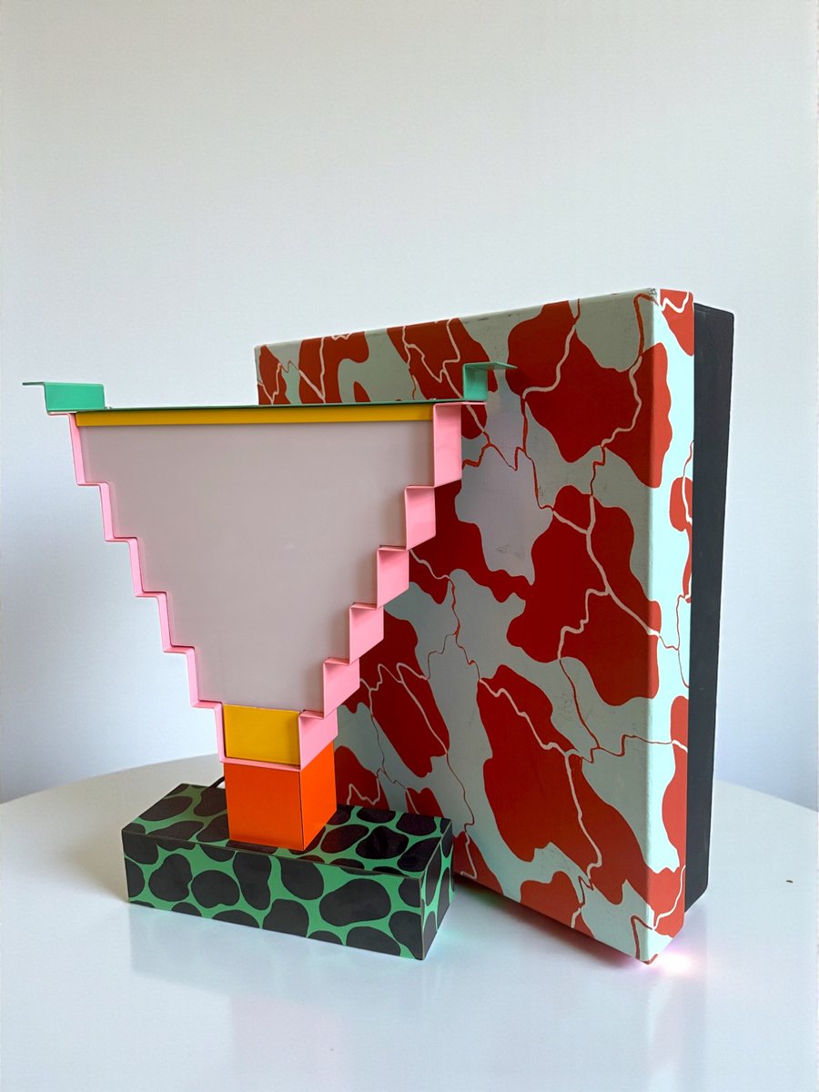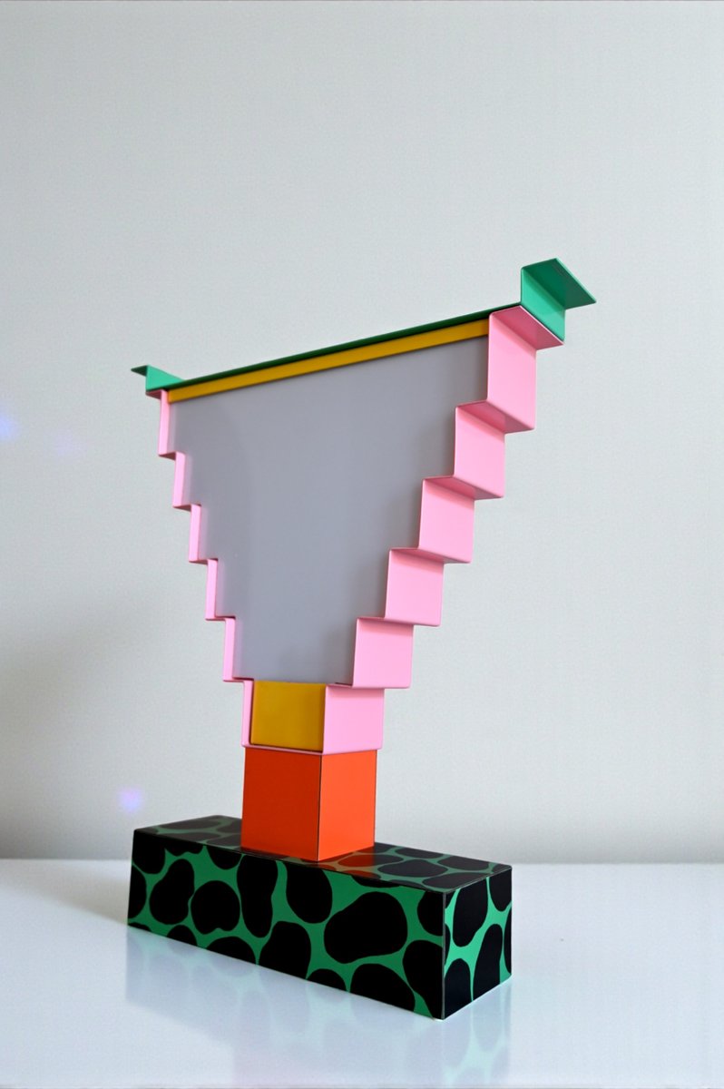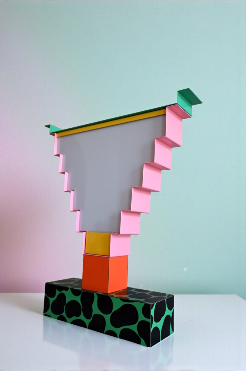 The "Ruskin" lamp is a definitive icon of Postmodern design, created by George Sowden in 1983 for the celebrated 'Objects for the Electronic Age' collection. This series, although a collaborative project with Nathalie Du Pasquier, features individual designs where the "Ruskin" stands as Sowden’s architectural masterpiece.