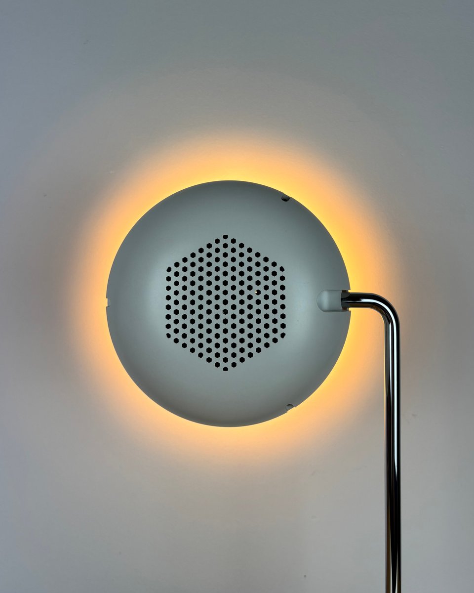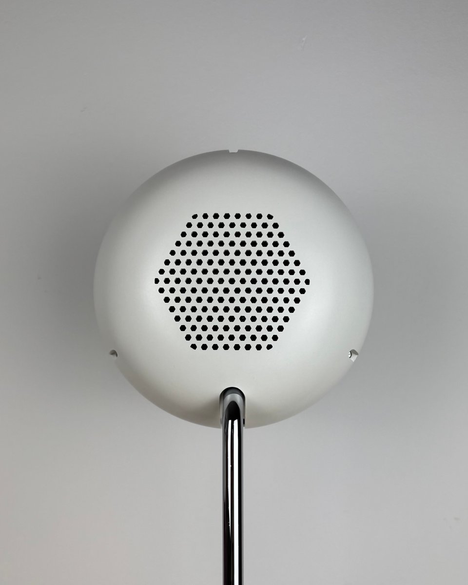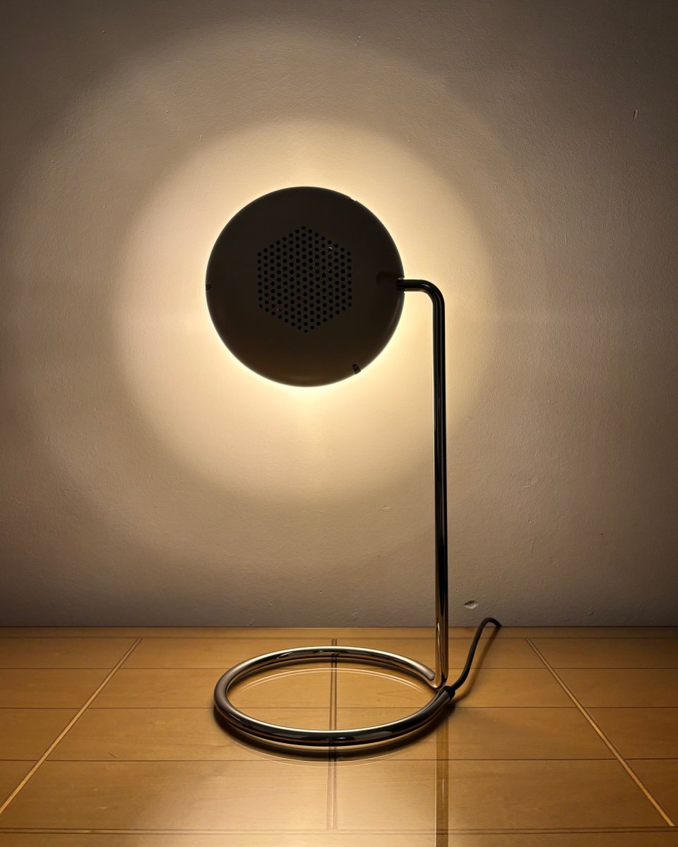 Evocando l'ottimismo dell'era spaziale della Germania occidentale degli anni Settanta, questa lampada da tavolo di Staff Leuchten abbina un paralume cilindrico nitido a una base ad anello cromata lucida per un aspetto scultoreo e fluttuante sulla scrivania o sulla credenza. La testa si inclina per dirigere la luce dove serve, mentre il riflettore interno a specchio offre un fascio di luce concentrato e accogliente, perfetto per la lettura, l'accentuazione di oggetti o la creazione di suggestive scene di illuminazione dall'alto o dal basso. La calotta posteriore perforata favorisce la ventilazione e aggiunge un tocco grafico visibile da dietro, un dettaglio sottile già visto sulle teste Staff in stile faretto dell'epoca.