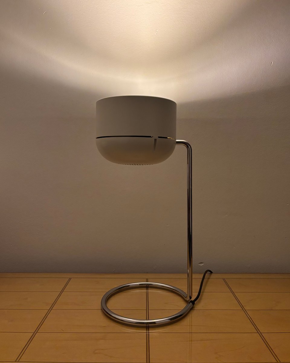 Evoking the Space Age optimism of 1970s West Germany, this Staff Leuchten table lamp pairs a crisp cylindrical shade with a polished chrome ring base for a sculptural, floating look on the desk or sideboard. The head tilts to direct light where needed, while a mirrored internal reflector delivers a cozy, concentrated beam—perfect for reading, accenting objects, or creating atmospheric up- or downlighting scenes. The perforated rear cap aids ventilation and adds a graphic touch visible from behind, a subtle detail seen on Staff’s spotlight-style heads from the period.