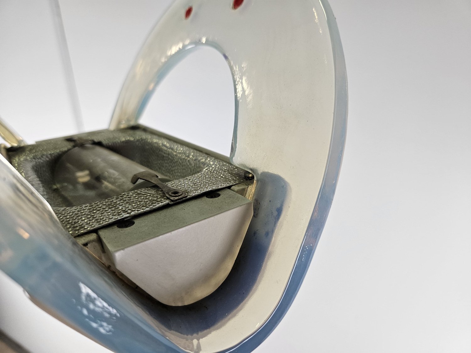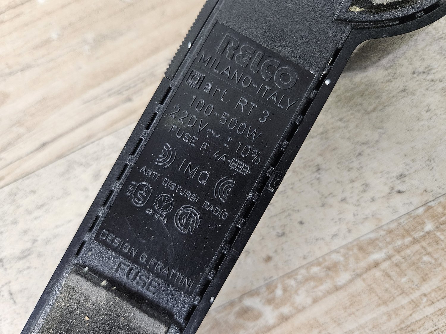 The power socket shows the design by G. Frattini for Relco with the RT3 lamp, however, in my opinion, the power switch was placed later and probably taken from another lamp.