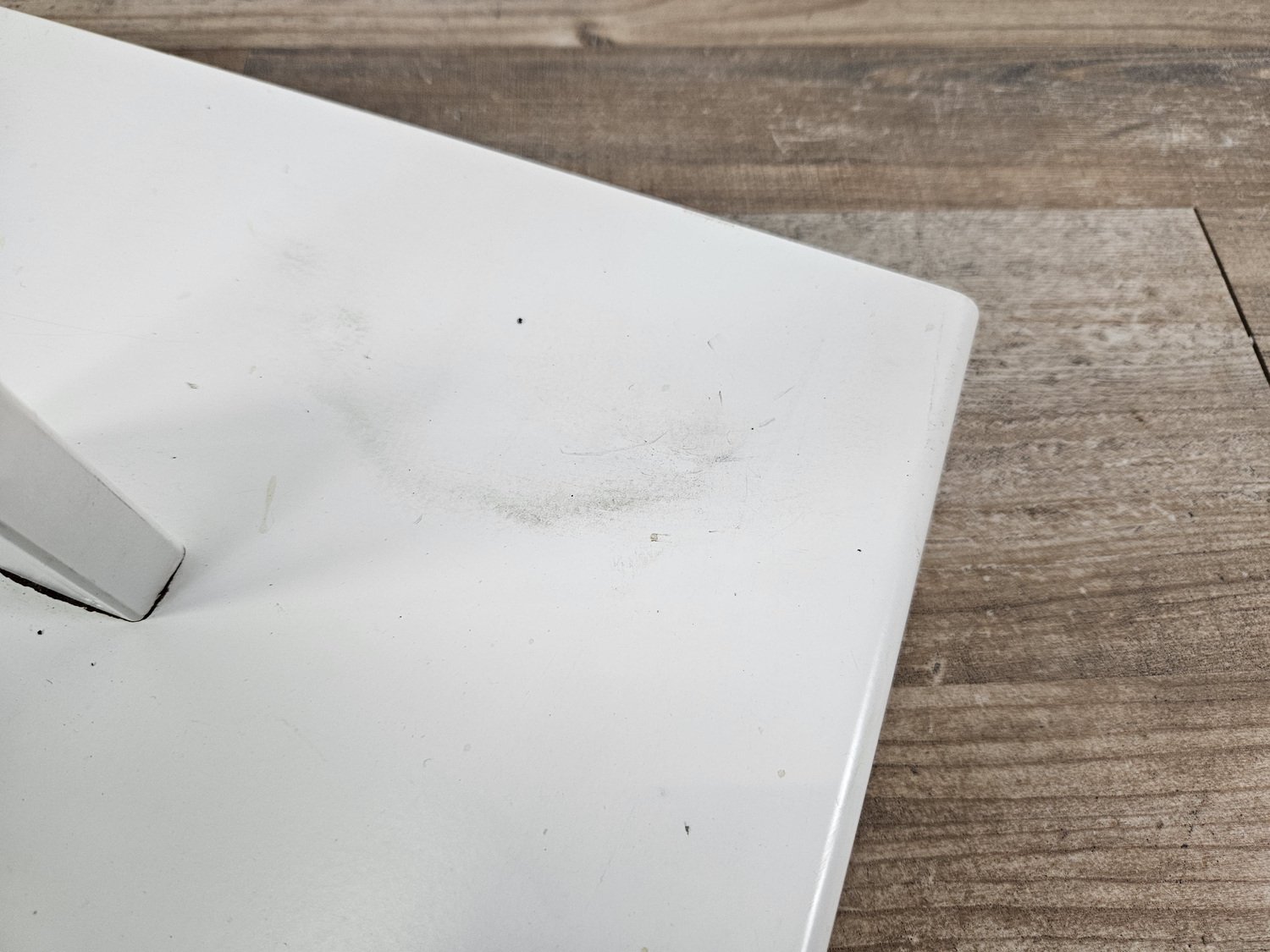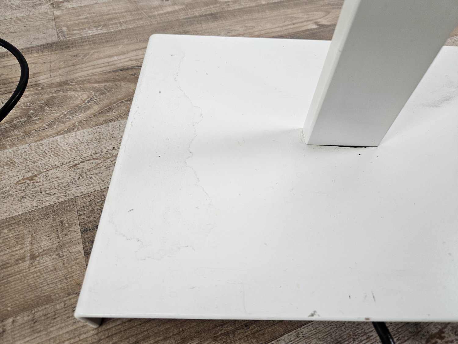 La lampada è in ferro smaltato laccato bianco con base rettangolare, punto luce in vetro lavorato e perfettamente integro.