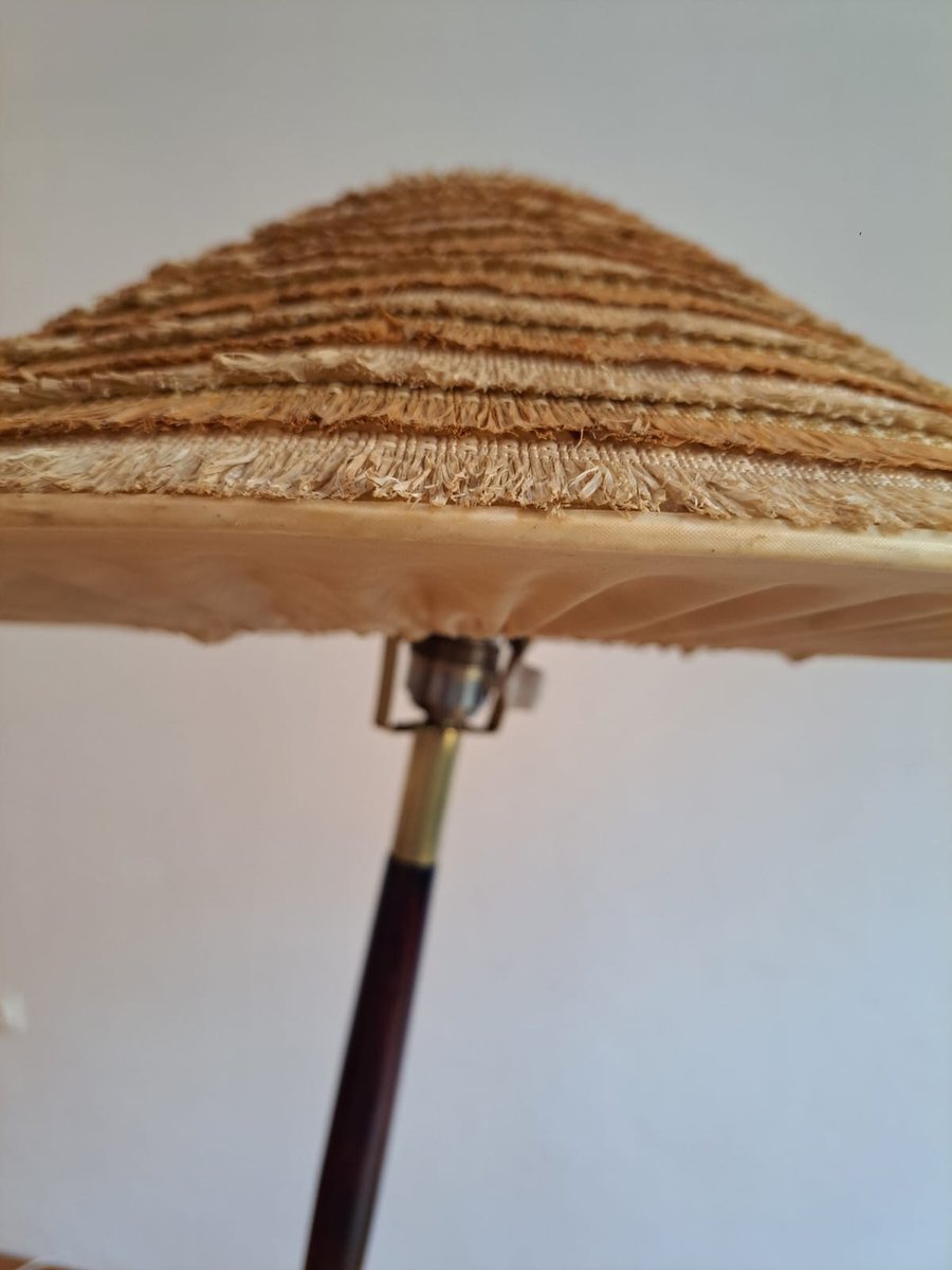 La base della lampada e le "sezioni intermedie" tra le parti in legno sono in ottone con una bella patina. Le parti in legno sono in faggio tinto mogano. Il paralume è in plastica ed è in ottime condizioni vintage.