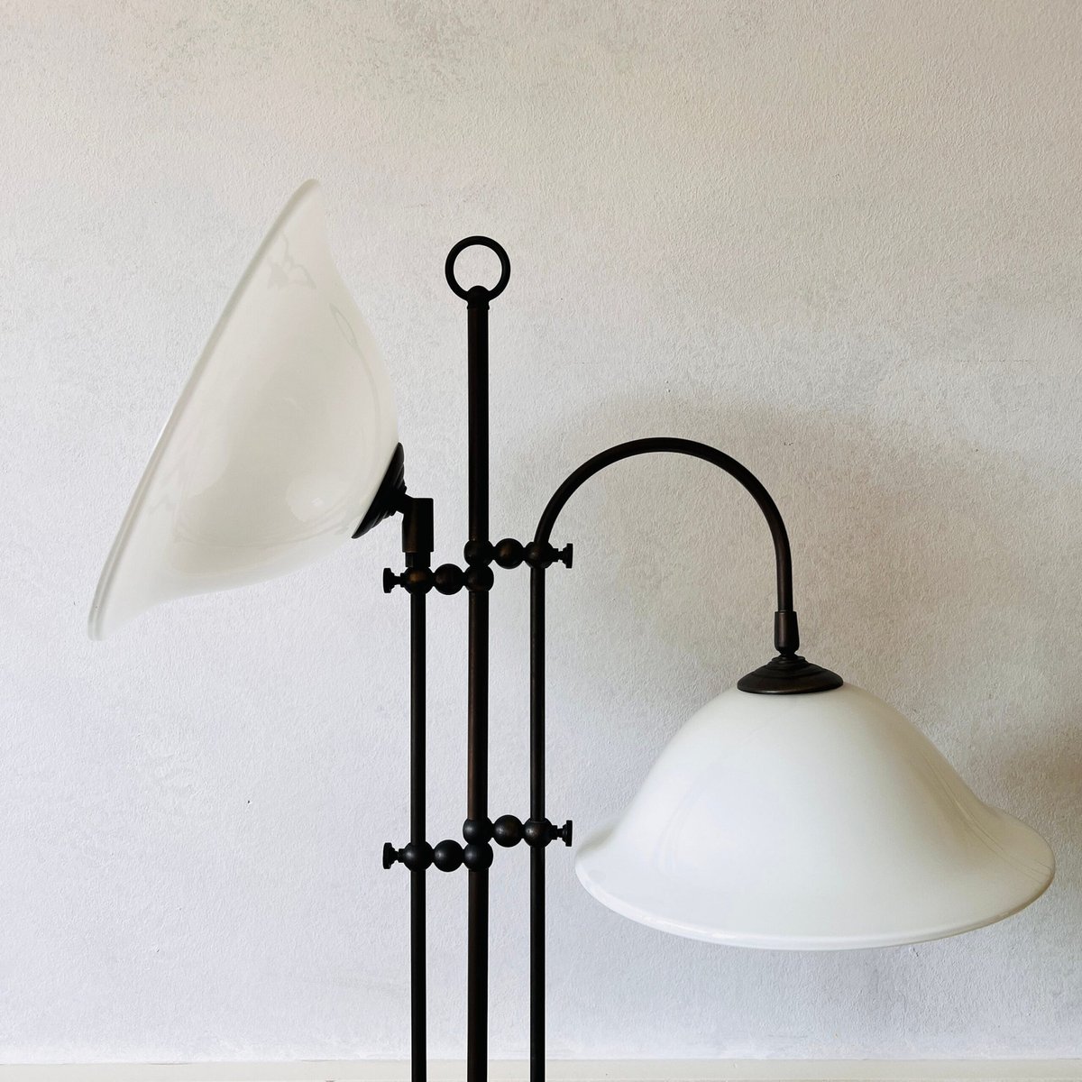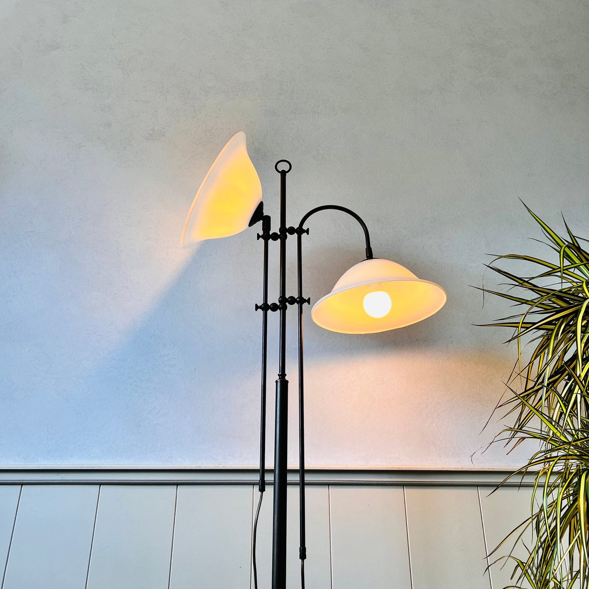 A beautiful vintage floor lamp, a standing lamp made of brass/copper with 2 milk glass lampshades. A lovely retro tall lamp that is adjustable in height also the lampshades. The design dates from the 60-70s, and the two axes are rotatable and adjustable in height. The lamp is standing on a heavy base. Measures: Height: 157 m approx. 61.8 inches. (Total height is 193 cm/75.9 inches) The shade is 30 x 16 cm approx. 11.8 x 6.2 inches. Checked, tested, and functional. It fits the E27 Europe bulb, can be used with the USA, Canada, Japan E26 bulb. It can work at 220v and also at 120v. The bulbs are not provided. Condition: As it is vintage, it has, of course, some normal traces of age in good condition. Please see the photos. All the items in our shop are vintage, mostly used, also may have small manufacturing imperfections.