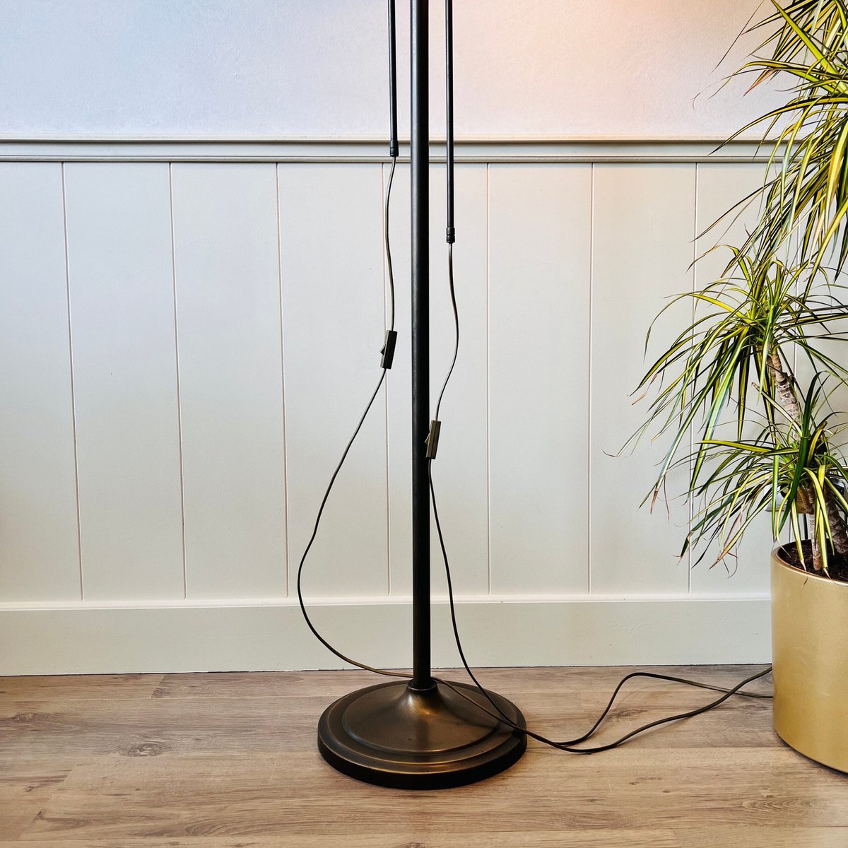 Una bella lampada da terra vintage, una lampada a stelo in ottone/rame con 2 paralumi in vetro lattimo. Una bella lampada alta retrò, regolabile in altezza anche nei paralumi. Il design risale agli anni 60-70 e i due assi sono ruotabili e regolabili in altezza. La lampada poggia su una base pesante. Misure: Altezza: 157 m circa. (L'altezza totale è di 193 cm) Il paralume misura 30 x 16 cm, circa 11,8 x 6,2 pollici. Controllata, testata e funzionante. Si adatta alla lampadina europea E27, può essere utilizzata con la lampadina E26 di USA, Canada e Giappone. Può funzionare a 220v e anche a 120v. Le lampadine non sono fornite. Condizioni: Essendo vintage, presenta, ovviamente, alcune normali tracce di età in buone condizioni. Si prega di vedere le foto. Tutti gli articoli presenti nel nostro negozio sono vintage, per lo più usati, inoltre possono presentare piccole imperfezioni di fabbricazione.