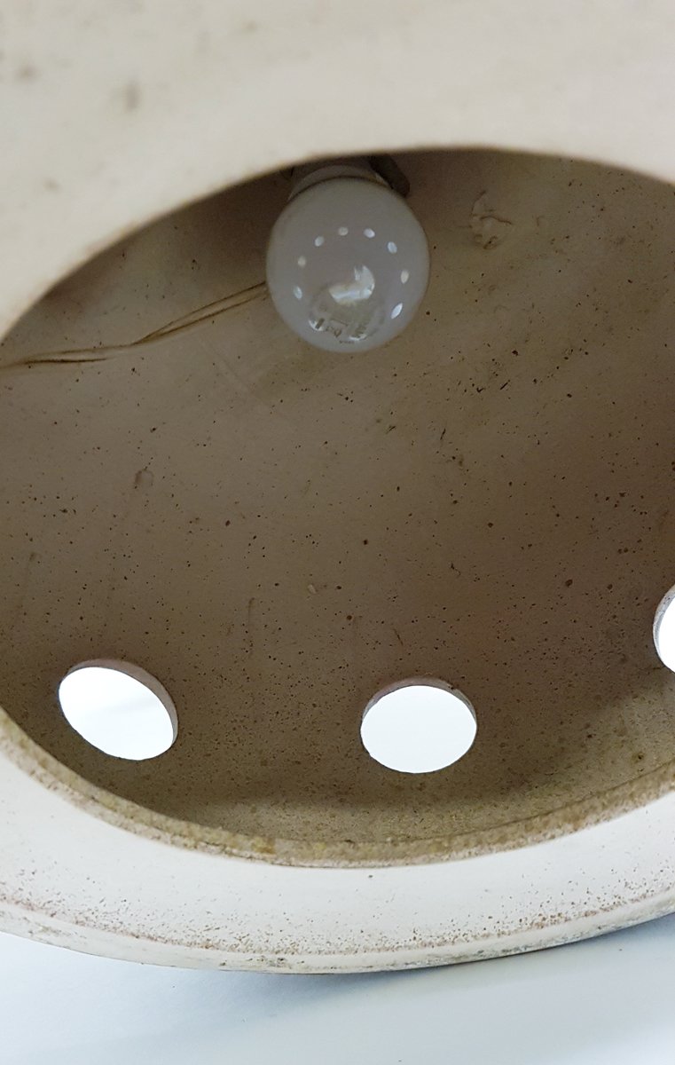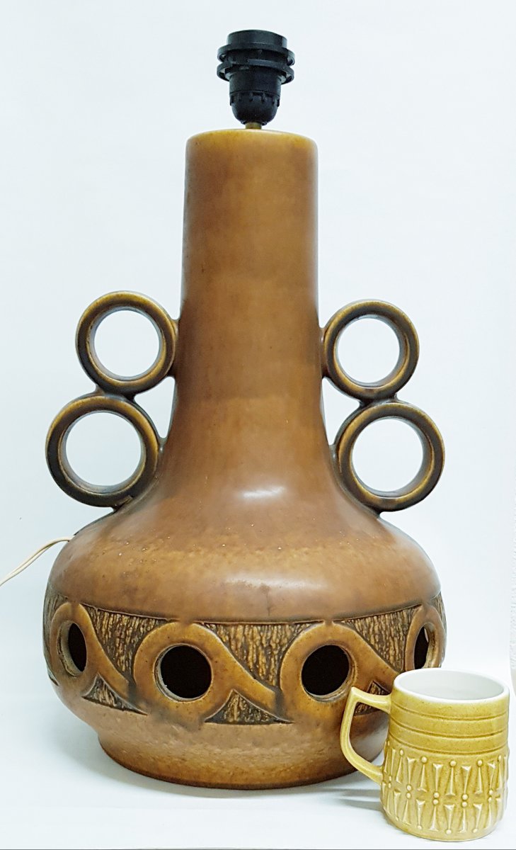 Grande lampada da tavolo o da terra in ceramica prodotta da Scheurich, Germania Ovest. Un pezzo di dimensioni impressionanti, alto 50 cm, la cui forma con 2 maniglie circolari è un classico della metà del secolo. È dotata di due punti luce, uno che illumina la base e l'altro che diffonde una luce d'atmosfera attraverso i fori della base. Questo modello di lampada era generalmente dotato di dettagli di smaltatura arancione sulla base, ma questa versione marrone neutro si adatta a tutti i colori e presenta alcuni dettagli strutturati e ombre di smaltatura. La finitura della vetratura è quasi opaca. Il cablaggio è originale e funziona ancora, con globi a 2 punte. Un pezzo classico e raro della Germania occidentale. Abbinato a un paralume alto, è un pezzo imponente e di grandi dimensioni per un tavolo o come lampada da terra.