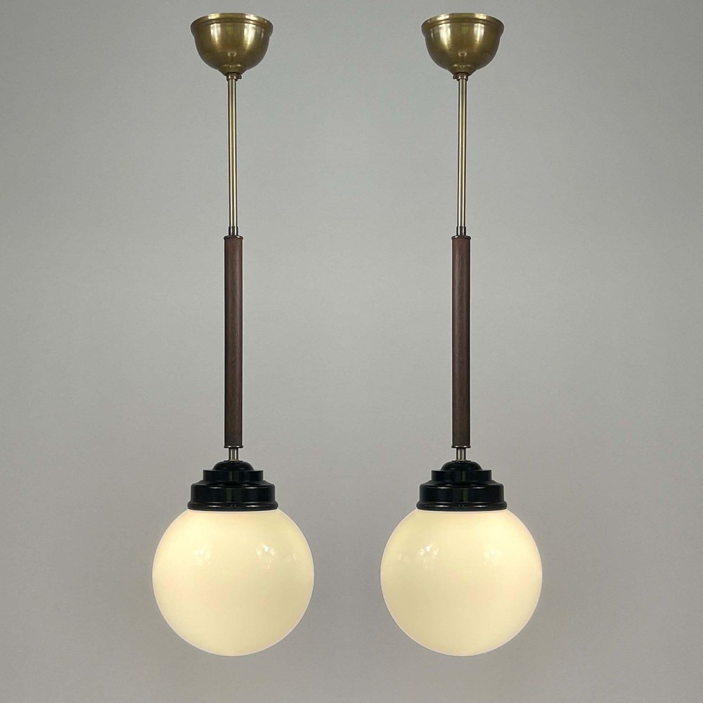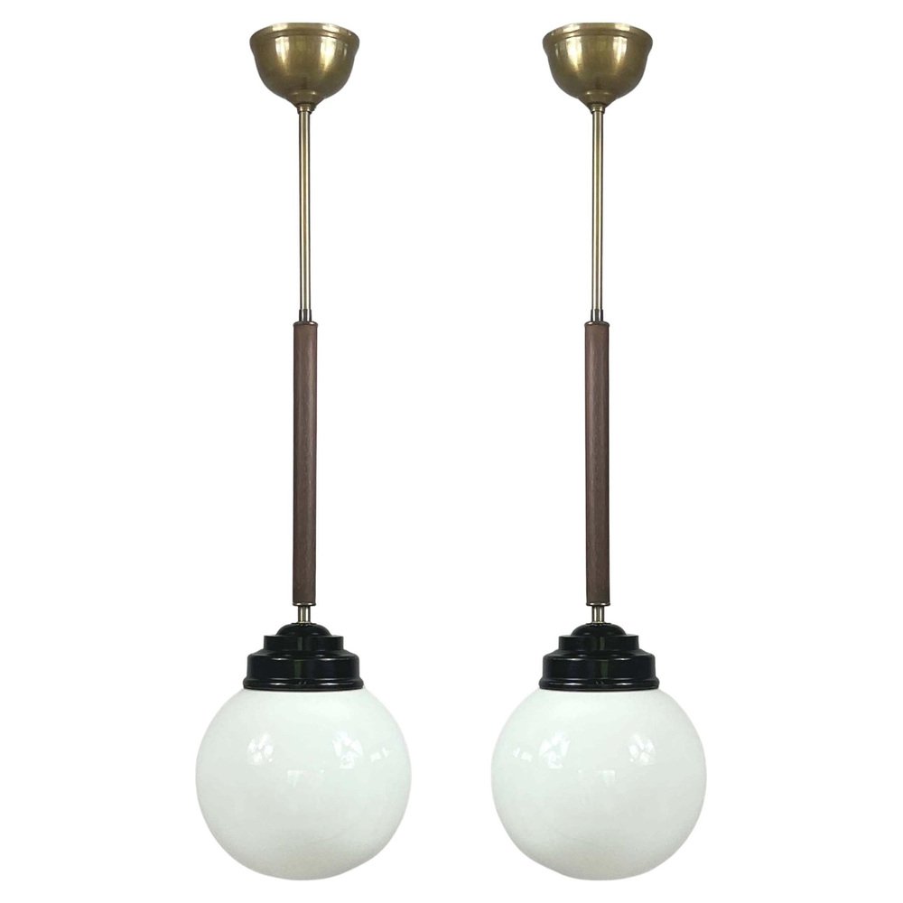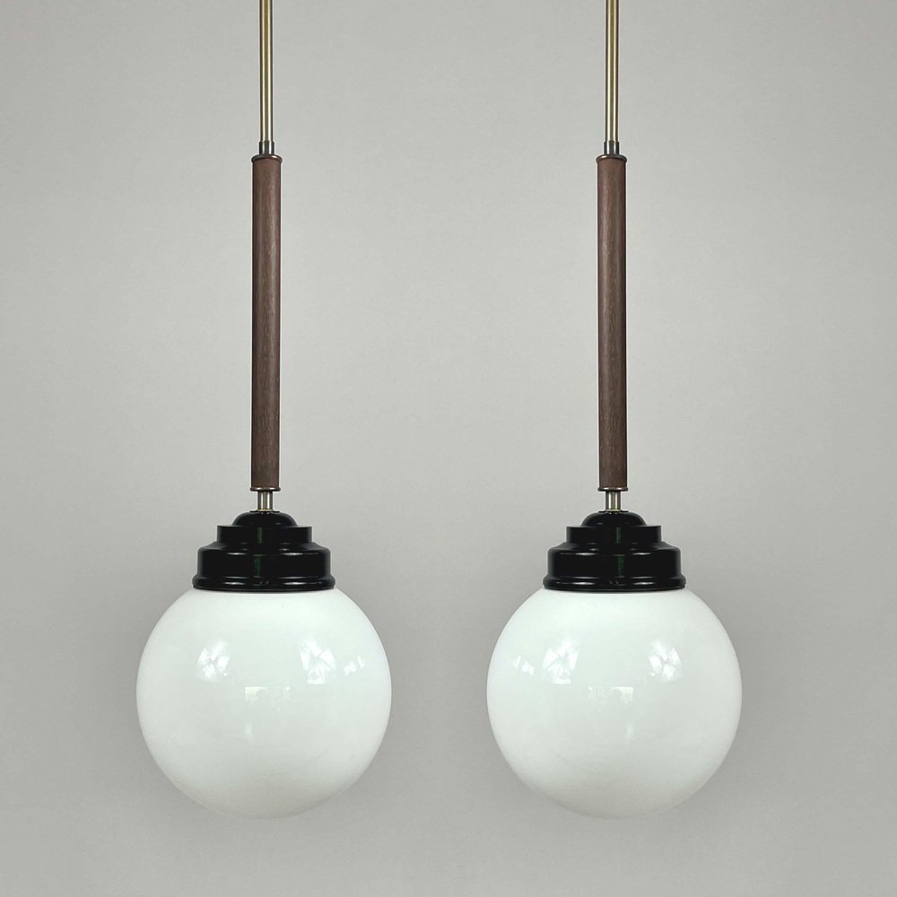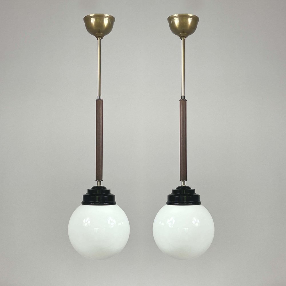 These industrial pendants were designed and manufactured in Sweden in the 1940s by Sieverts Kabelverk in Stockholm. The lights feature a pair of elegant 1940s Swedish pendants with a refined combination of materials and forms. Each pendant is suspended from a brass ceiling canopy with a slender brass rod, leading into a warm wooden stem that adds depth and contrast. The design transitions into a stepped black bakelite fitting, which holds a smooth, opaline glass globe shade. The globes provide a soft, diffused light, characteristic of industrial Scandinavian design. Overall, the pendants embody a balanced blend of brass, wood, and glass and bakelite, showcasing both functional simplicity and decorative sophistication typical of Swedish modernist lighting of the era. Sieverts Kabelverk was founded in 1888 by Max Sievert in Sundbyberg, Sweden, and grew into one of Europe’s largest cable and lighting manufacturers, supplying lighting and power and telecommunication cables. Acquired by LM Ericsson in 1928, it remained a key part of Swedish industry for decades before merging into Ericsson Cables in the 1980s. The business later became part of Hexatronic and NKT, and its legacy continues with modern production in Sweden. It played an important role in the development of Sundbyberg and left a lasting industrial heritage. Measurements: Total height 29.9" (76cm), diameter glass lampshade 7.9" (20cm), height glass lampshade 7.9" (20cm). Diameter canopy 4" (10cm). The length of the lamp rods are customizable. The lights require one E26/E27 bulb each. All lighting converted for US usage.
