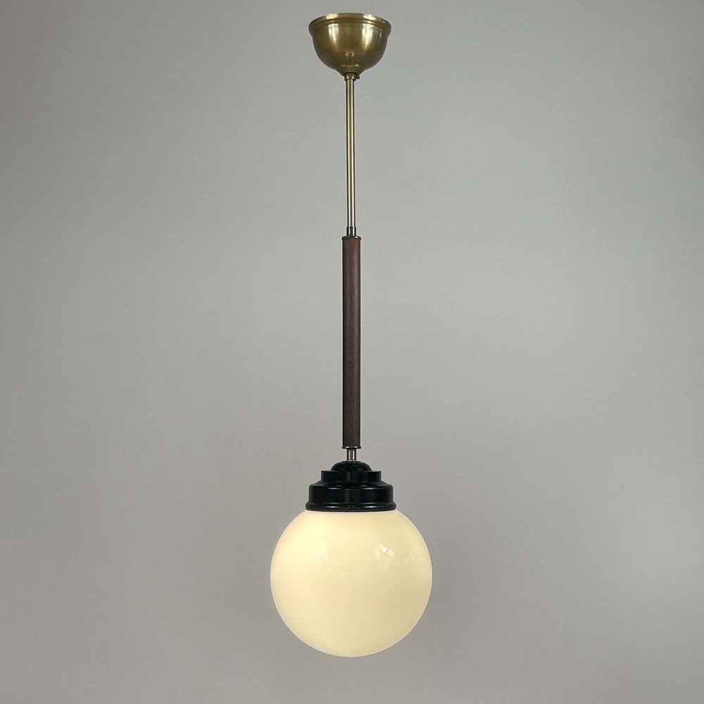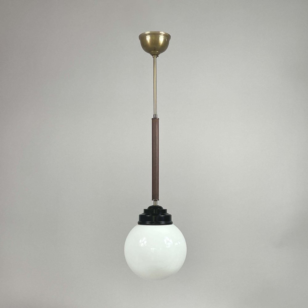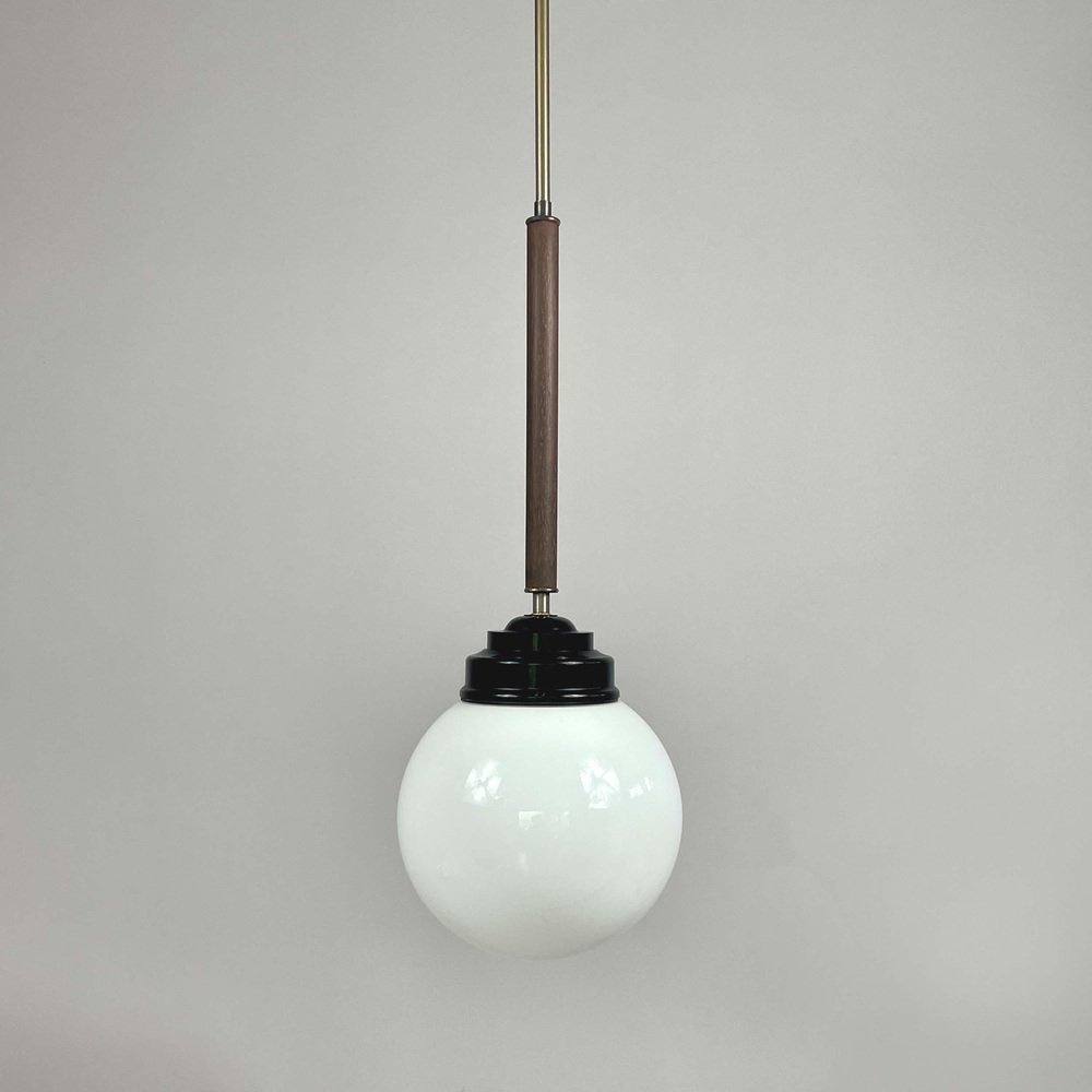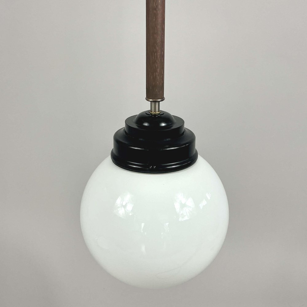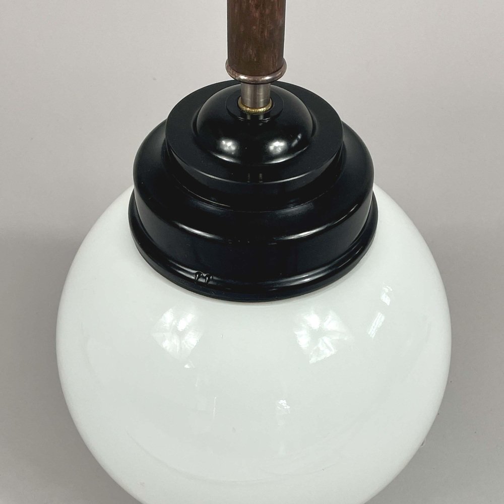 These industrial pendants were designed and manufactured in Sweden in the 1940s by Sieverts Kabelverk in Stockholm. The lights feature a pair of elegant 1940s Swedish pendants with a refined combination of materials and forms. Each pendant is suspended from a brass ceiling canopy with a slender brass rod, leading into a warm wooden stem that adds depth and contrast. The design transitions into a stepped black bakelite fitting, which holds a smooth, opaline glass globe shade. The globes provide a soft, diffused light, characteristic of industrial Scandinavian design. Overall, the pendants embody a balanced blend of brass, wood, and glass and bakelite, showcasing both functional simplicity and decorative sophistication typical of Swedish modernist lighting of the era. Sieverts Kabelverk was founded in 1888 by Max Sievert in Sundbyberg, Sweden, and grew into one of Europe’s largest cable and lighting manufacturers, supplying lighting and power and telecommunication cables. Acquired by LM Ericsson in 1928, it remained a key part of Swedish industry for decades before merging into Ericsson Cables in the 1980s. The business later became part of Hexatronic and NKT, and its legacy continues with modern production in Sweden. It played an important role in the development of Sundbyberg and left a lasting industrial heritage. Measurements: Total height 29.9" (76cm), diameter glass lampshade 7.9" (20cm), height glass lampshade 7.9" (20cm). Diameter canopy 4" (10cm). The length of the lamp rods are customizable. The lights require one E26/E27 bulb each. All lighting converted for US usage.