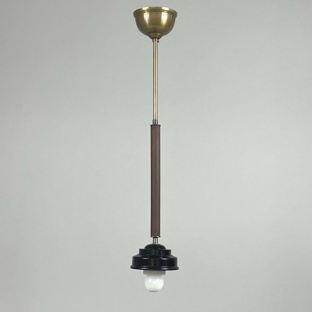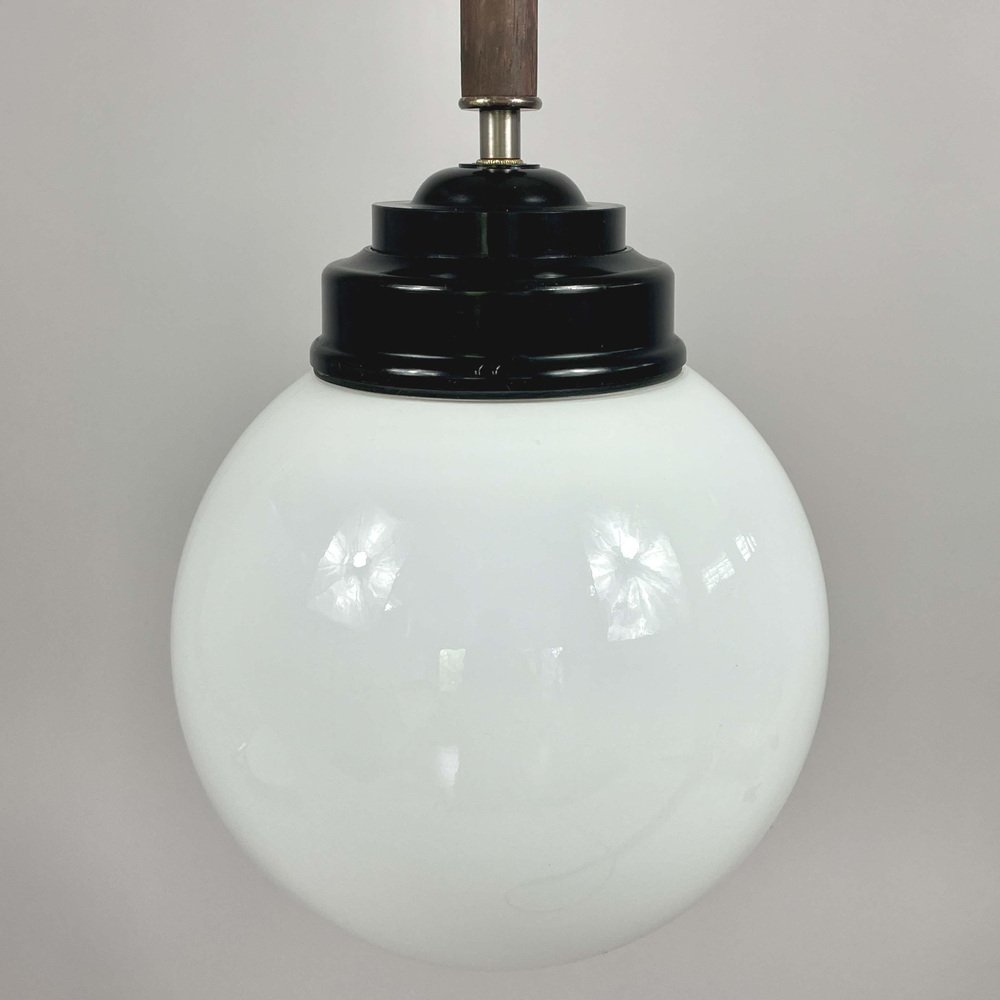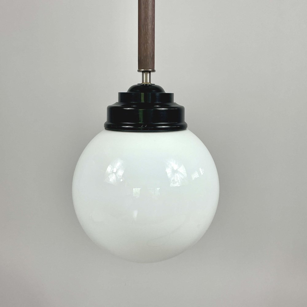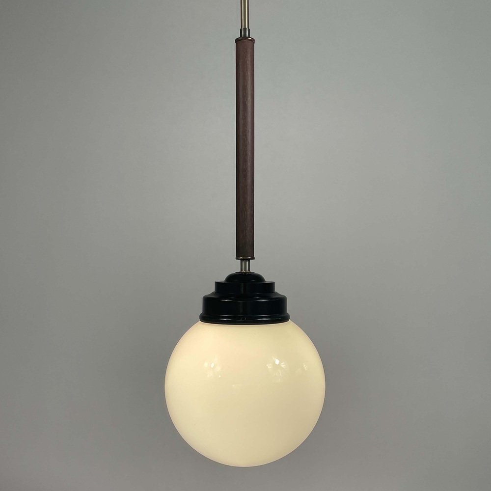 These industrial pendants were designed and manufactured in Sweden in the 1940s by Sieverts Kabelverk in Stockholm. The lights feature a pair of elegant 1940s Swedish pendants with a refined combination of materials and forms. Each pendant is suspended from a brass ceiling canopy with a slender brass rod, leading into a warm wooden stem that adds depth and contrast. The design transitions into a stepped black bakelite fitting, which holds a smooth, opaline glass globe shade. The globes provide a soft, diffused light, characteristic of industrial Scandinavian design. Overall, the pendants embody a balanced blend of brass, wood, and glass and bakelite, showcasing both functional simplicity and decorative sophistication typical of Swedish modernist lighting of the era. Sieverts Kabelverk was founded in 1888 by Max Sievert in Sundbyberg, Sweden, and grew into one of Europe’s largest cable and lighting manufacturers, supplying lighting and power and telecommunication cables. Acquired by LM Ericsson in 1928, it remained a key part of Swedish industry for decades before merging into Ericsson Cables in the 1980s. The business later became part of Hexatronic and NKT, and its legacy continues with modern production in Sweden. It played an important role in the development of Sundbyberg and left a lasting industrial heritage. Measurements: Total height 29.9" (76cm), diameter glass lampshade 7.9" (20cm), height glass lampshade 7.9" (20cm). Diameter canopy 4" (10cm). The length of the lamp rods are customizable. The lights require one E26/E27 bulb each. All lighting converted for US usage.