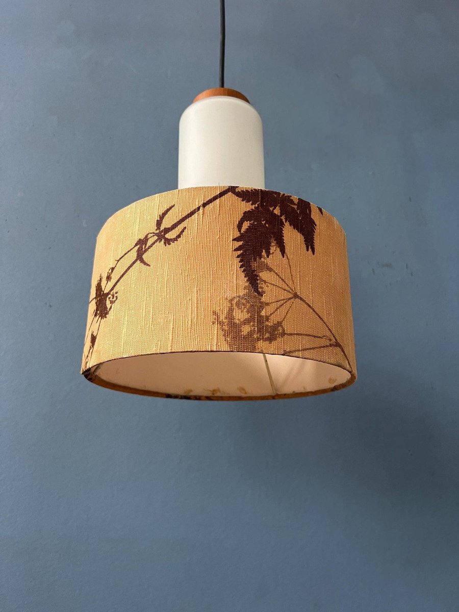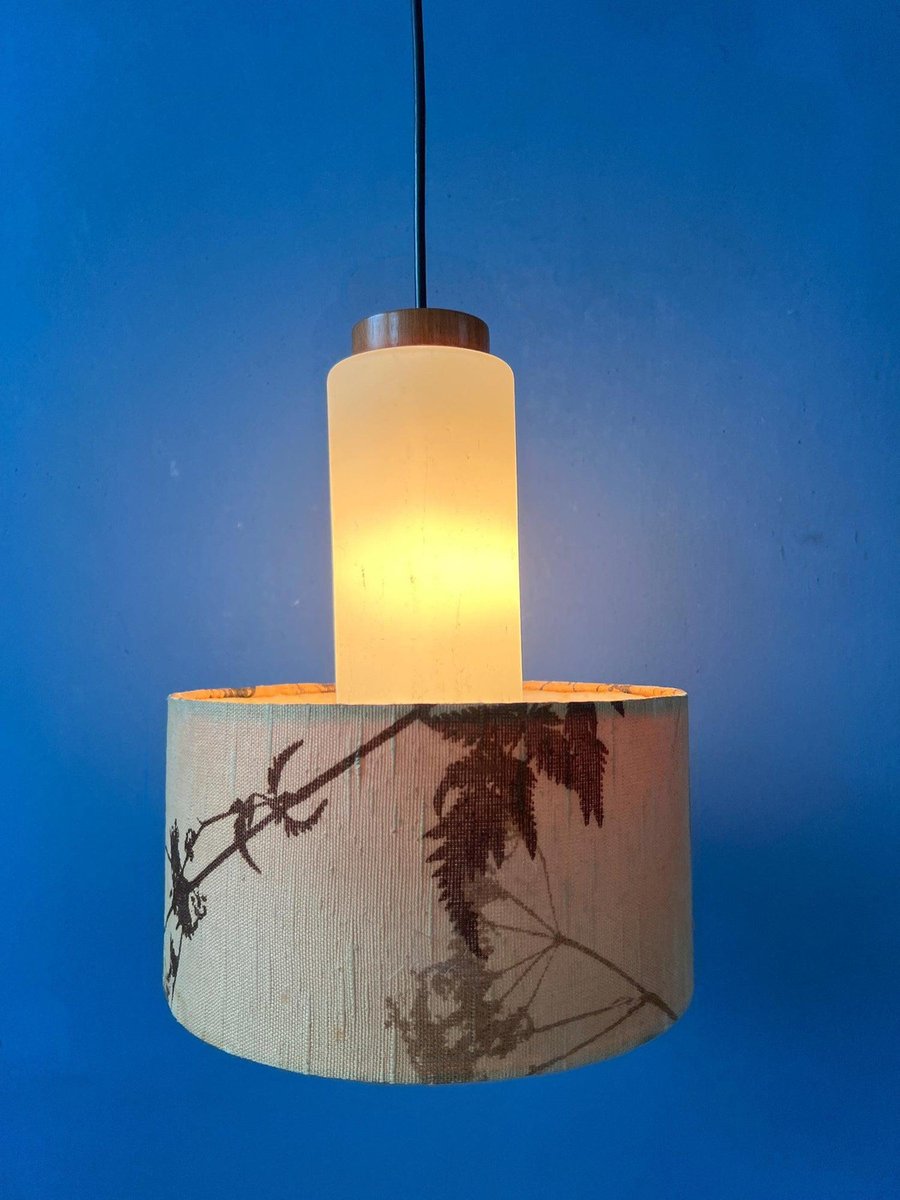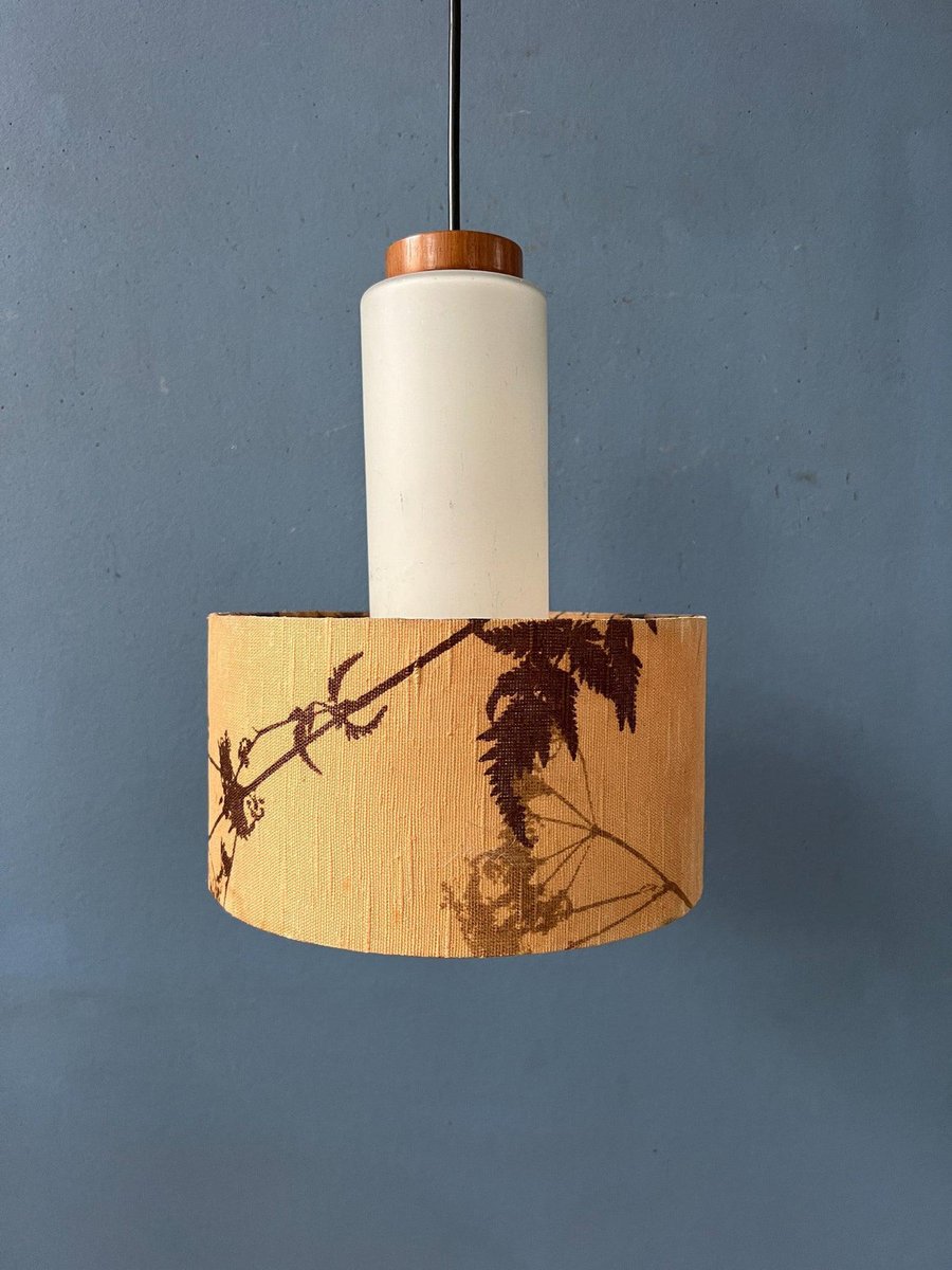 Lampada Mid-Century in vetro opalino con paralume in tessuto Jungle