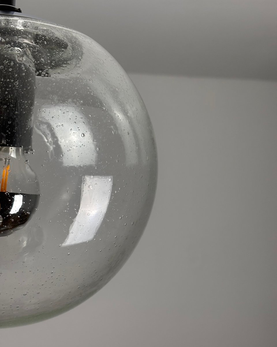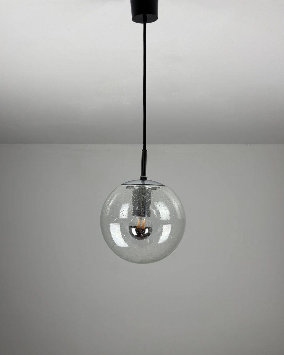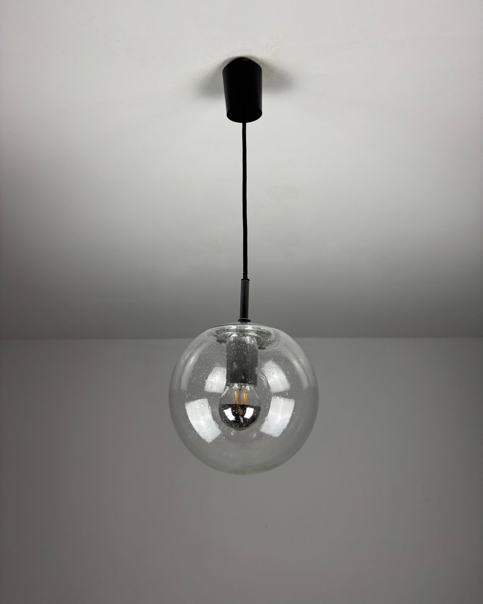 Questa intramontabile lampada a sospensione di Limburg è caratterizzata da una sfera in vetro trasparente soffiato a mano, che mette in mostra la maestria artigianale del marchio. Il paralume sferico diffonde dolcemente la luce mantenendo una silhouette pulita e architettonica. Esempio di design tedesco di metà secolo, porta l'adesivo originale del produttore come marchio di autenticità.