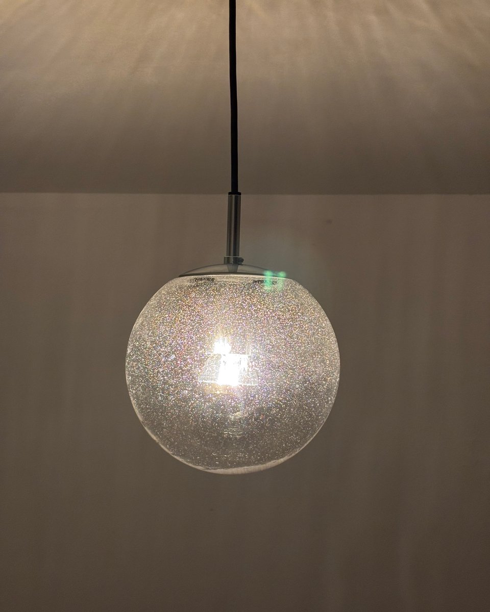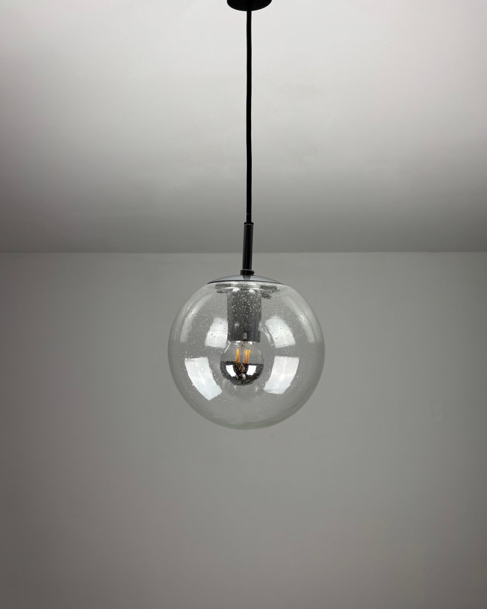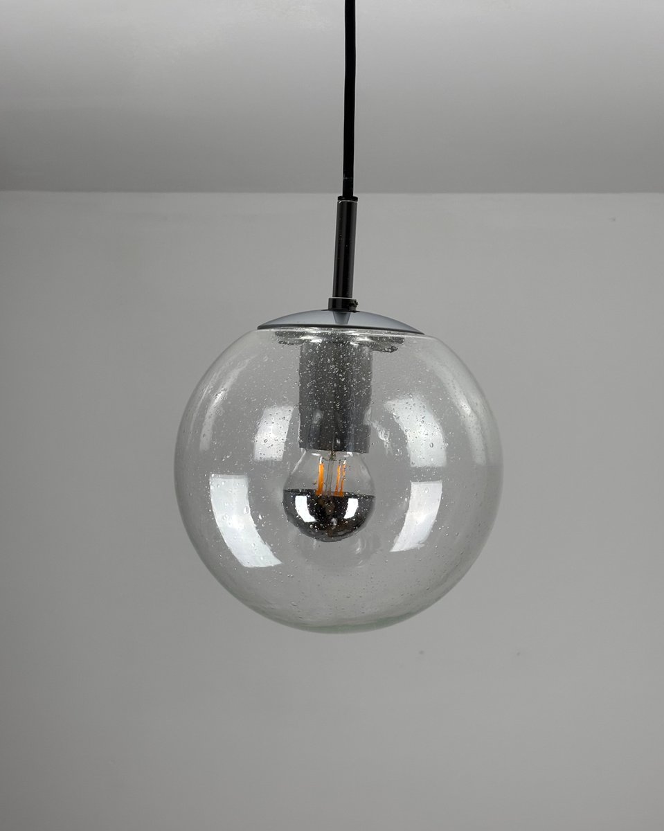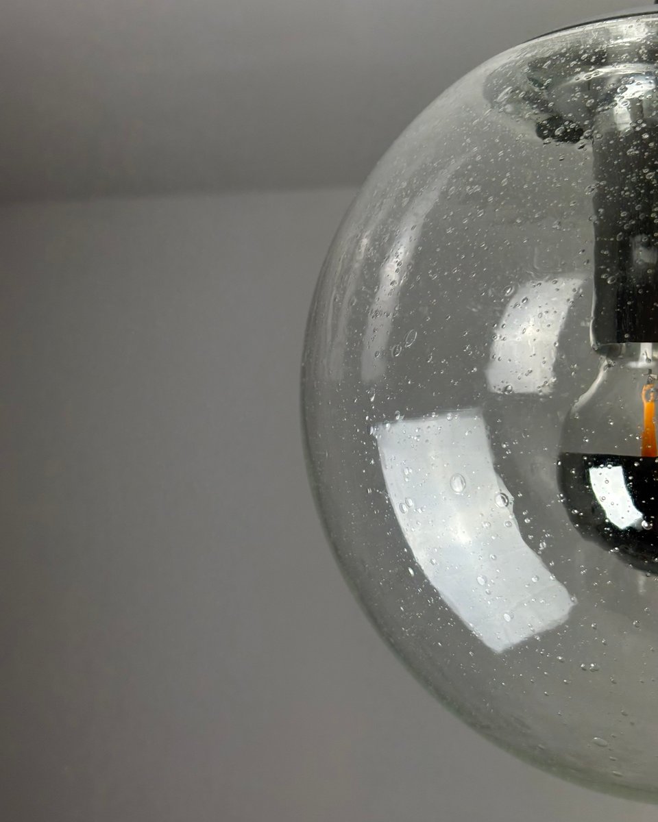Questa intramontabile lampada a sospensione di Limburg è caratterizzata da una sfera in vetro trasparente soffiato a mano, che mette in mostra la maestria artigianale del marchio. Il paralume sferico diffonde dolcemente la luce mantenendo una silhouette pulita e architettonica. Esempio di design tedesco di metà secolo, porta l'adesivo originale del produttore come marchio di autenticità.