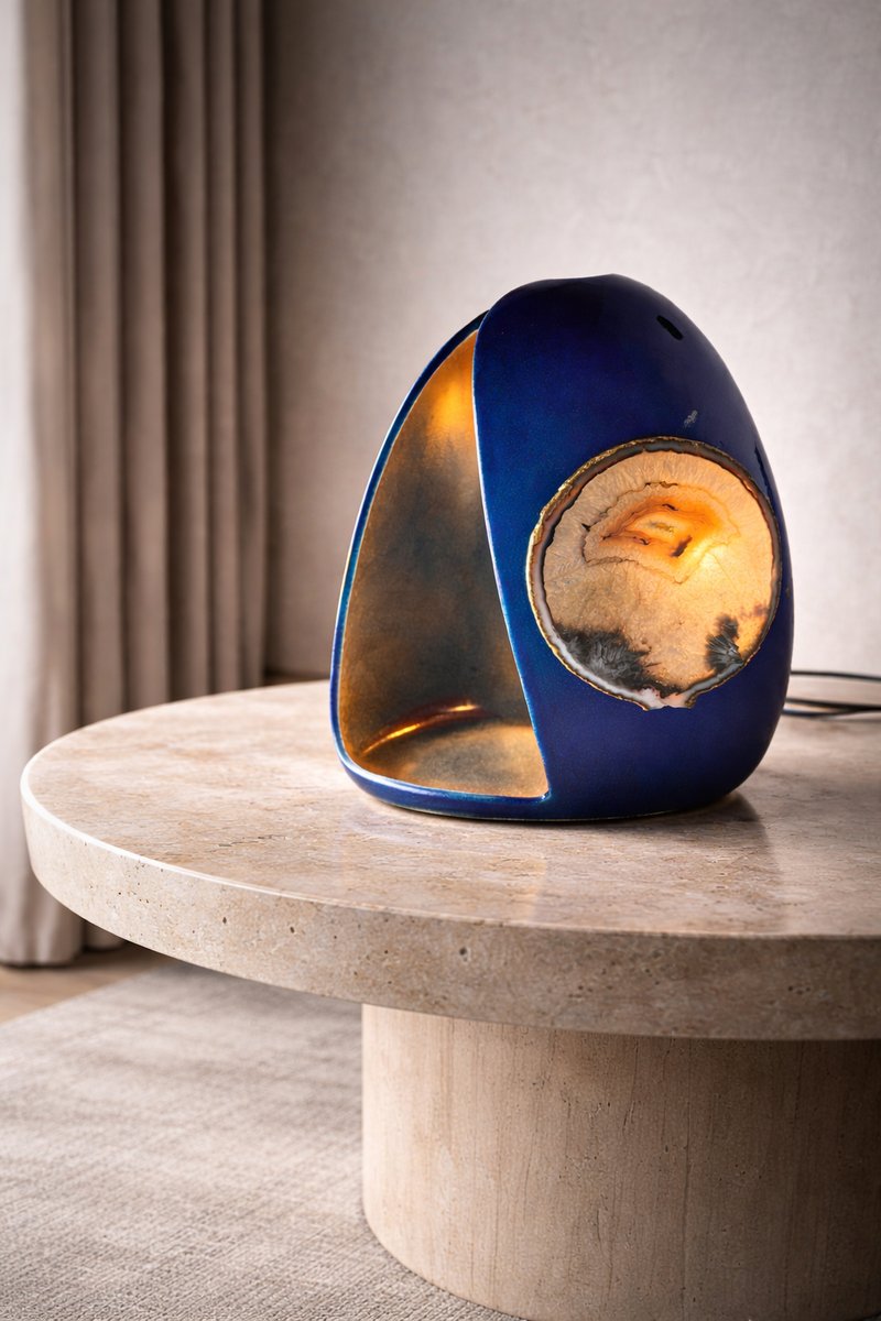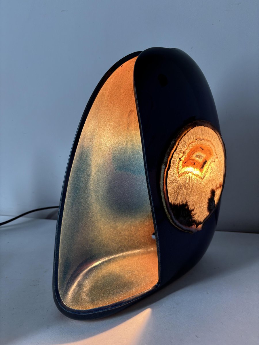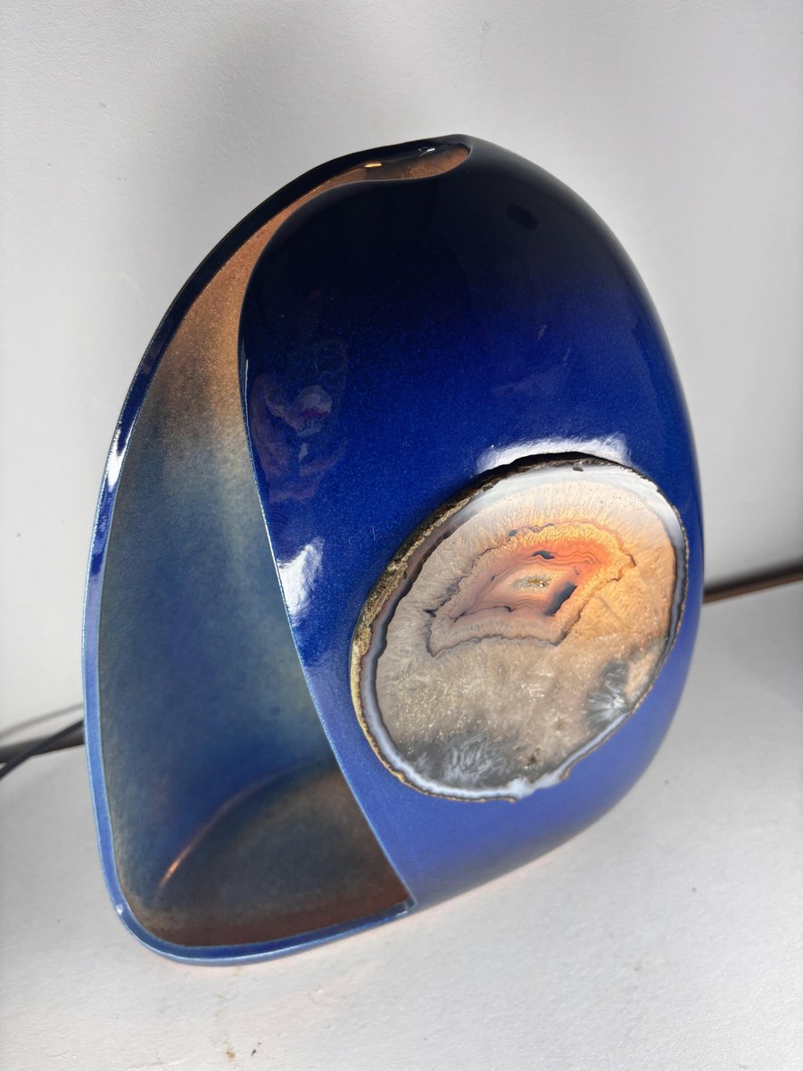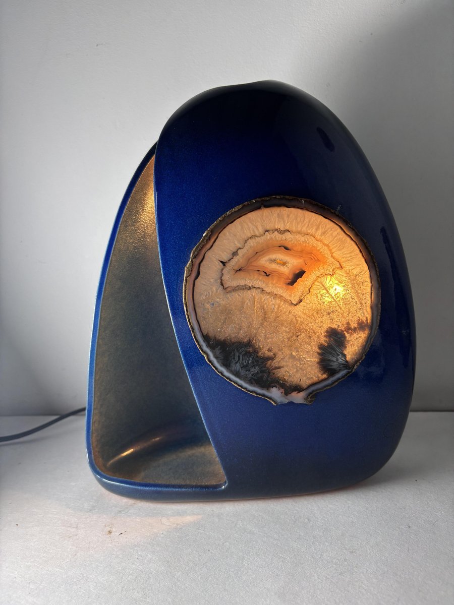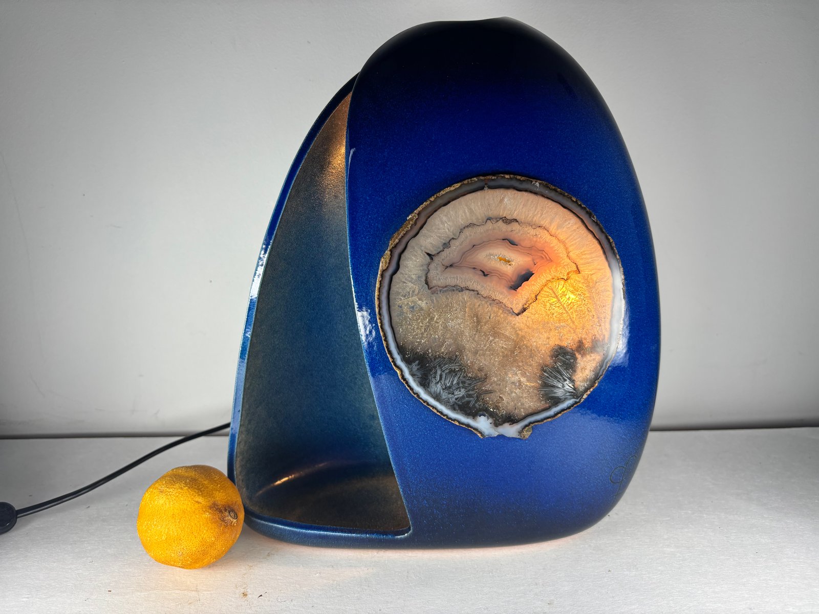 The ceramic body features a deep blue gradient contrasted with warm terracotta tones inside. When illuminated, the agate slice emits a soft, mineral glow, creating a refined and atmospheric light. The lamp is signed CF, with signatures or monograms visible on the piece and beneath the base. Both functional and sculptural, this lamp works beautifully as an ambient light or statement object in modern, vintage or eclectic interiors.