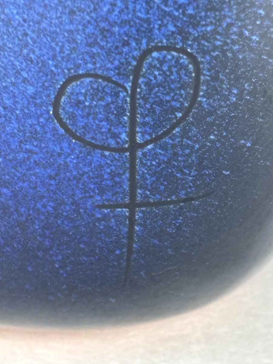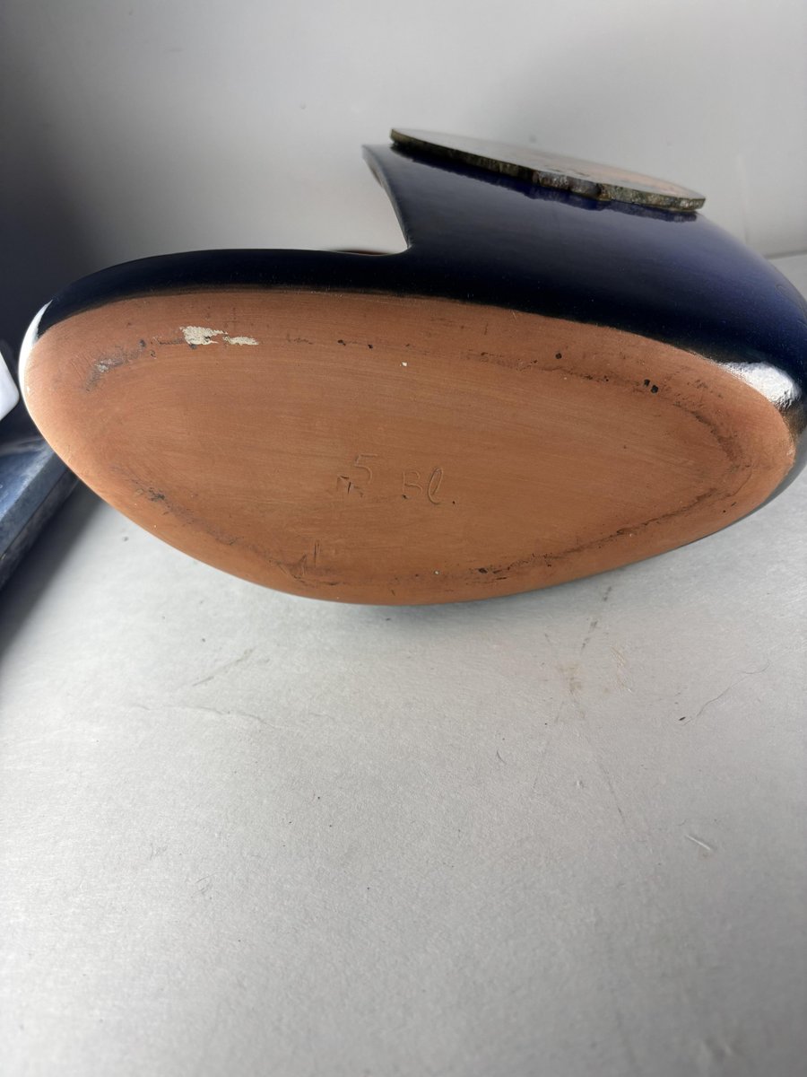 Il corpo in ceramica presenta una sfumatura blu intenso che contrasta con i toni caldi della terracotta all'interno. Quando è illuminata, la fetta di agata emette un bagliore morbido e minerale, creando una luce raffinata e suggestiva. La lampada è firmata CF, con firme o monogrammi visibili sul pezzo e sotto la base. Funzionale e scultorea, questa lampada funziona magnificamente come luce d'ambiente o oggetto di tendenza in interni moderni, vintage o eclettici.