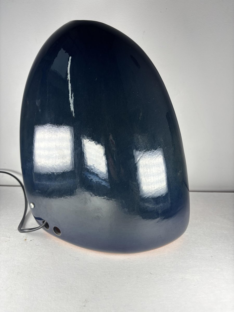La ceramica presenta una sfumatura blu intenso all'esterno, in contrasto con la finitura interna in terracotta. La fetta di agata, messa in risalto dall'illuminazione, diffonde una luce calda e minerale, creando un'atmosfera morbida e avvolgente. La lampada è firmata CF, con firme o monogrammi visibili sul pezzo e sotto la base. Sia come lampada che come oggetto scultoreo, questo pezzo si integra perfettamente in un interno contemporaneo, modernista o vintage.