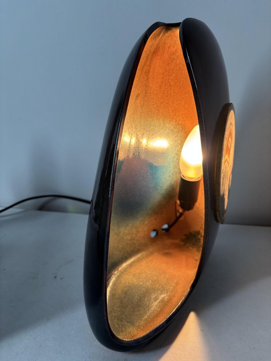 This sculptural ceramic lamp, dating from the 1970s–1980s, combines a free-form, organic shape with an integrated agate slice. This piece is distinguished by its expressive aesthetic and strong decorative impact, characteristic of late 20th-century artisanal and artistic creations.