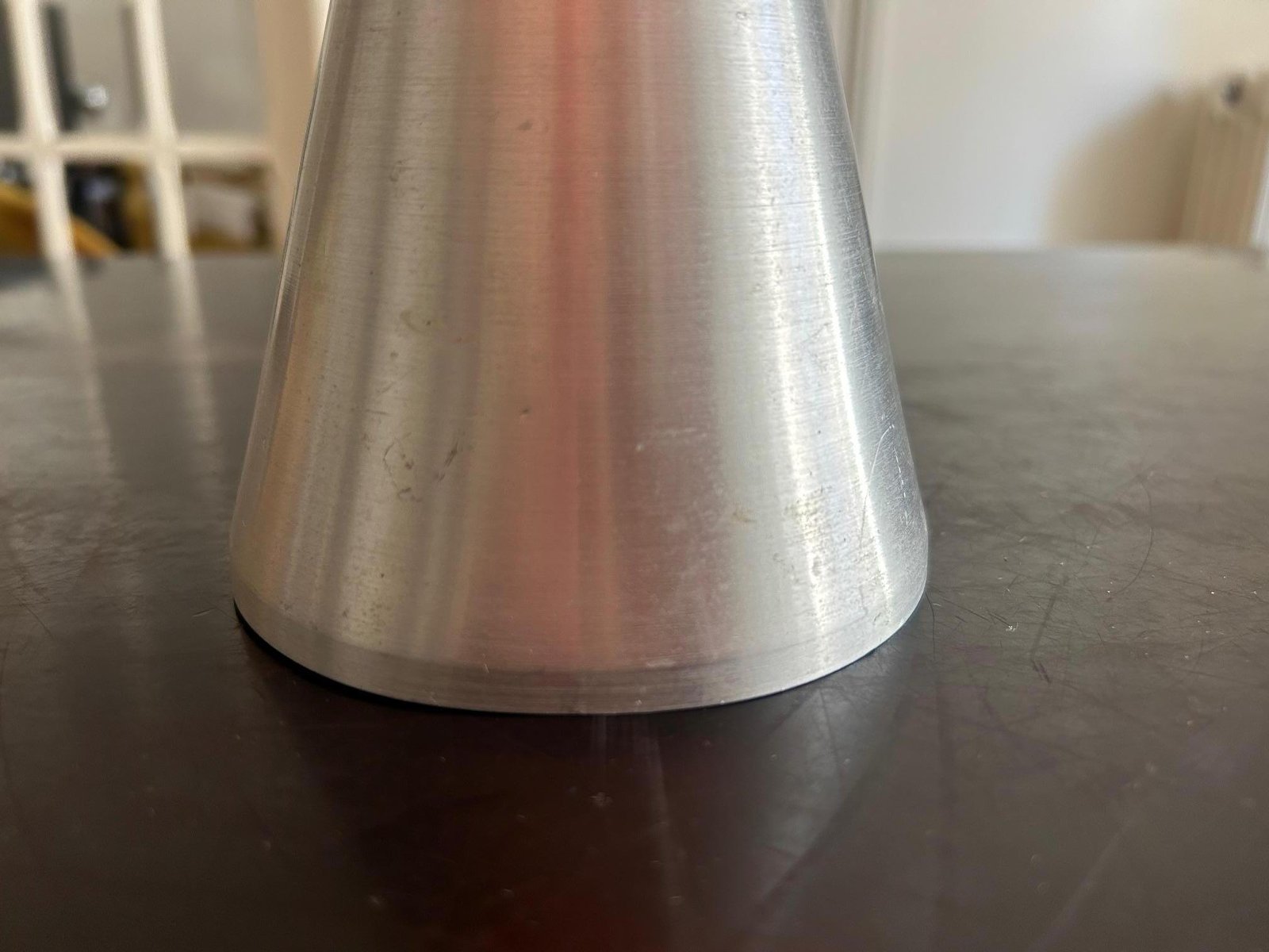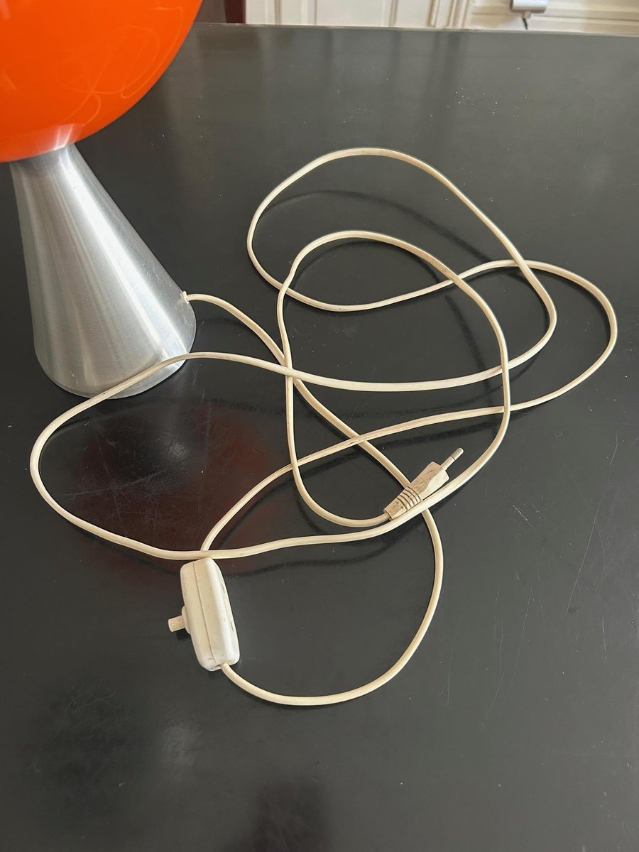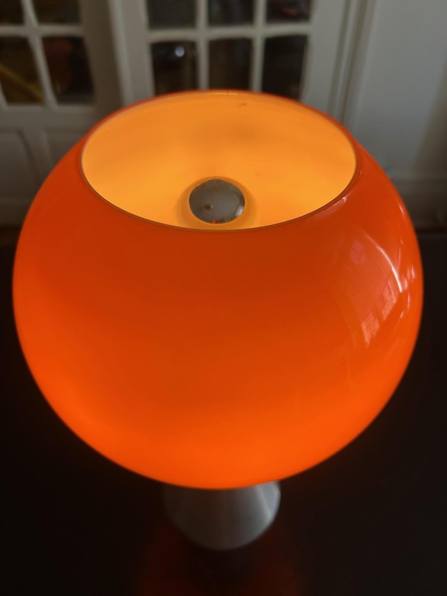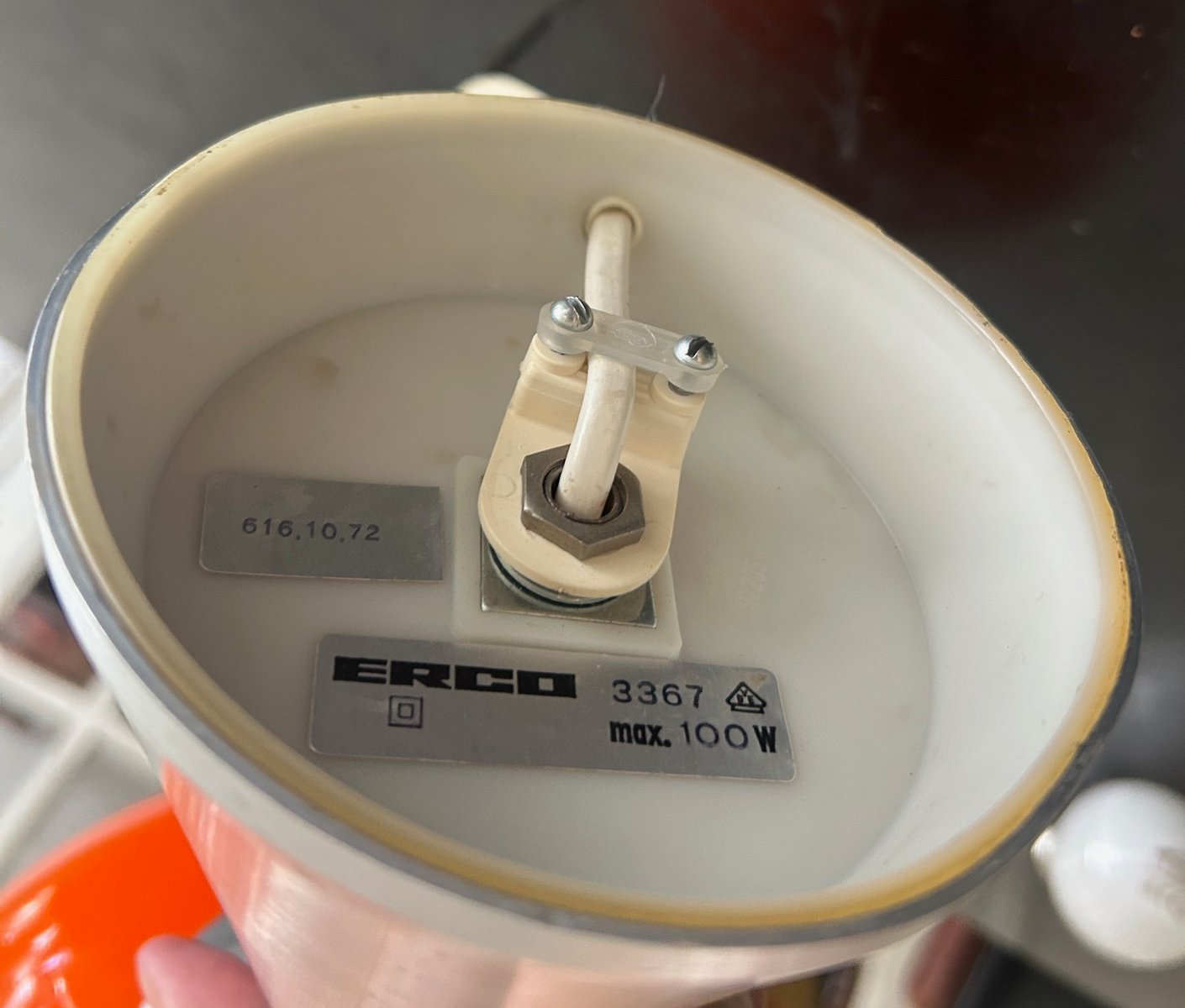 Elegante lampada vintage degli anni '70, prodotta da Erco, caratterizzata da un globo di vetro arancione che diffonde una luce calda e avvolgente, montato su una base in metallo spazzolato. Tipico design Space Age, che combina linee semplici e materiali contrastanti.