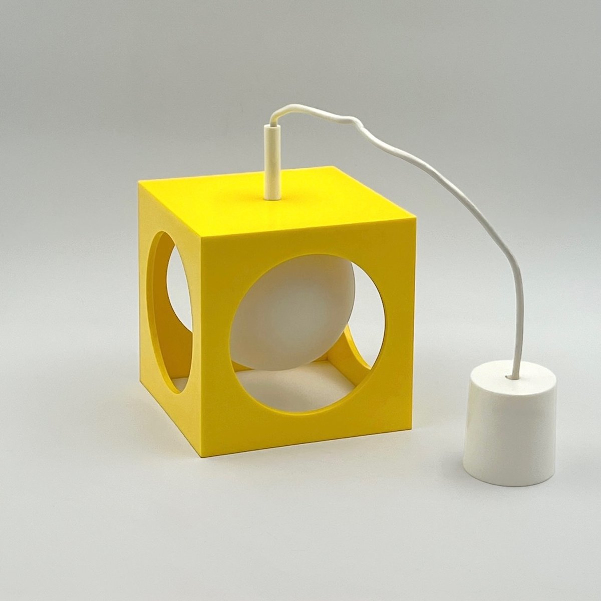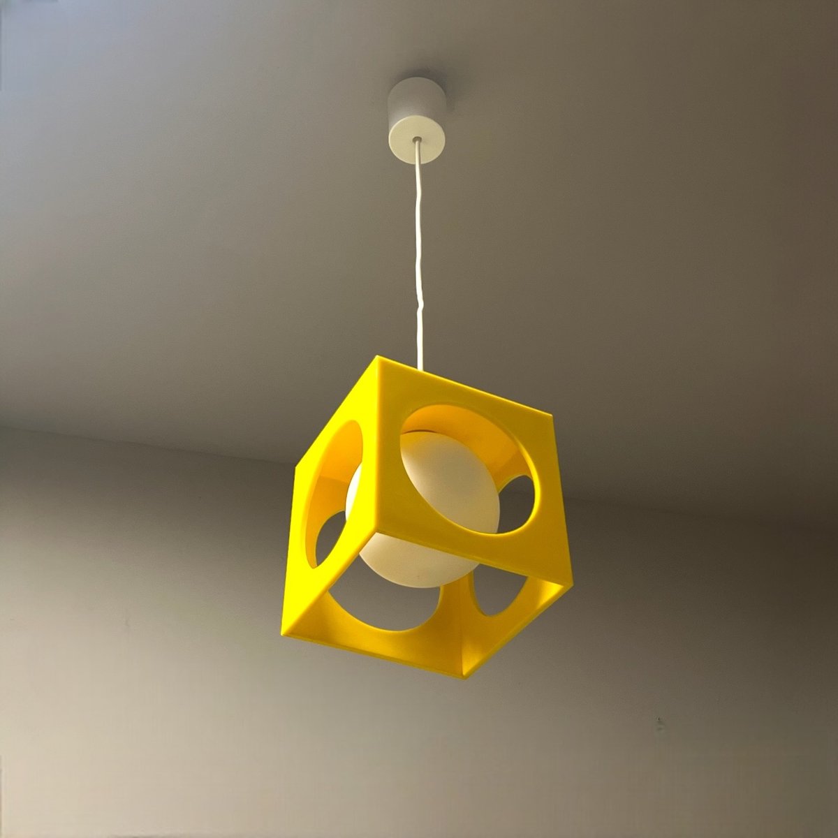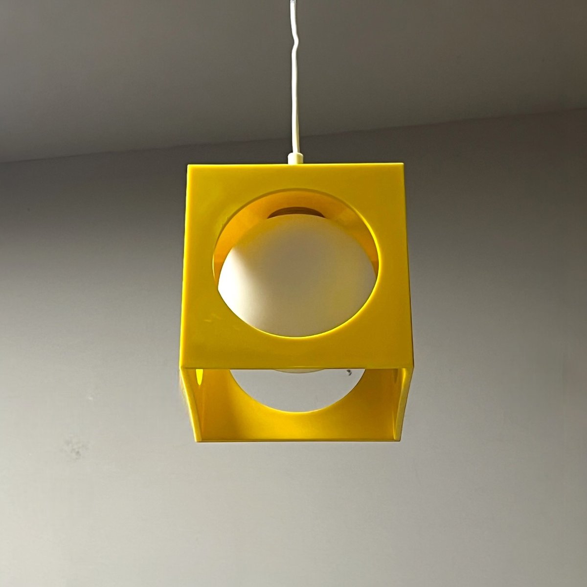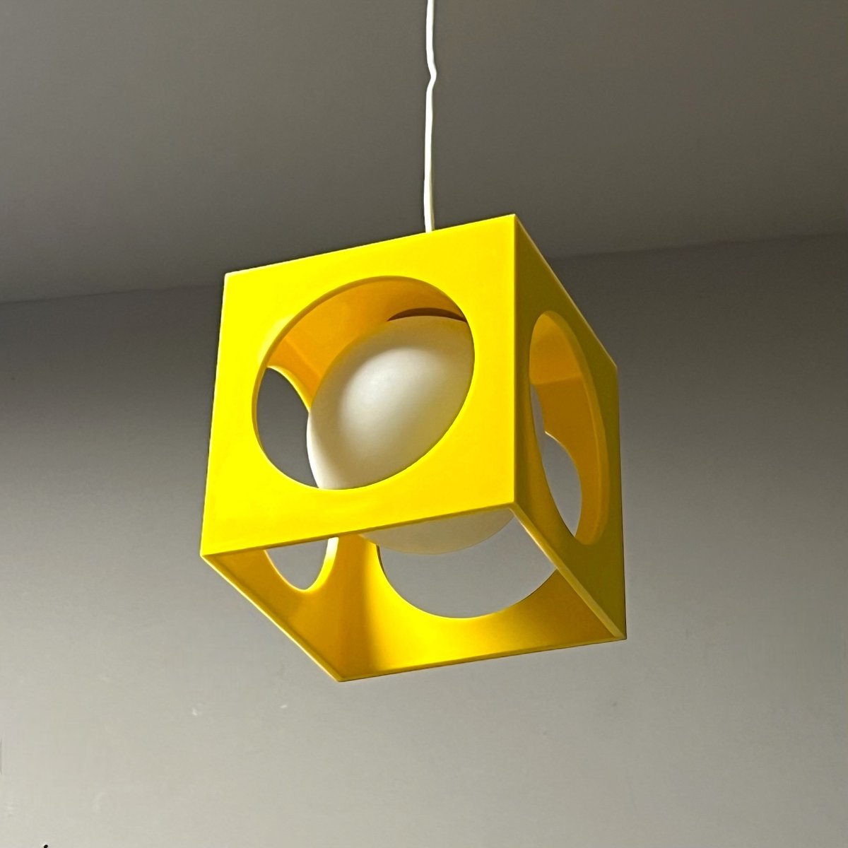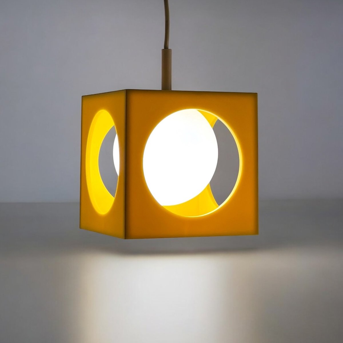 Illuminate your space with this striking space age lamp designed by Richard Essig Besigheim. This unique hanging lamp features a glossy yellow plastic cube with rounded holes, perfectly housing a sphere of opaline white glass. The combination of vibrant color, sleek shape, and innovative design creates a captivating visual effect that evokes the look of a flying saucer.