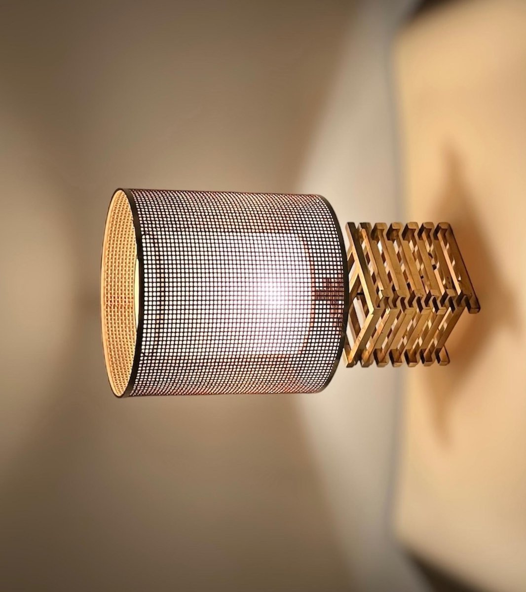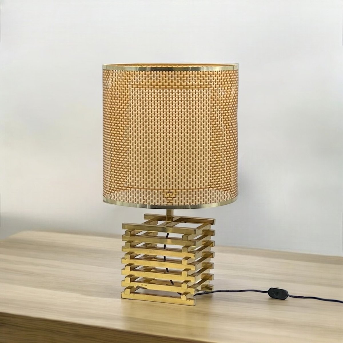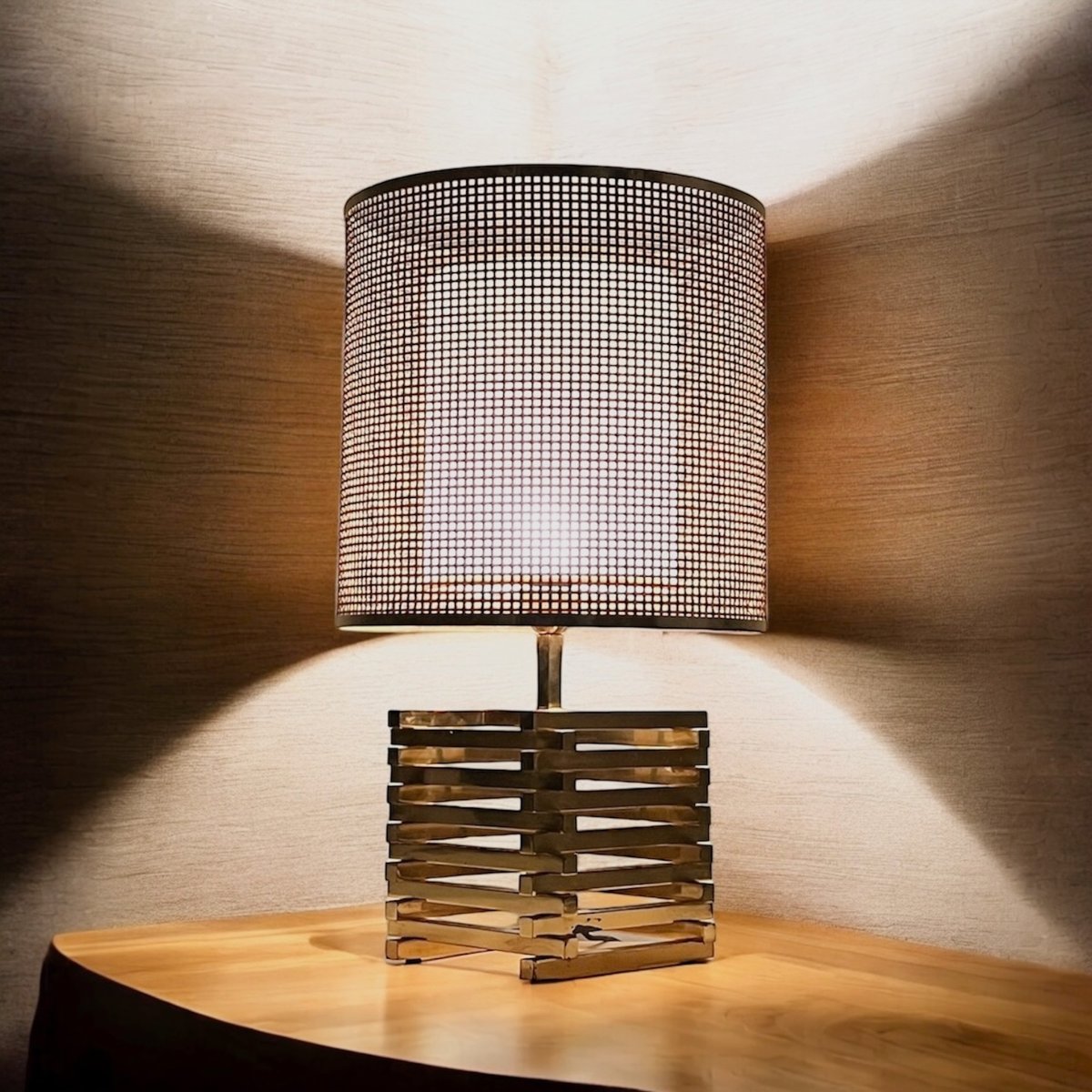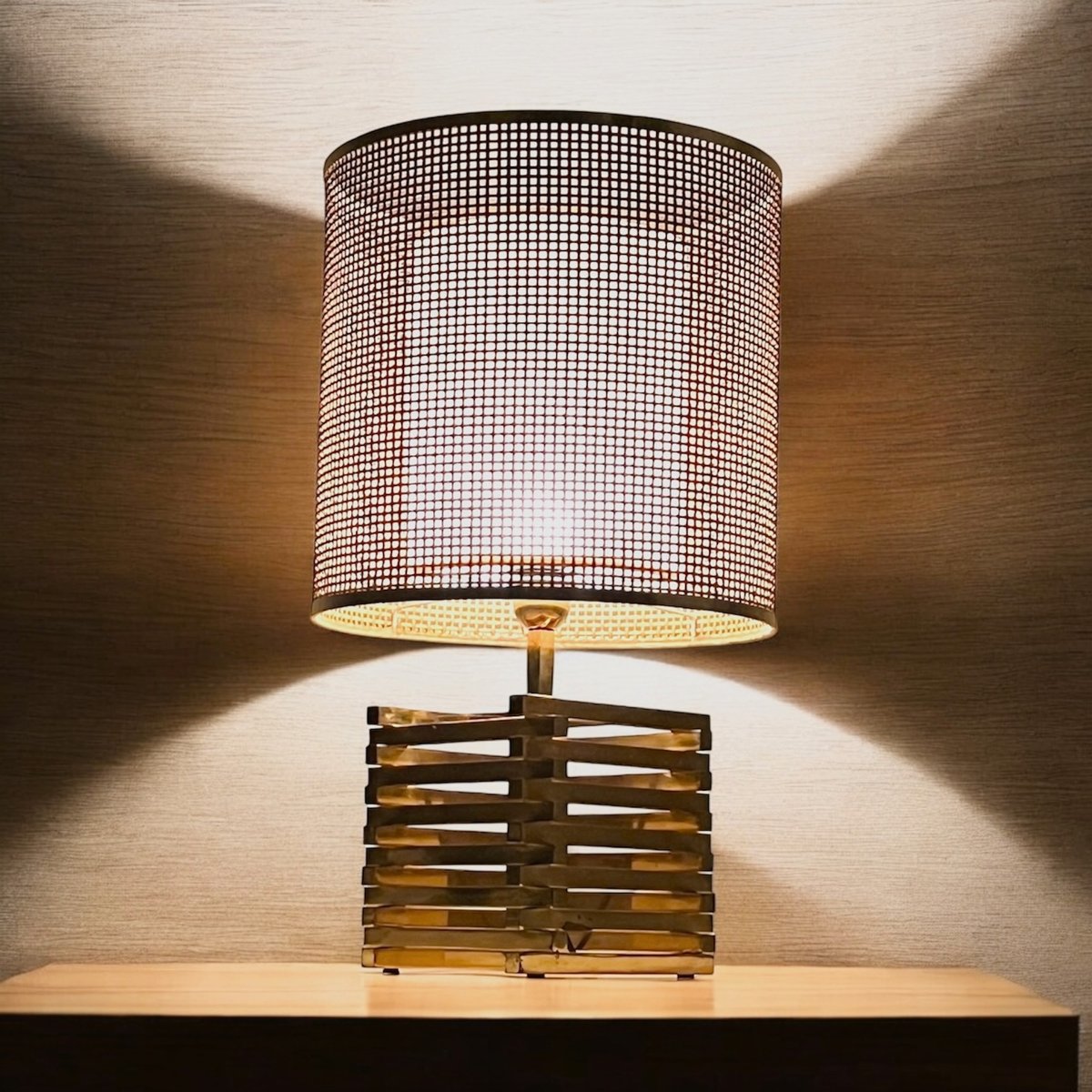 This handmade lamp is made of 28 interlocked brass bars that supports the bulb holder. The quality of materials is outstanding, typical of the maker.