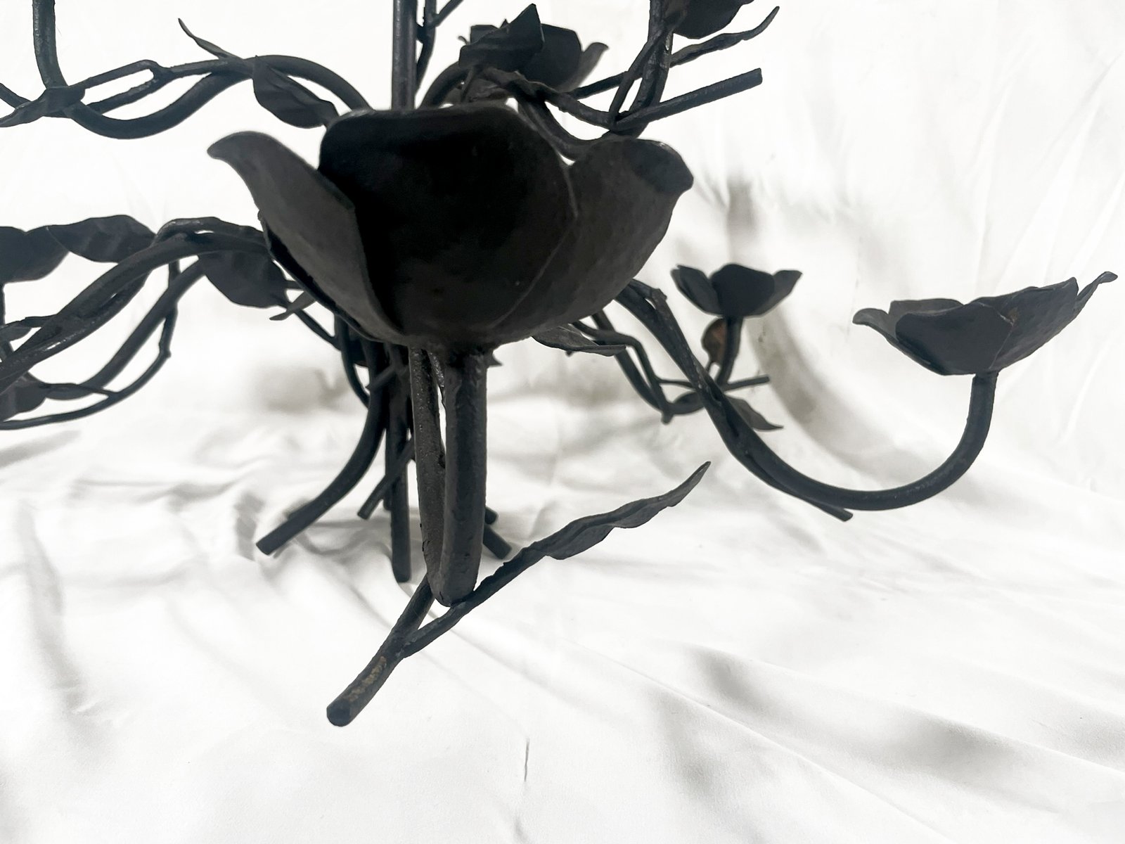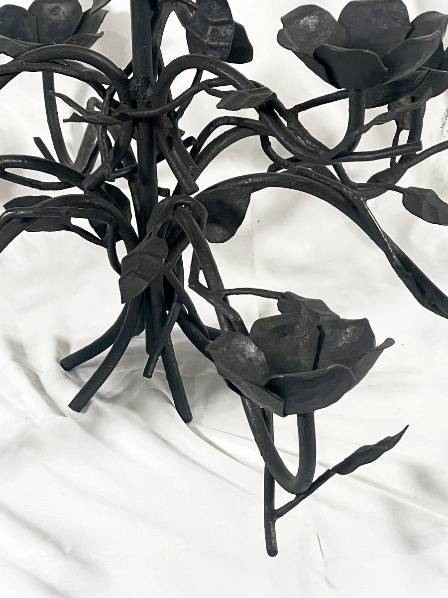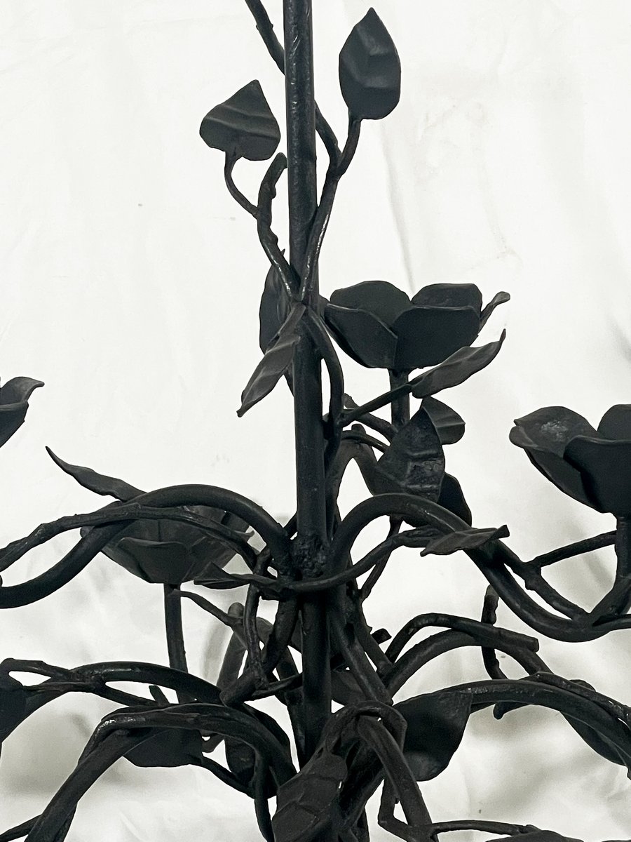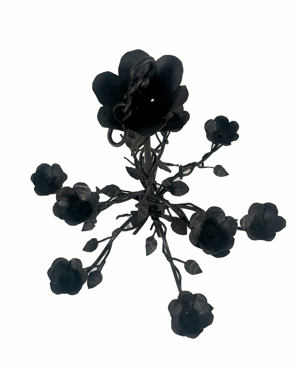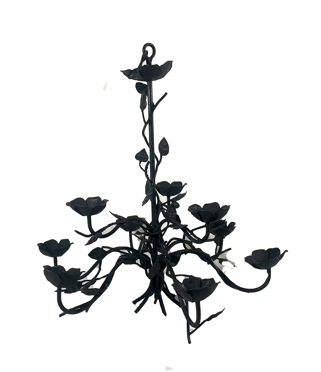 Wrought iron chandelier, handcrafted chandelier, Italian artisan lighting, floral chandelier, rustic chandelier, vintage iron lighting, 1990s lighting, decorative chandelier, hand-forged iron, Italian handmade lighting, sculptural chandelier, country chic lighting, non-electrified chandelier.