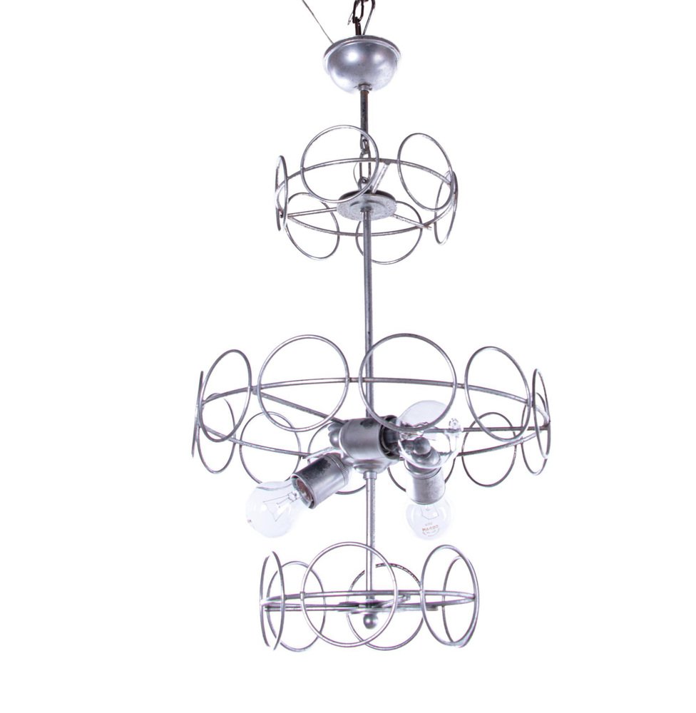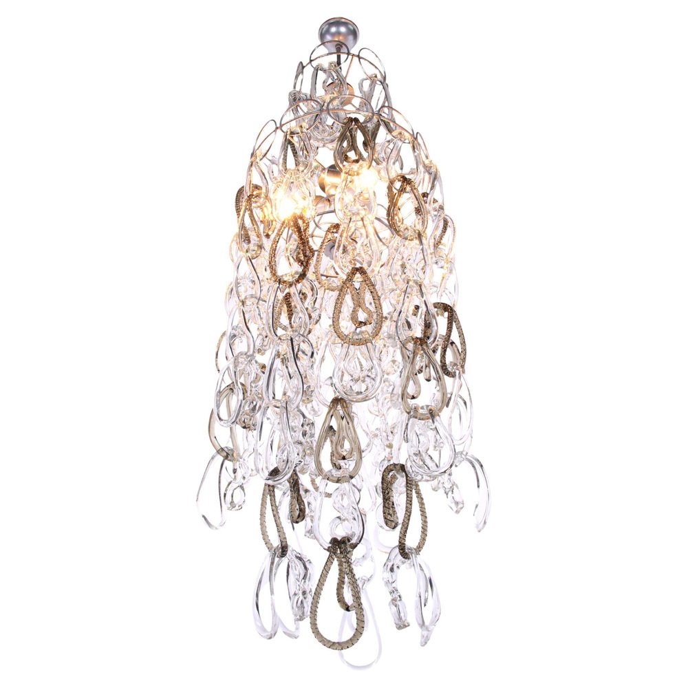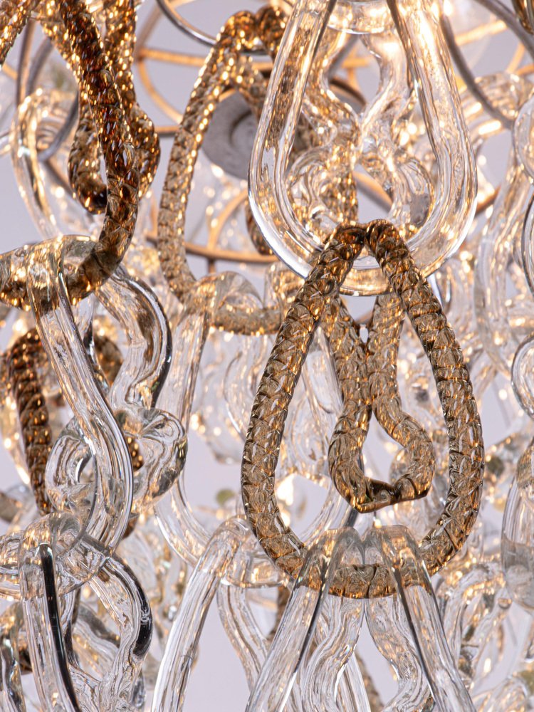 Imposing Giogali chandelier with numerous interlaced clear and amber Murano glasses on a metal frame. The 90 clear and 25 amber Murano glasses can be individually arranged, so that the chandelier can be adapted to different environments room heights according to your own ideas. Designed by Angelo Mangiarotti for Vistosi attr., Italy in the 1960s. Design: Angelo Mangiarotti. Style: Mid-Century Modern. Colours: clear and amber. Materials: Murano glass, metal. Rooms: study, entrance, dining room, loft and living room. Manufacturer: Vistosi attr. Country of origin: Italy. Dimensions: diameter approx. 15.75" in. (approx. 40 cm), height 51.2" in. (approx. 130 cm), frame 14.2" x 26" in. (36 x 65 cm). Glass parts: 90 in clear (+ 1 spare part) and 25 in amber. Lighting: three large Edison screw bulbs with E26/E27 bases for a single lamp rack. Wattage: we recommend up to 40w per bulb. Works on 220v as well as 110v. Ready to use worldwide. Condition: very good vintage condition: No imperfections the the glasses. Wiring: the lamp/s has been tested with US American light bulbs under 120v and works flawlessly, no tools or rewiring required. All our goods are originally wired for 220v. Delivery without bulbs.