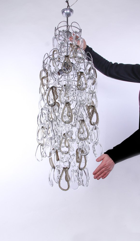 Imponente lampadario Giogali con numerosi vetri di Murano trasparenti e ambrati intrecciati su una struttura metallica. I 90 vetri trasparenti e i 25 vetri ambrati di Murano possono essere disposti individualmente, in modo da poter adattare il lampadario a diverse altezze di ambienti secondo le proprie idee. Progettato da Angelo Mangiarotti per Vistosi attr., Italia, negli anni '60. Design: Angelo Mangiarotti. Stile: Moderno di metà secolo. Colori: chiaro e ambra. Materiali: Vetro di Murano, metallo. Ambienti: studio, ingresso, sala da pranzo, loft e soggiorno. Produttore: Vistosi attr. Paese di origine: Italia. Dimensioni: diametro circa 40 cm, altezza circa 130 cm, struttura 36 x 65 cm. Parti in vetro: 90 trasparenti (+ 1 pezzo di ricambio) e 25 ambrate. Illuminazione: tre grandi lampadine a vite Edison con attacco E26/E27 per un unico portalampada. Potenza: si consiglia un massimo di 40w per lampadina. Funziona sia a 220v che a 110v. Pronto per l'uso in tutto il mondo. Condizioni: ottime condizioni vintage: Nessuna imperfezione sui vetri. Cablaggio: la lampada/e è stata testata con lampadine americane a 120v e funziona perfettamente, senza bisogno di attrezzi o di ricablaggio. Tutti i nostri prodotti sono originariamente cablati per 220v. Consegna senza lampadine.