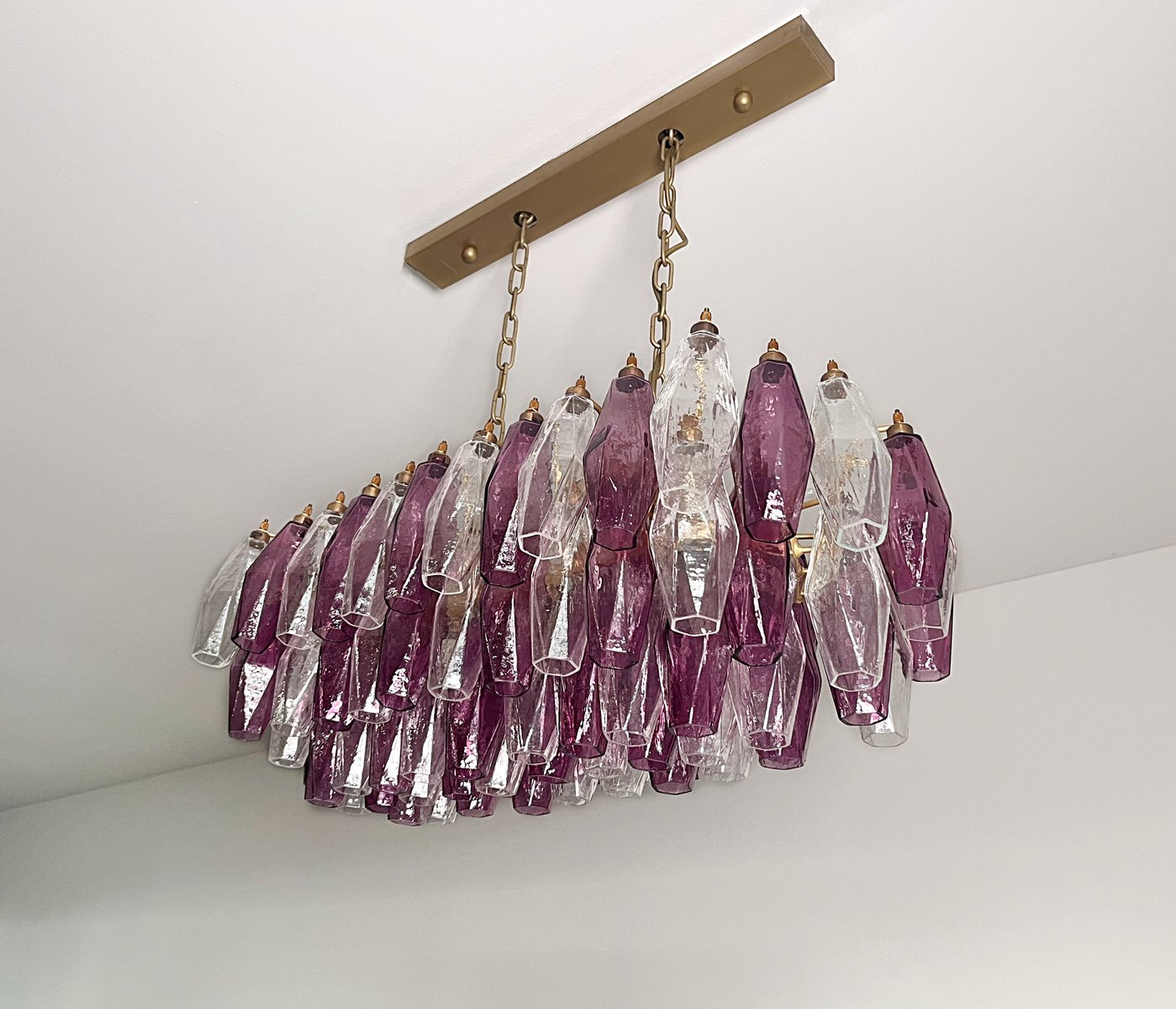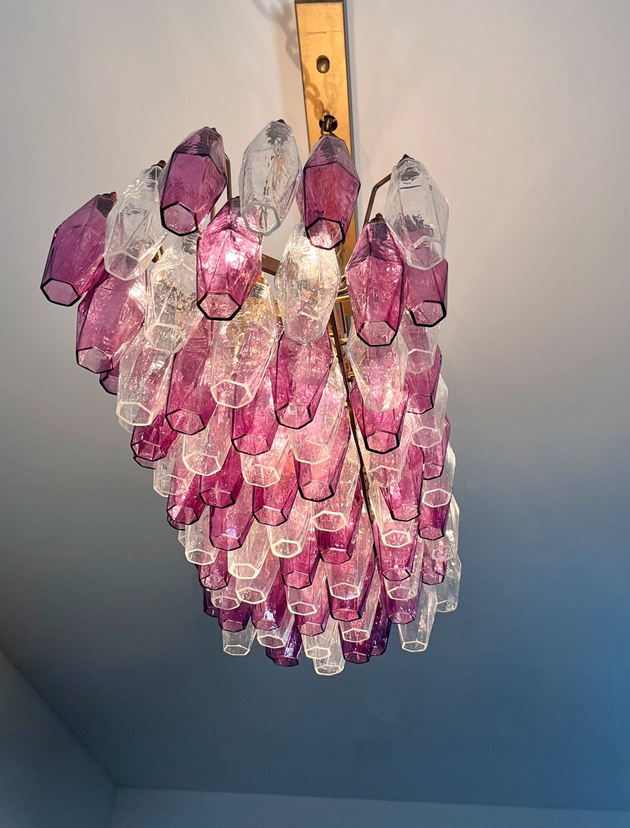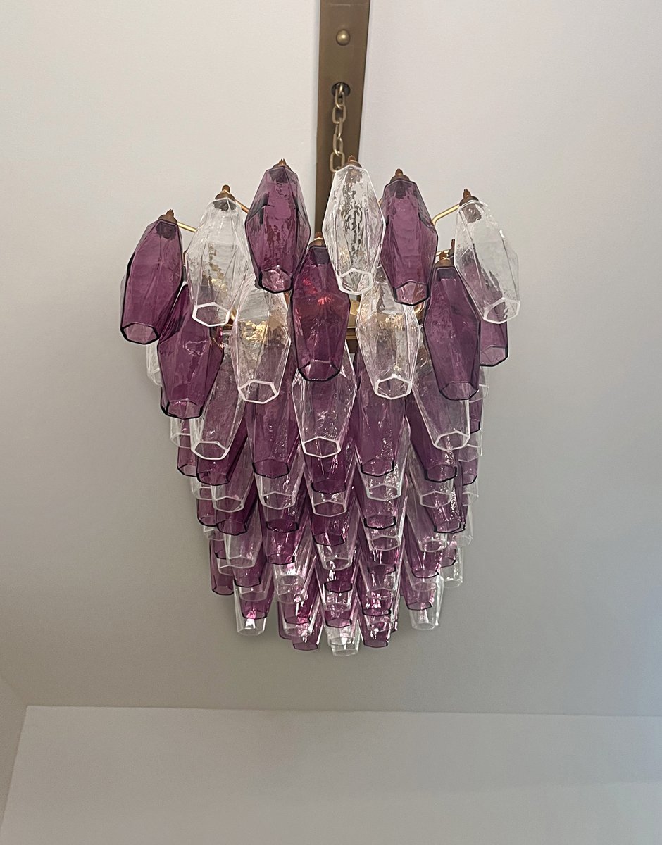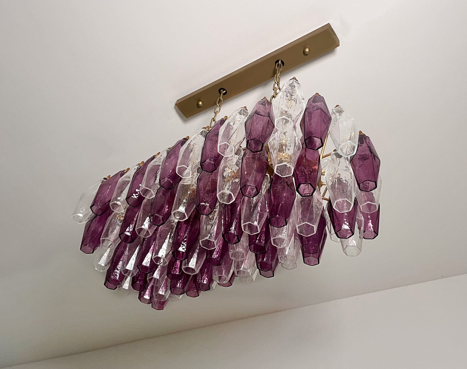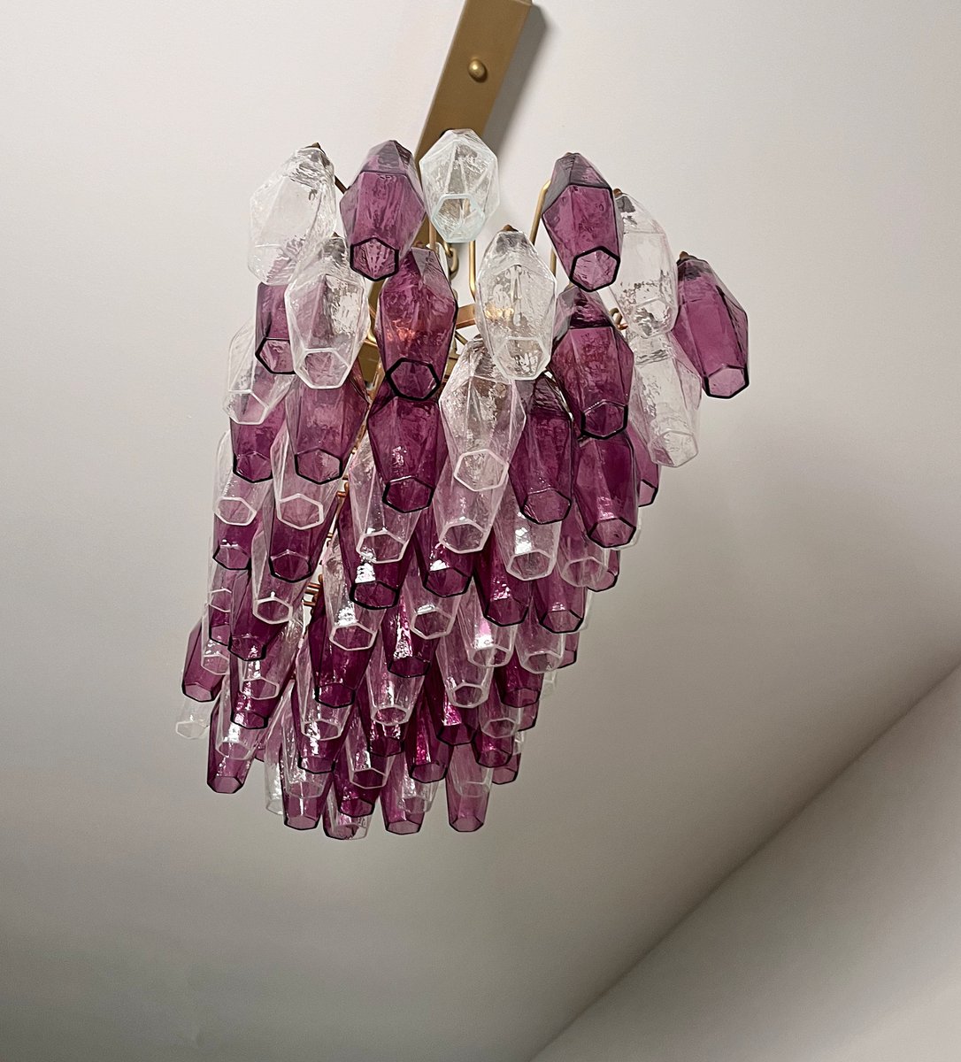 Elegante lampadario italiano realizzato con 84 splendidi vetri di Murano ametista e trasparente "poliedri". Struttura in metallo color oro e ottone. Il Poliedri è uno dei vetri di Murano più prestigiosi. Questo lampadario è un vero capolavoro! Bellissimo design in cui è visibile la tecnica avanzata.