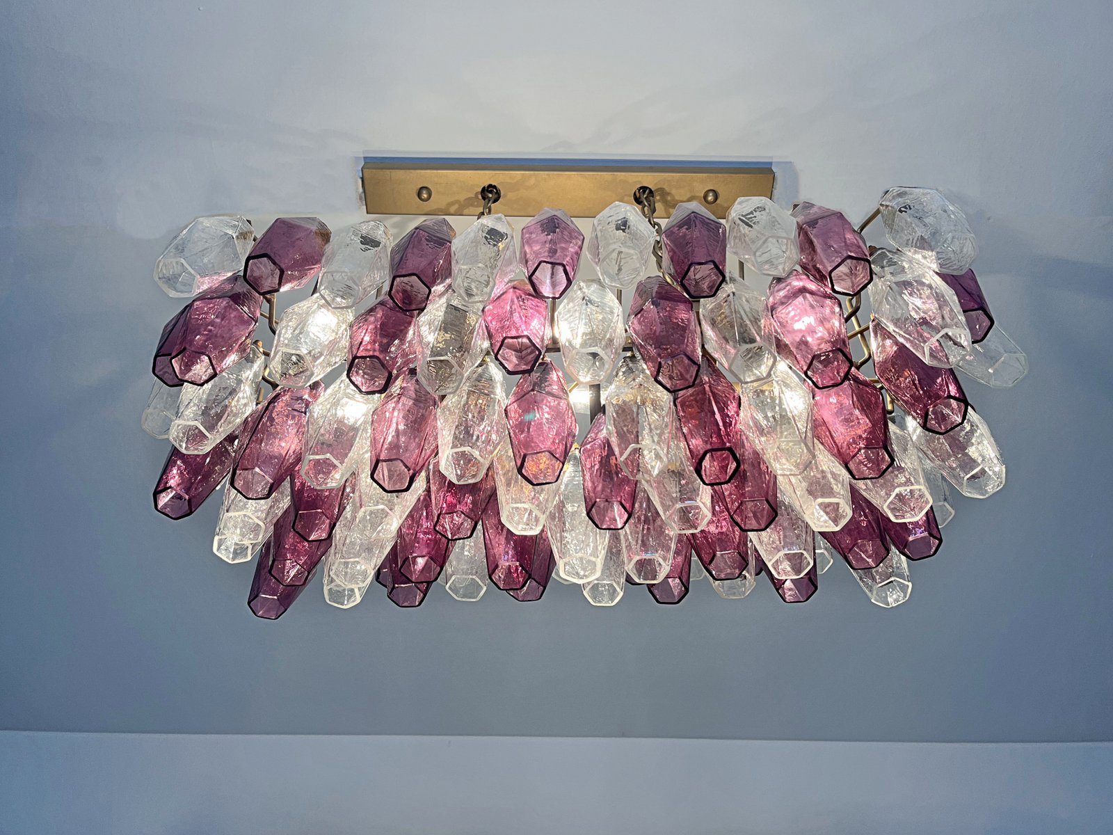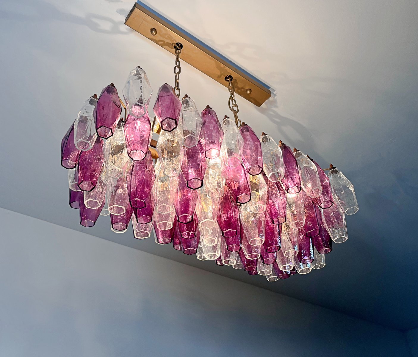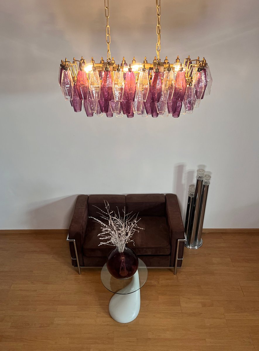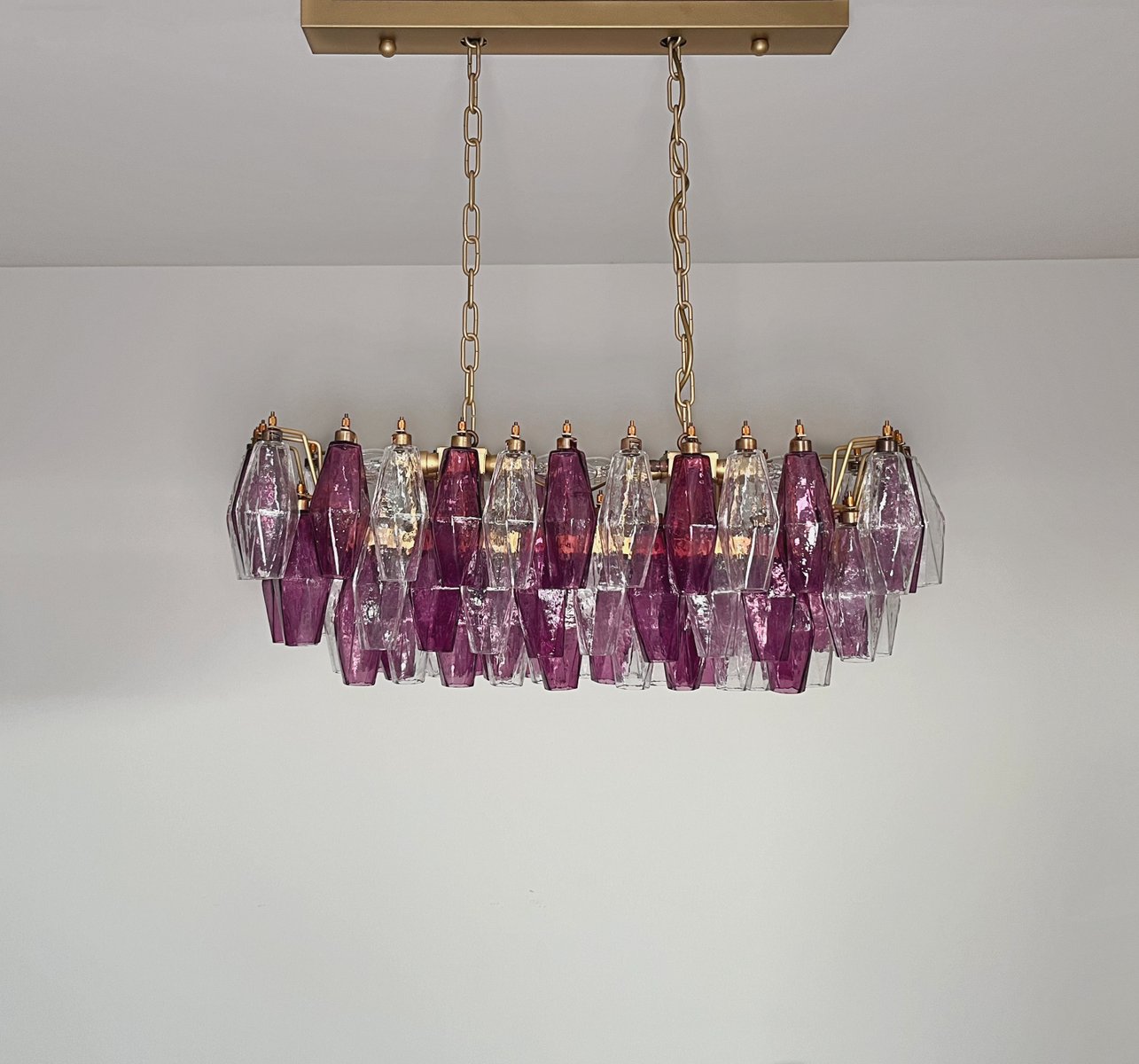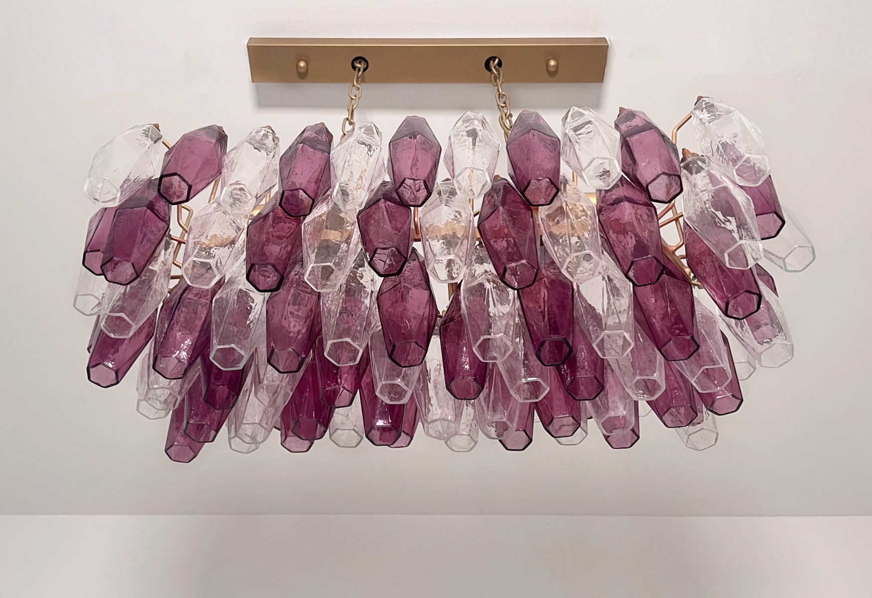 Elegante lampadario italiano realizzato con 84 splendidi vetri di Murano ametista e trasparente "poliedri". Struttura in metallo color oro e ottone. Il Poliedri è uno dei vetri di Murano più prestigiosi. Questo lampadario è un vero capolavoro! Bellissimo design in cui è visibile la tecnica avanzata.
