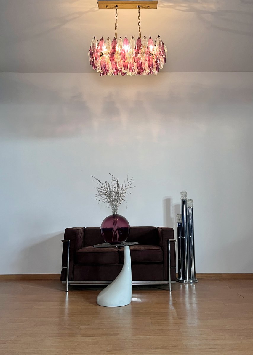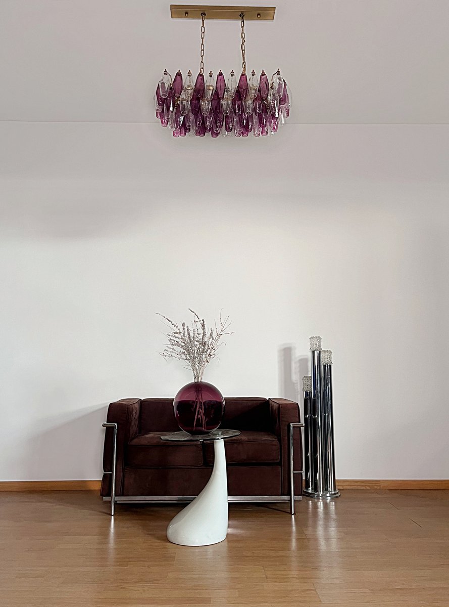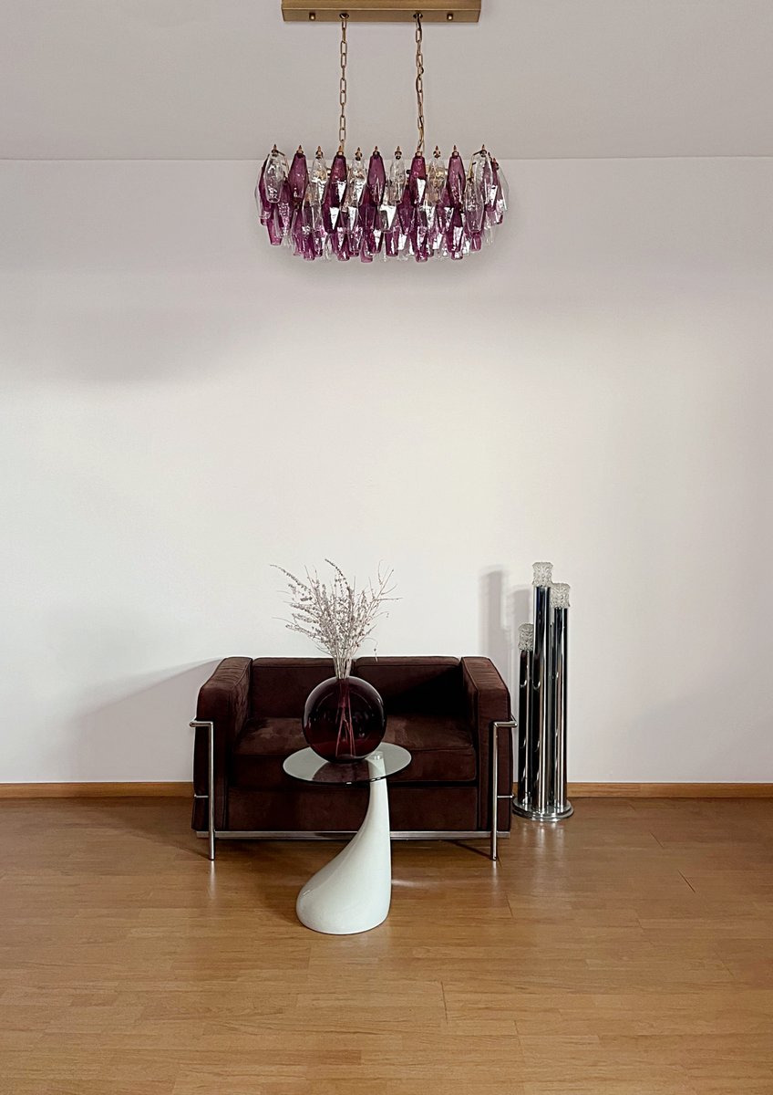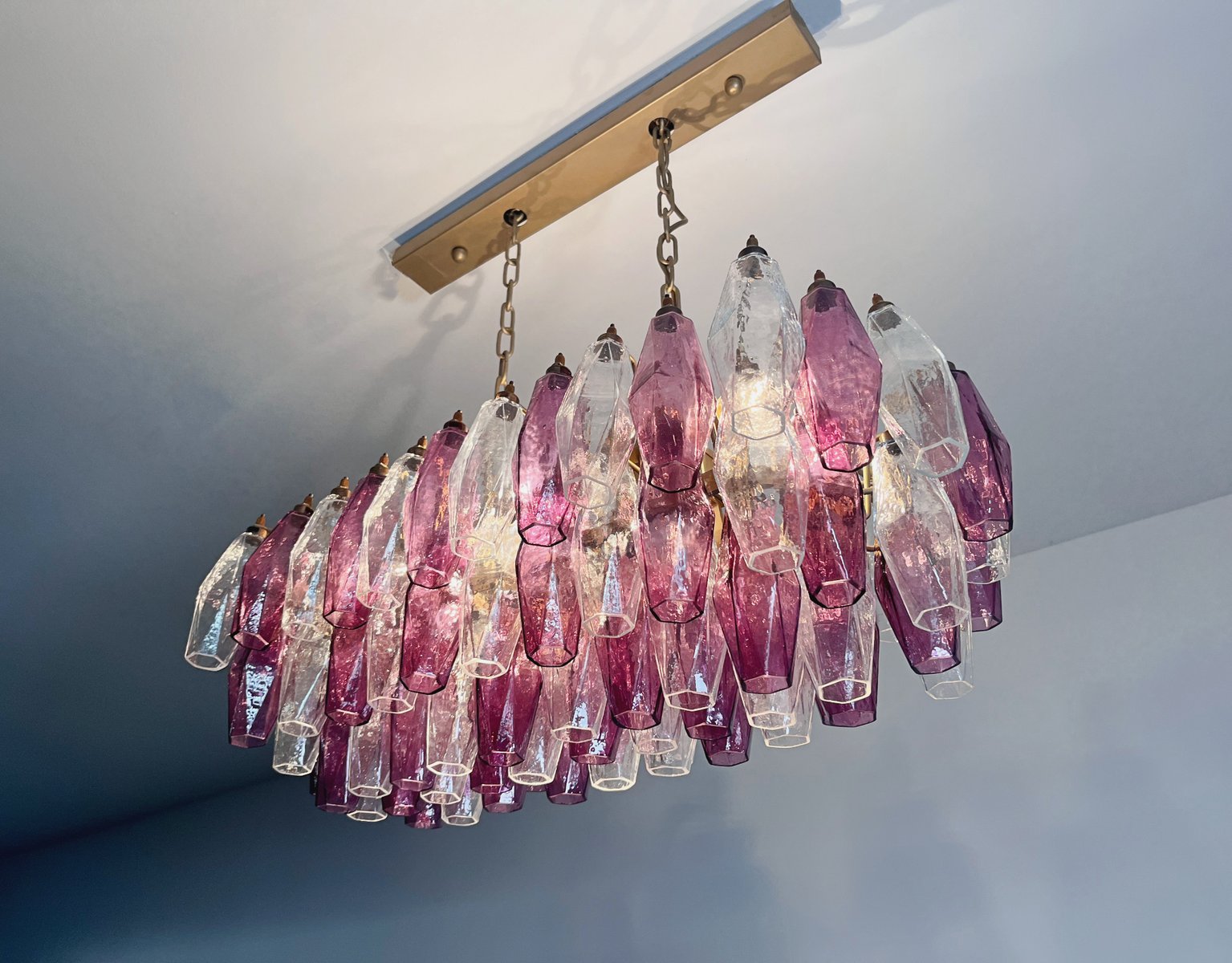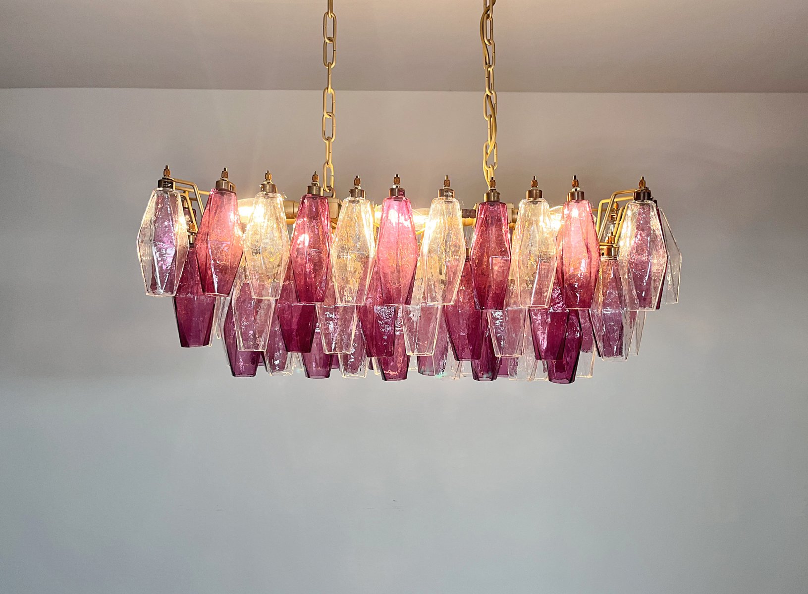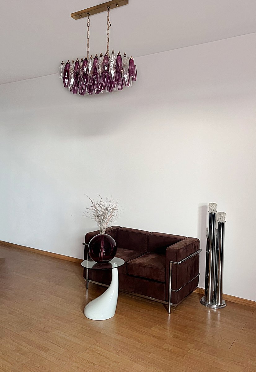 Elegante lampadario italiano realizzato con 84 splendidi vetri di Murano ametista e trasparente "poliedri". Struttura in metallo color oro e ottone. Il Poliedri è uno dei vetri di Murano più prestigiosi. Questo lampadario è un vero capolavoro! Bellissimo design in cui è visibile la tecnica avanzata.