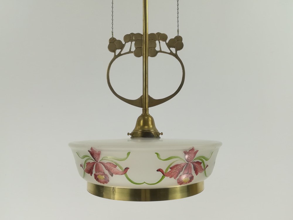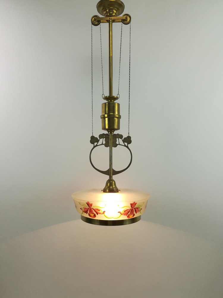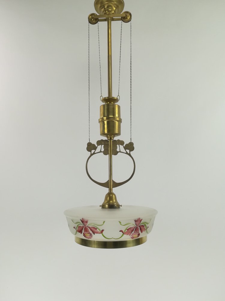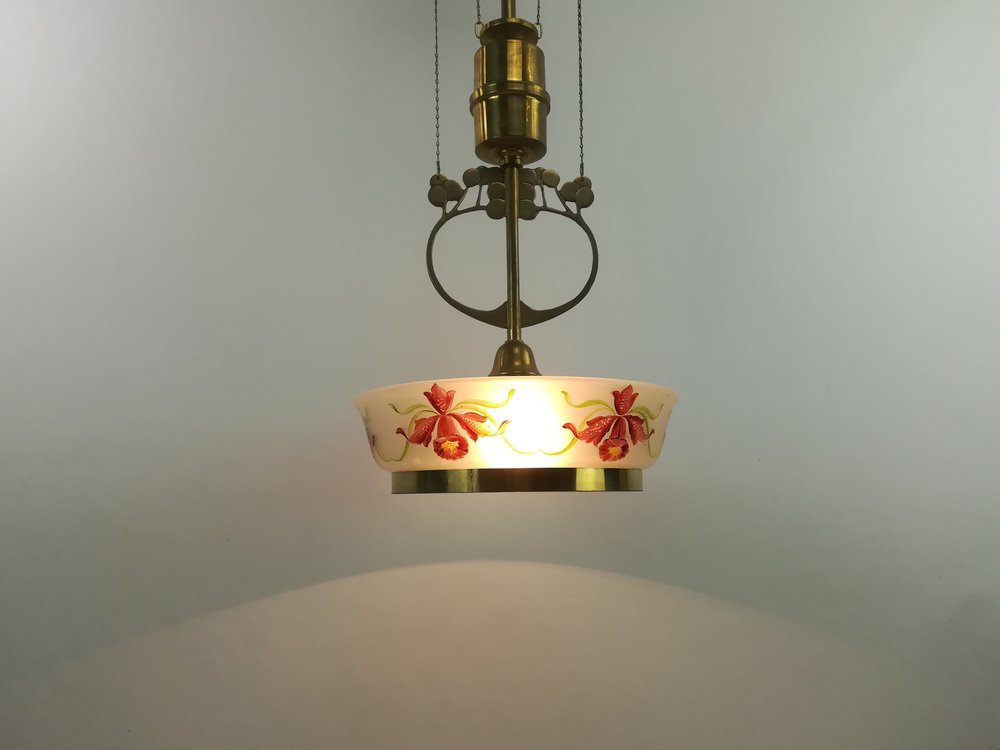 Lampadario regolabile con paralume in vetro dipinto a mano di Vienna, anni '20