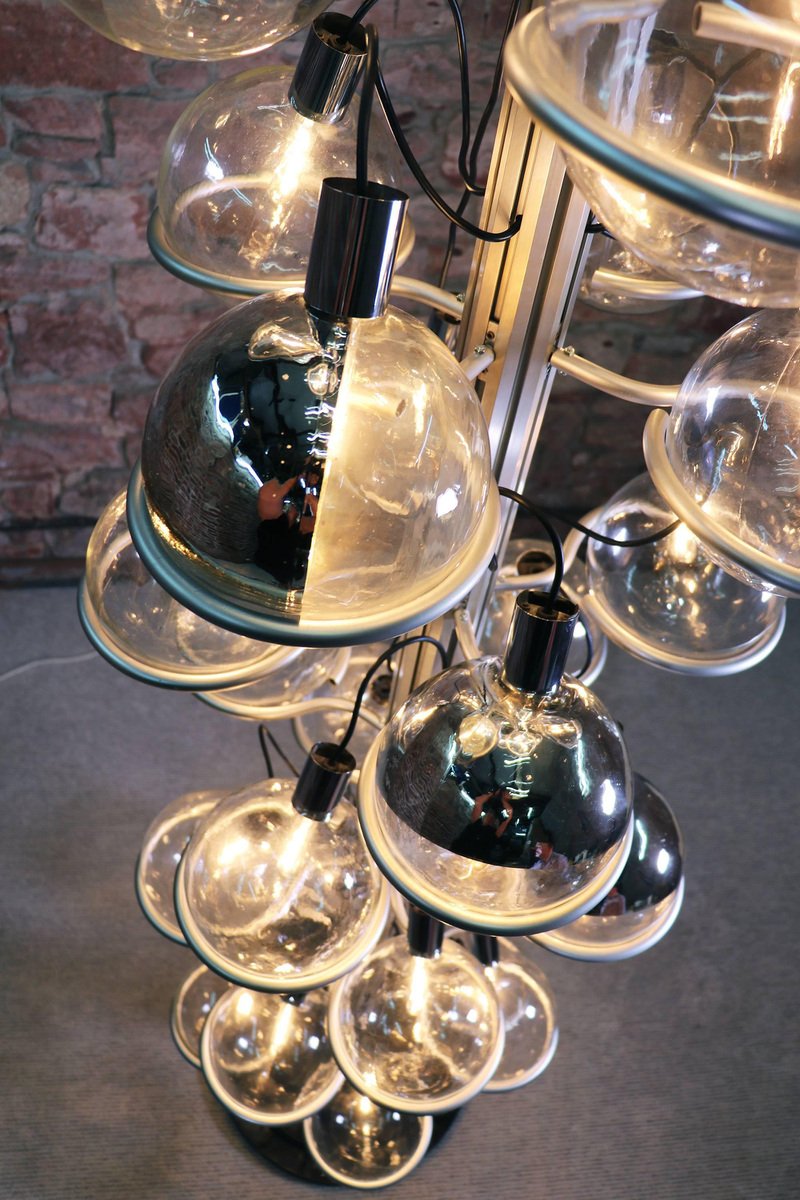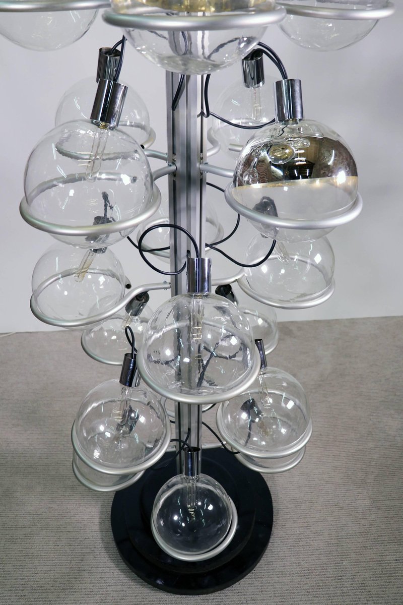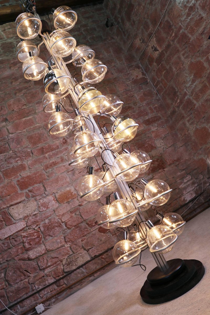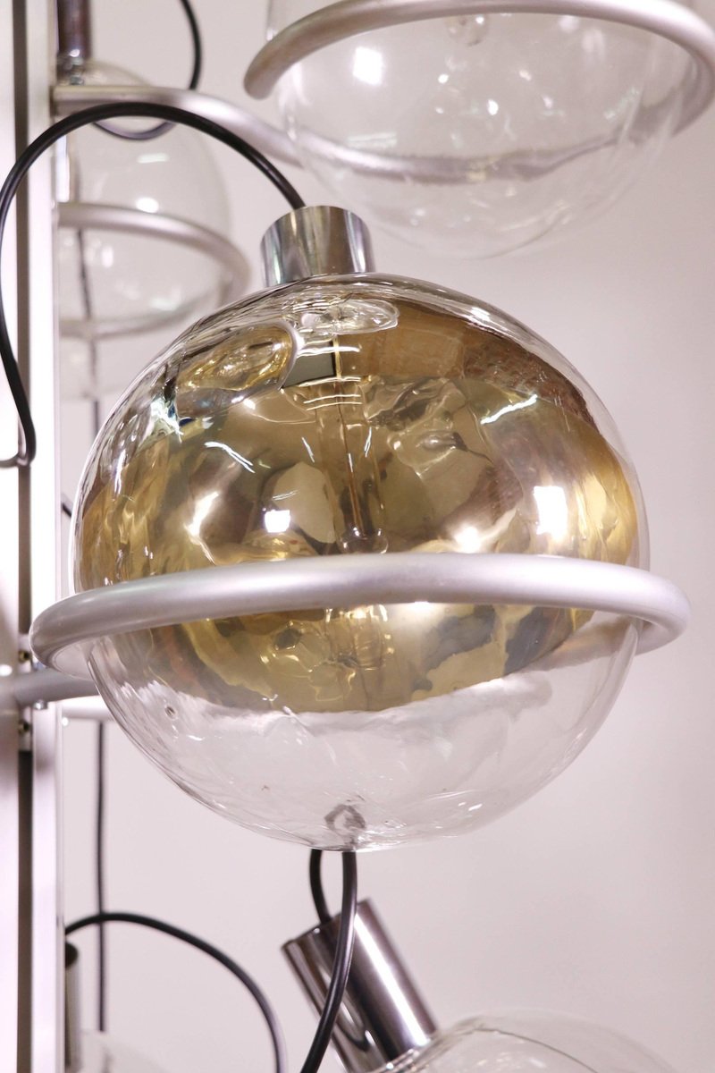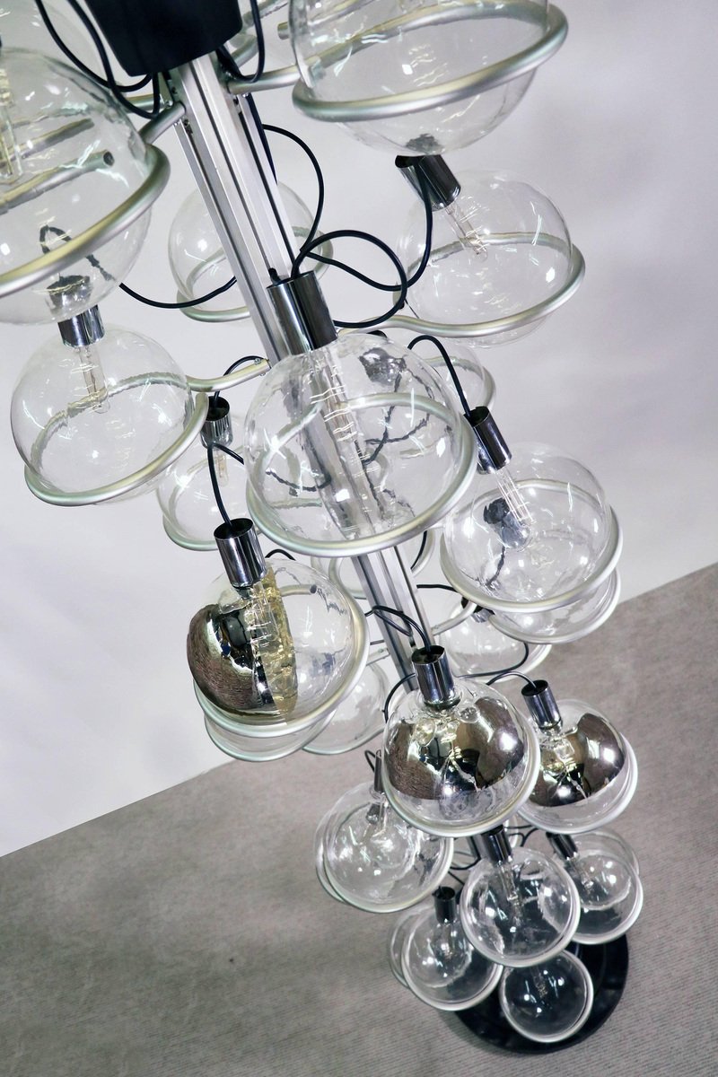 Questa monumentale lampada unica da 102 pollici composta da trentadue globi di vetro di Murano sostenuti da anelli metallici è il perfetto centrotavola per una lobby, un loft, un foyer o un ingresso. Questa magnifica lampada da pavimento a soffitto ricorda fortemente il lavoro di Gino Sarfatti e appare assolutamente splendida con i suoi globi di vetro disposti in otto file e fissati su una guida metallica. Il supporto molto pesante è stato incastrato nel terreno e la parte superiore montata sul soffitto. I globi di vetro hanno fili e sono parzialmente specchiati in argento e oro. Un vero e proprio eye-catcher anche non illuminato. Probabilmente un prodotto su misura commissionato da Oluce attr., Italia, anni '60. Design: Gino Sarfatti attr. Modello: Apparecchio Sputnik. Produttore: Oluce attr. Stile: mid-century modern, space age. Colori: chiaro, grigio, cromo e oro. Materiali: Vetro di Murano, alluminio, plastica, legno e metallo. Paese d'origine: Italia. Anno di produzione: 1960s. Misure: altezza 102" in. (260 cm), dm 27.55" in. (70 cm), dm per globo 8.3" in. (21 cm). Illuminazione: trentadue grandi lampadine a vite con base Edison E27. Potenza: raccomandiamo fino a 40w per lampadina. Funziona sia a 220v che a 110v. Condizione: ottime condizioni vintage. Nessuna imperfezione ai vetri. Applique abbinate in magazzino. Cablaggio: la lampada è stata testata con lampadine americane a 120v e funziona perfettamente, senza bisogno di attrezzi o di ricablaggio. Tutti i nostri prodotti sono originariamente cablati per 220v