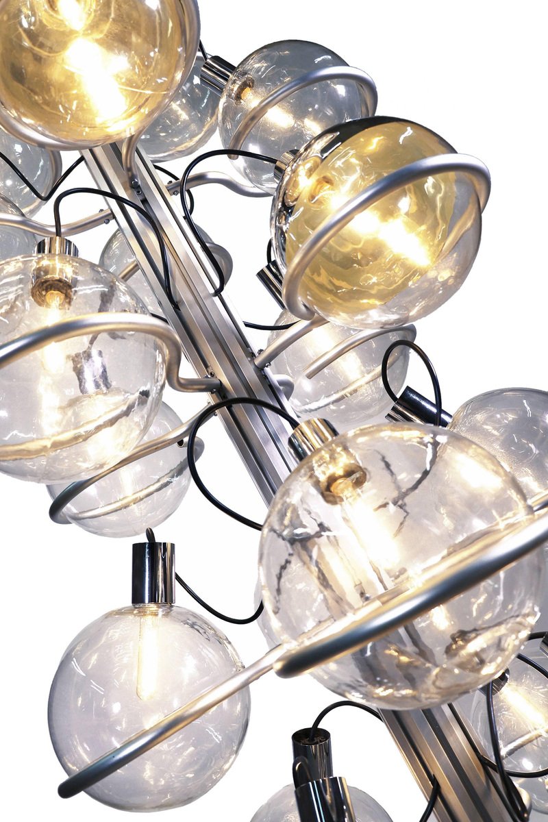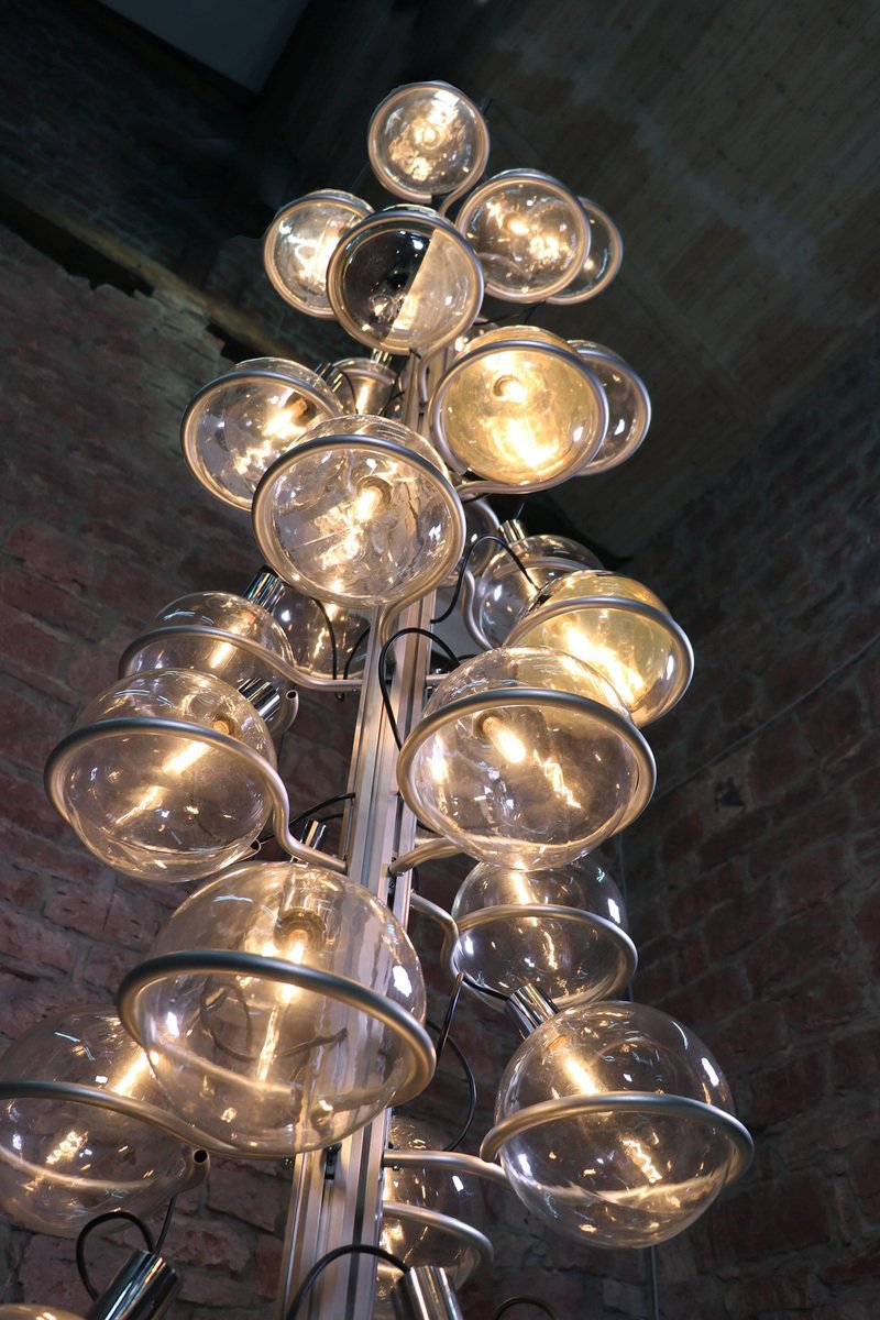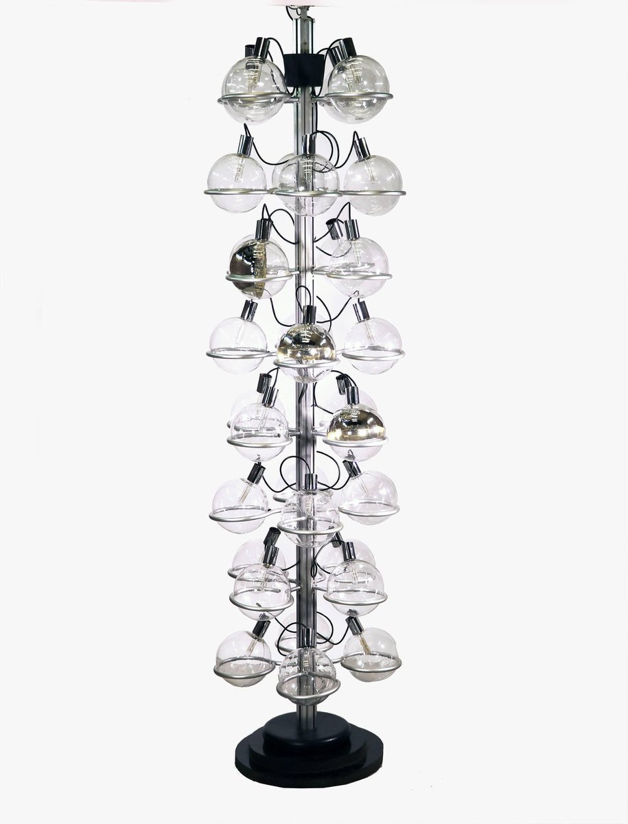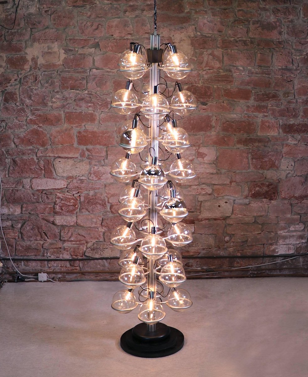 Questa monumentale lampada unica da 102 pollici composta da trentadue globi di vetro di Murano sostenuti da anelli metallici è il perfetto centrotavola per una lobby, un loft, un foyer o un ingresso. Questa magnifica lampada da pavimento a soffitto ricorda fortemente il lavoro di Gino Sarfatti e appare assolutamente splendida con i suoi globi di vetro disposti in otto file e fissati su una guida metallica. Il supporto molto pesante è stato incastrato nel terreno e la parte superiore montata sul soffitto. I globi di vetro hanno fili e sono parzialmente specchiati in argento e oro. Un vero e proprio eye-catcher anche non illuminato. Probabilmente un prodotto su misura commissionato da Oluce attr., Italia, anni '60. Design: Gino Sarfatti attr. Modello: Apparecchio Sputnik. Produttore: Oluce attr. Stile: mid-century modern, space age. Colori: chiaro, grigio, cromo e oro. Materiali: Vetro di Murano, alluminio, plastica, legno e metallo. Paese d'origine: Italia. Anno di produzione: 1960s. Misure: altezza 102" in. (260 cm), dm 27.55" in. (70 cm), dm per globo 8.3" in. (21 cm). Illuminazione: trentadue grandi lampadine a vite con base Edison E27. Potenza: raccomandiamo fino a 40w per lampadina. Funziona sia a 220v che a 110v. Condizione: ottime condizioni vintage. Nessuna imperfezione ai vetri. Applique abbinate in magazzino. Cablaggio: la lampada è stata testata con lampadine americane a 120v e funziona perfettamente, senza bisogno di attrezzi o di ricablaggio. Tutti i nostri prodotti sono originariamente cablati per 220v