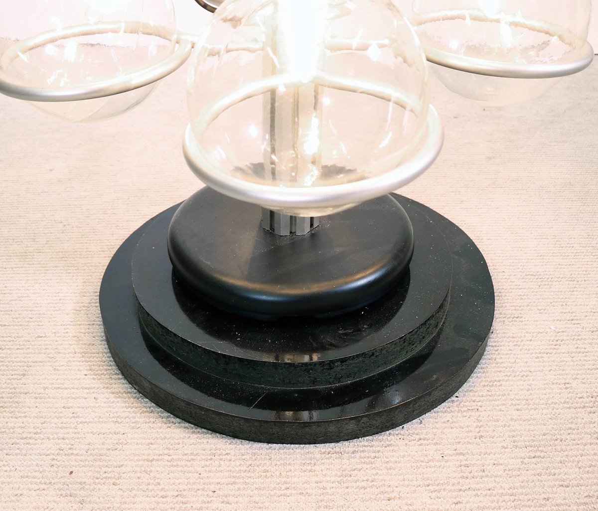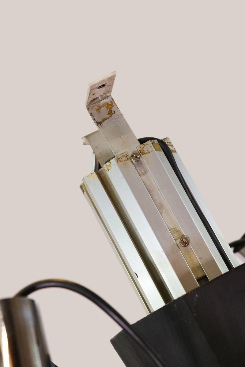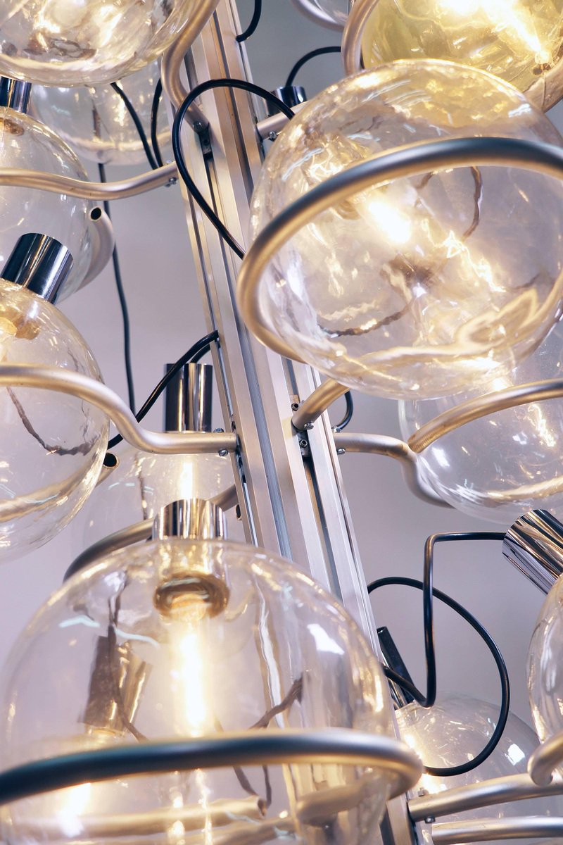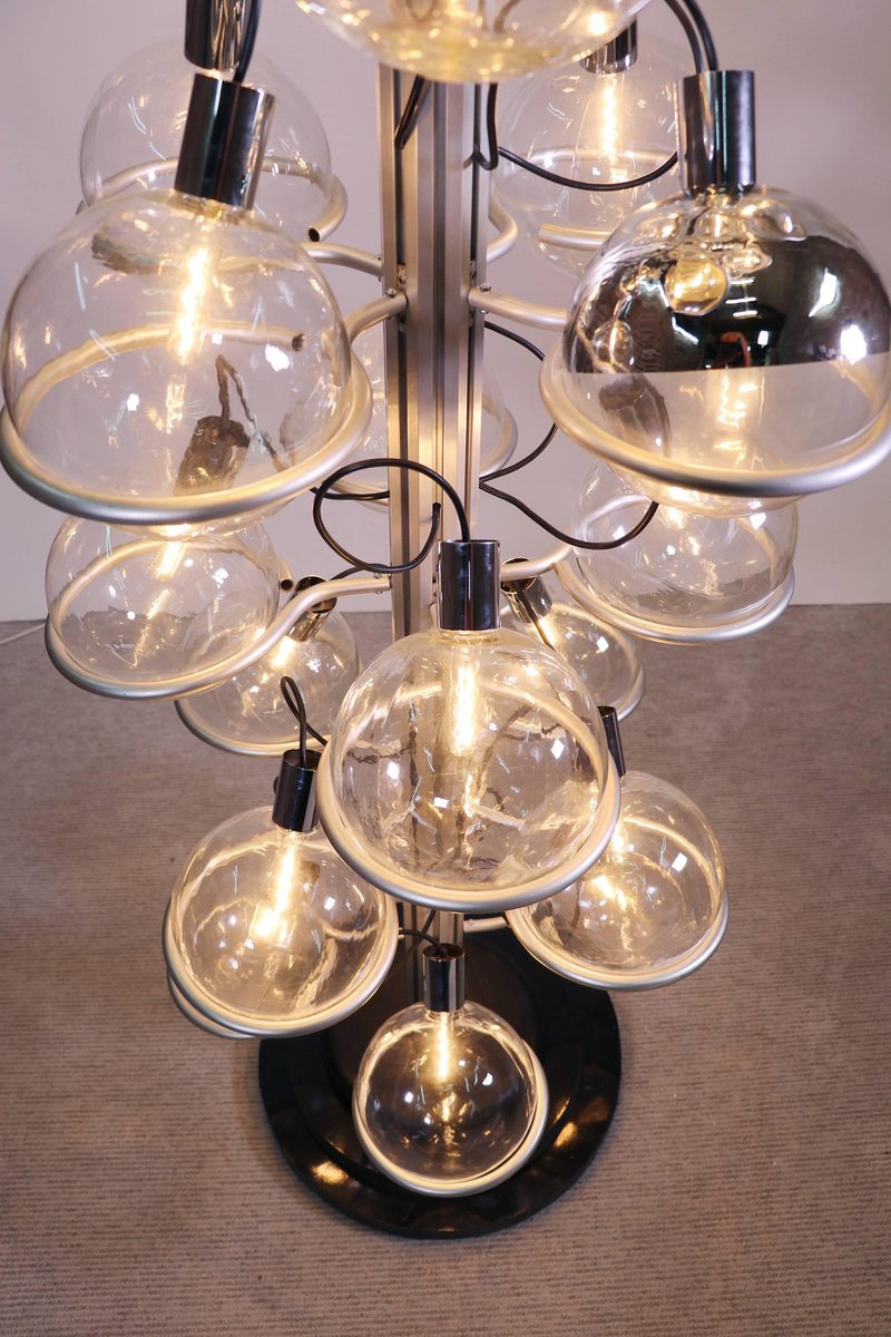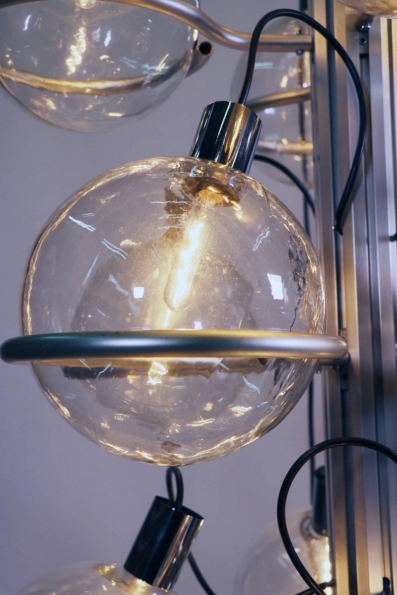 Questa monumentale lampada unica da 102 pollici composta da trentadue globi di vetro di Murano sostenuti da anelli metallici è il perfetto centrotavola per una lobby, un loft, un foyer o un ingresso. Questa magnifica lampada da pavimento a soffitto ricorda fortemente il lavoro di Gino Sarfatti e appare assolutamente splendida con i suoi globi di vetro disposti in otto file e fissati su una guida metallica. Il supporto molto pesante è stato incastrato nel terreno e la parte superiore montata sul soffitto. I globi di vetro hanno fili e sono parzialmente specchiati in argento e oro. Un vero e proprio eye-catcher anche non illuminato. Probabilmente un prodotto su misura commissionato da Oluce attr., Italia, anni '60. Design: Gino Sarfatti attr. Modello: Apparecchio Sputnik. Produttore: Oluce attr. Stile: mid-century modern, space age. Colori: chiaro, grigio, cromo e oro. Materiali: Vetro di Murano, alluminio, plastica, legno e metallo. Paese d'origine: Italia. Anno di produzione: 1960s. Misure: altezza 102" in. (260 cm), dm 27.55" in. (70 cm), dm per globo 8.3" in. (21 cm). Illuminazione: trentadue grandi lampadine a vite con base Edison E27. Potenza: raccomandiamo fino a 40w per lampadina. Funziona sia a 220v che a 110v. Condizione: ottime condizioni vintage. Nessuna imperfezione ai vetri. Applique abbinate in magazzino. Cablaggio: la lampada è stata testata con lampadine americane a 120v e funziona perfettamente, senza bisogno di attrezzi o di ricablaggio. Tutti i nostri prodotti sono originariamente cablati per 220v