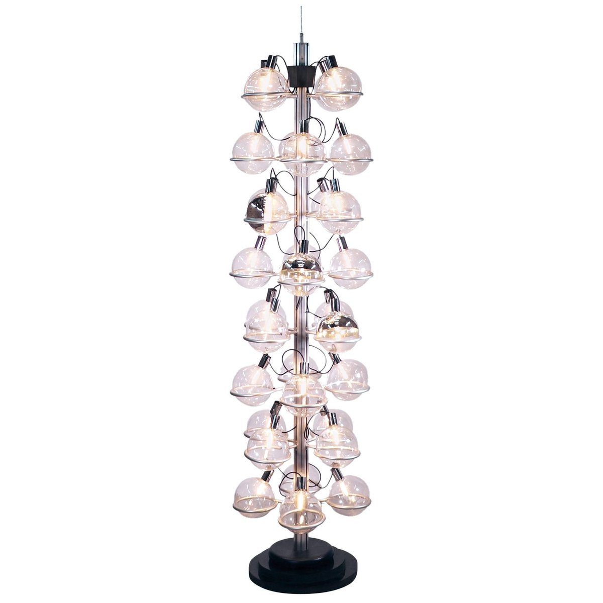 This unique monumental 102" in. cluster statement luminaire made of thirty-two Murano glass globes supported by metal rings is the perfect centerpiece for a lobby, loft, foyer or entrance. This magnificent from floor to ceiling light is strongly reminiscent to the work of Gino Sarfatti and appears absolutely gorgeous with its glass globes arranged in eight rows and fixed on a metal rail. The very heavy stand was embedded in the ground and the top mounted to the ceiling. The glass globes have threads and are partially mirrored in silver and gold. A real eye-catcher even unlit. Probably a custom-made product commissioned by Oluce attr., Italy, 1960s. Design: Gino Sarfatti attr. Model: Sputnik Luminaire. Manufacturer: Oluce attr. Style: mid-century modern, space age. Colours: clear, grey, chrome and golden. Materials: Murano glass, aluminium, plastics, wood and metal. Country of origin: Italy. Year of production: 1960s. Measures: height 102" in. (260 cm), dm 27.55" in. (70 cm), dm per globe 8.3" in. (21 cm). Lighting: takes thirty-two big E27 Edison base screw bulbs. Wattage: we recommend up to 40w per bulb. Works on 220v as well as 110v. Condition: very good vintage condition. No imperfections to the glasses. Matching Sconces in stock. Wiring: the lamp has been tested with US American light bulbs under 120v and works flawlessly, no tools or rewiring required. All our goods are originally wired for 220v.