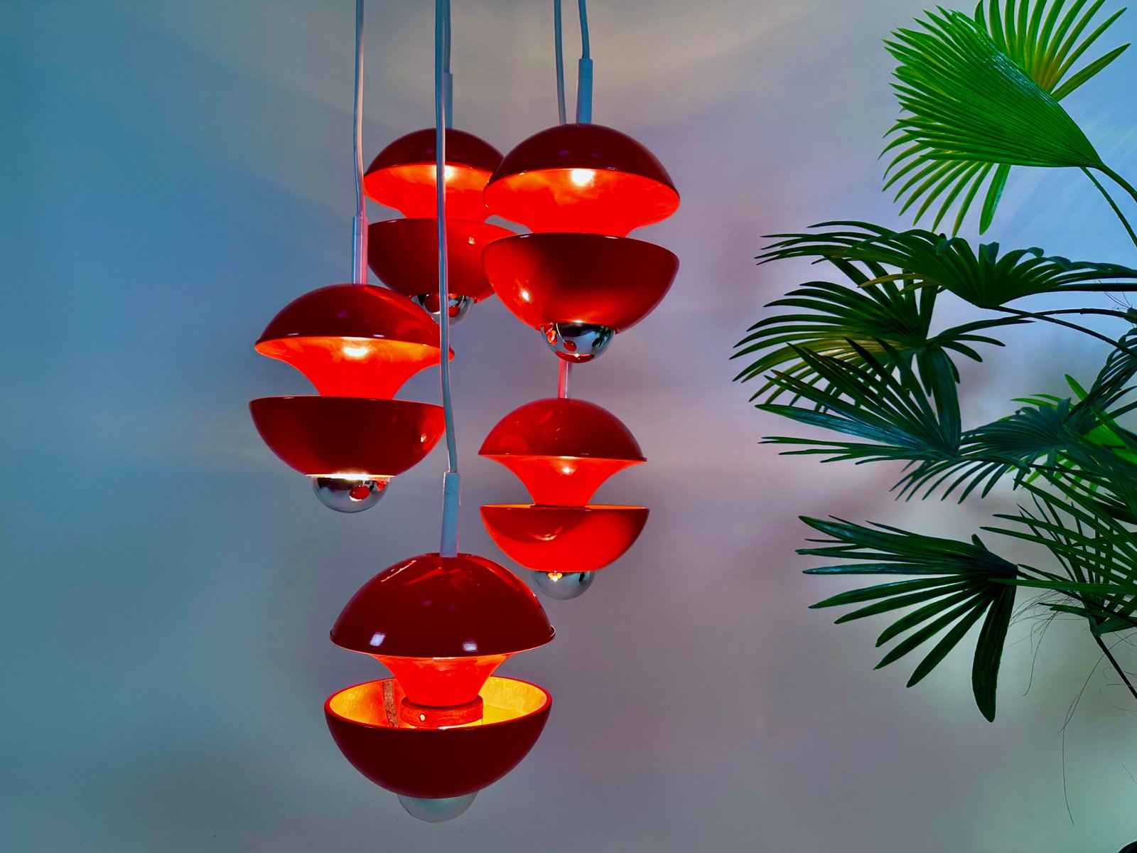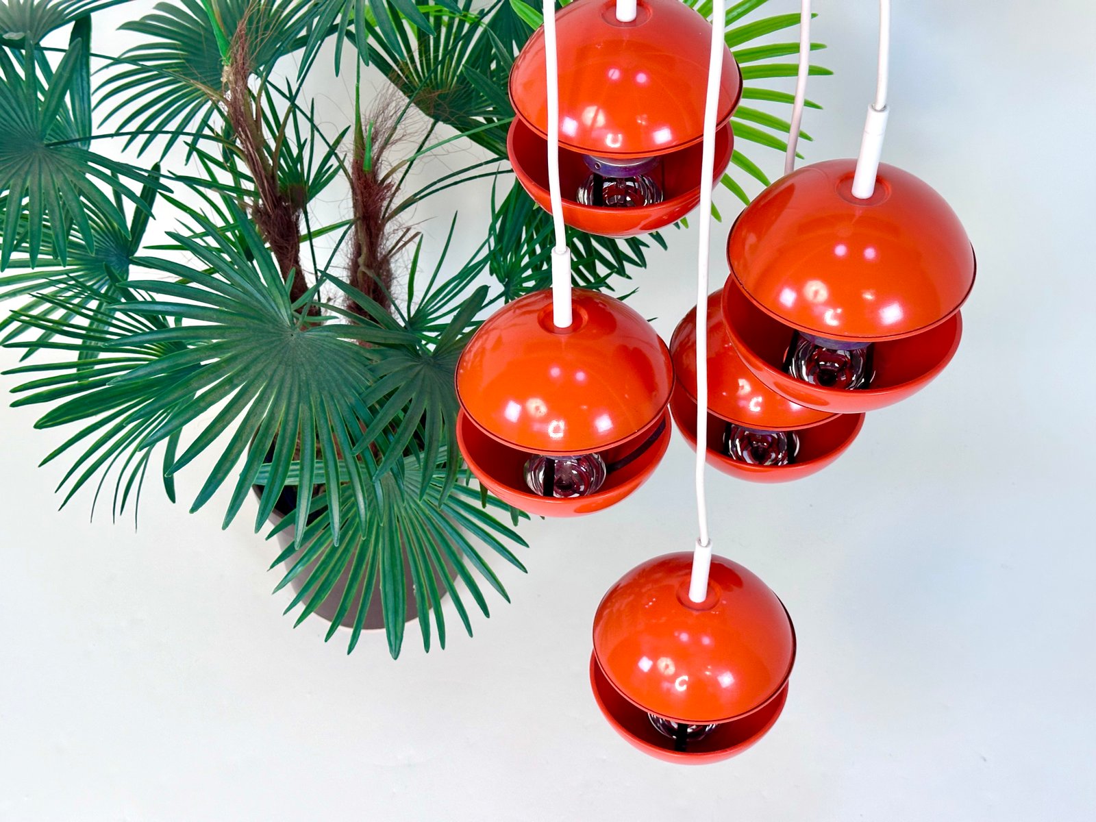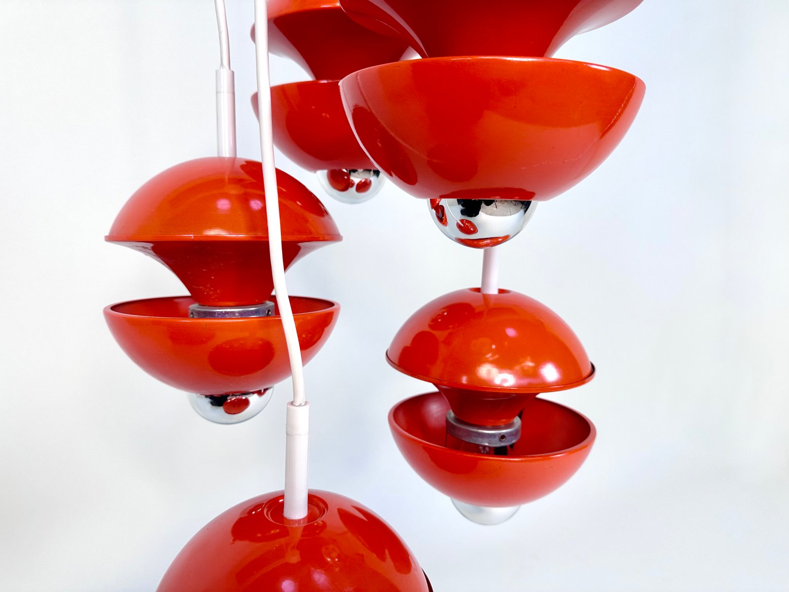 This impressive award winning cascading lamp was designed by Klaus Hempel in Germany for Kaiser Leuchten. The modernist design interpretation of a classic chandelier features 5 coral red metal ball lamps hanging from a white plastic plate. This light object creates beautiful lighting effects, especially when half mirrored bulbs are used.