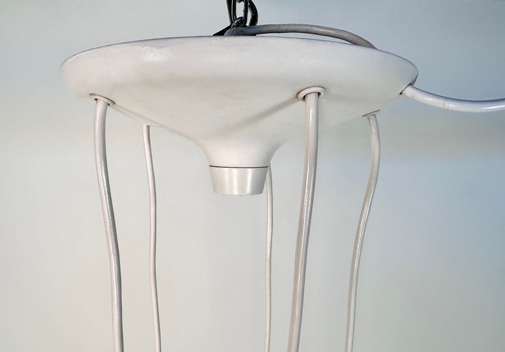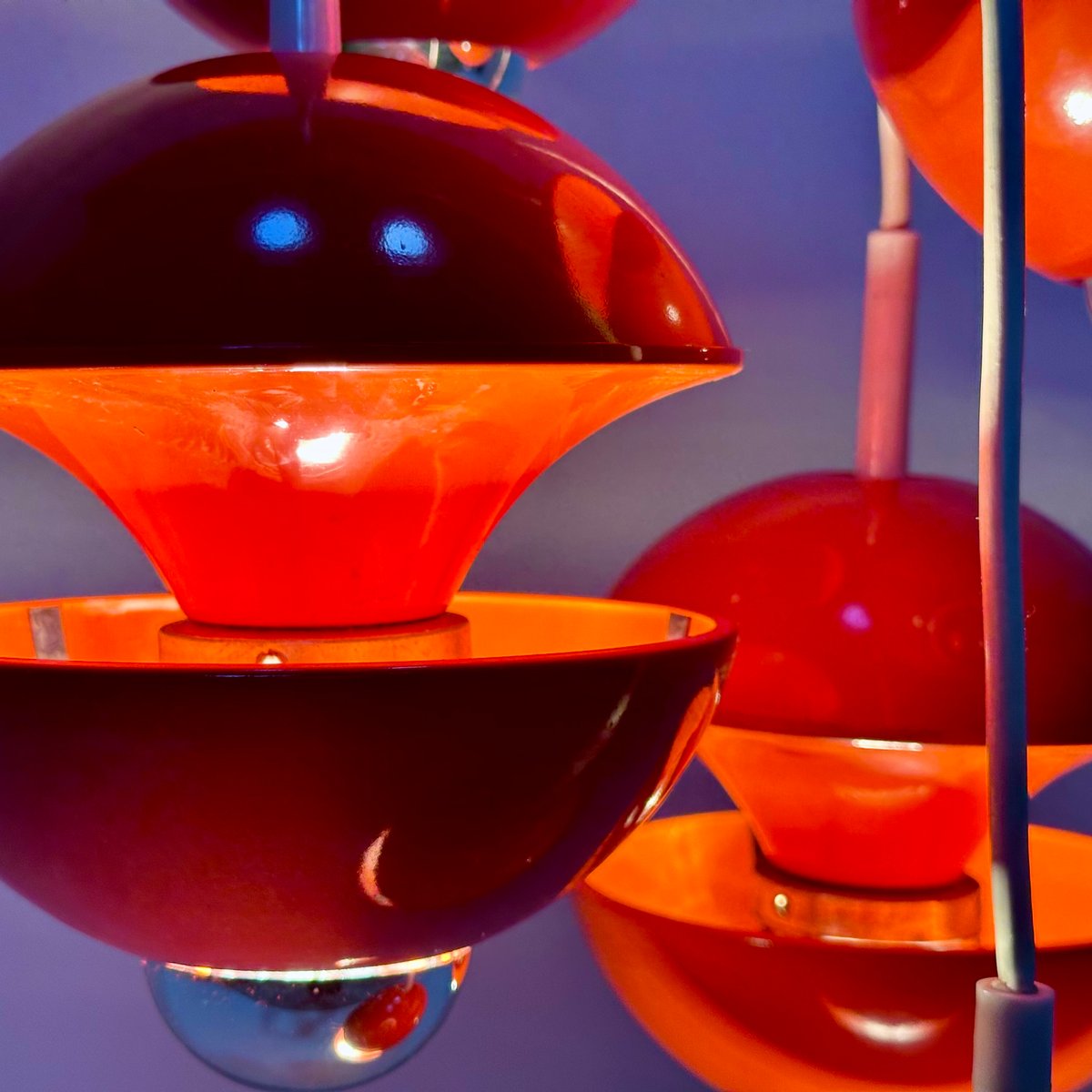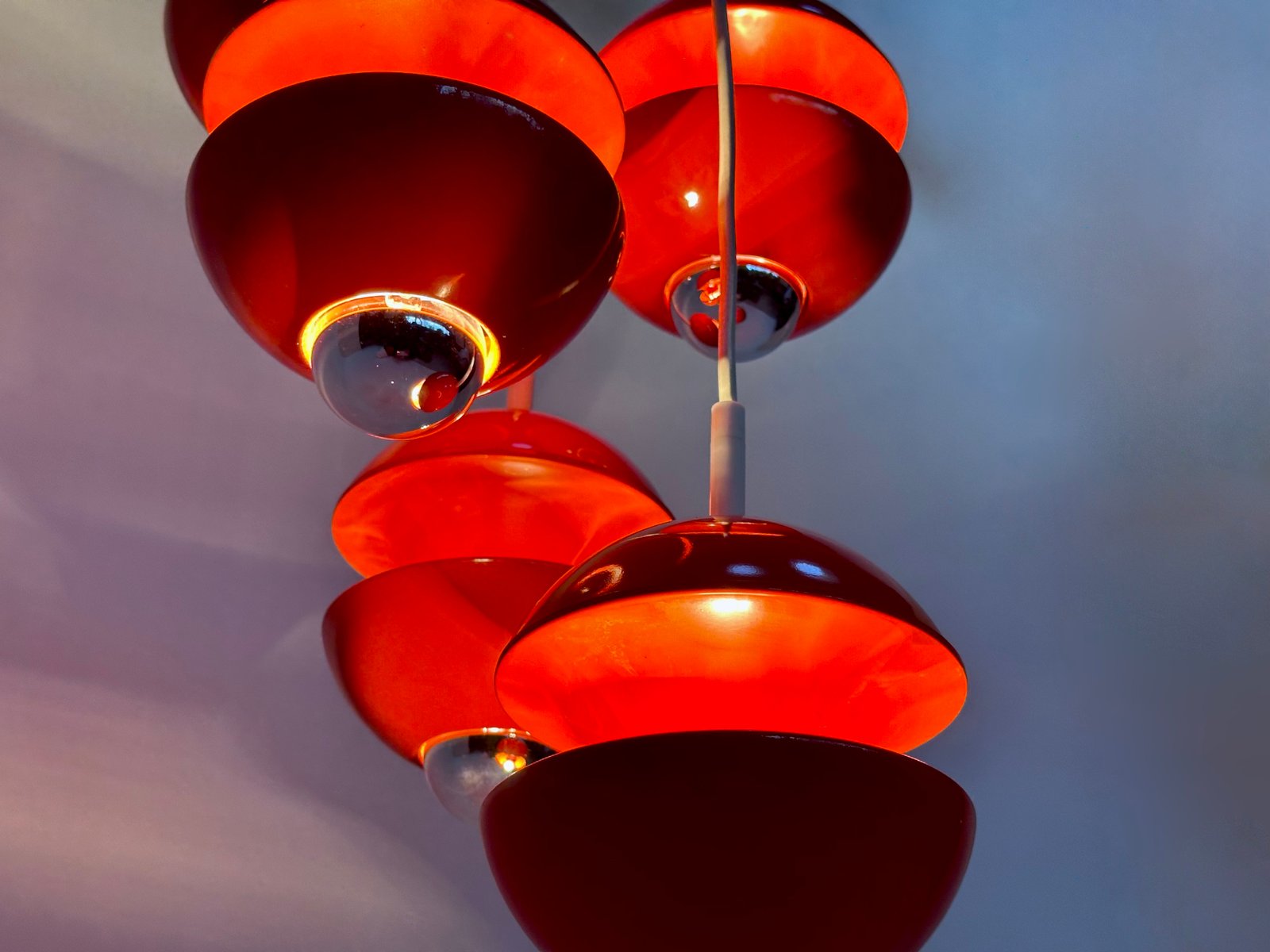 This impressive award winning cascading lamp was designed by Klaus Hempel in Germany for Kaiser Leuchten. The modernist design interpretation of a classic chandelier features 5 coral red metal ball lamps hanging from a white plastic plate. This light object creates beautiful lighting effects, especially when half mirrored bulbs are used.