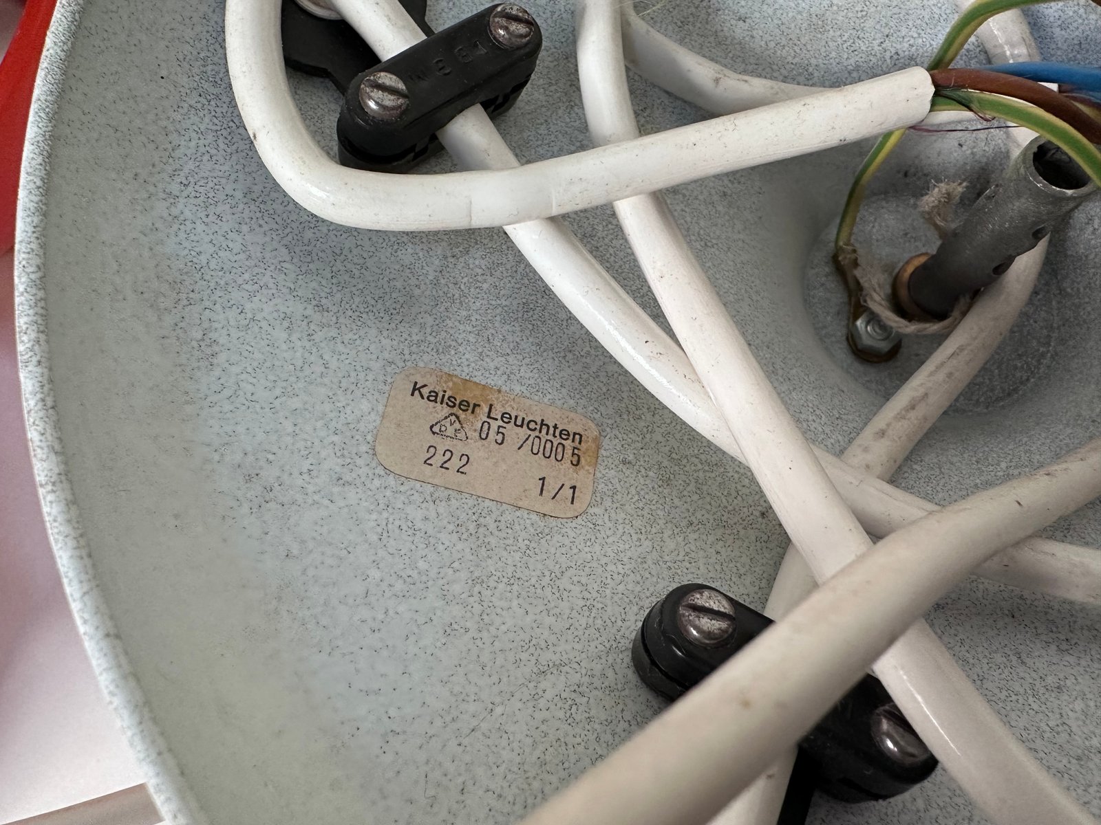 Questa imponente e pluripremiata lampada a cascata è stata progettata da Klaus Hempel in Germania per Kaiser Leuchten. L'interpretazione modernista di un lampadario classico è caratterizzata da 5 lampade a sfera in metallo rosso corallo che pendono da un piatto di plastica bianca. Questo oggetto luminoso crea bellissimi effetti di luce, soprattutto quando si utilizzano lampadine a metà specchio.