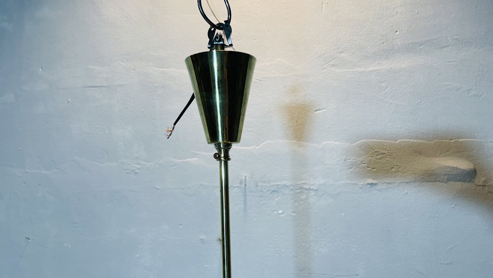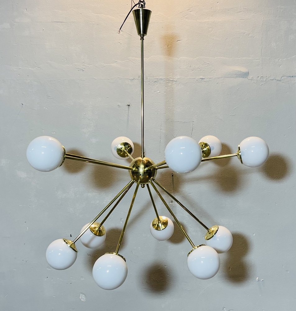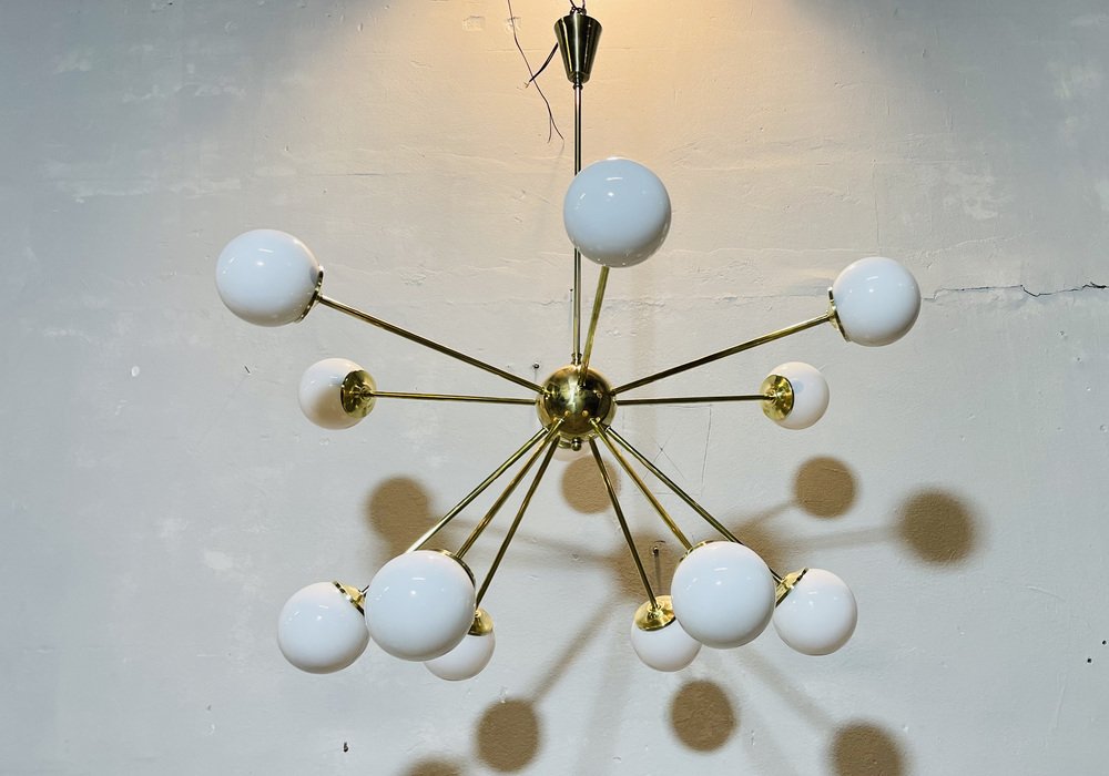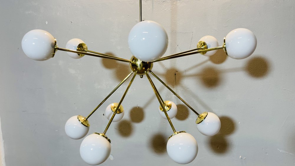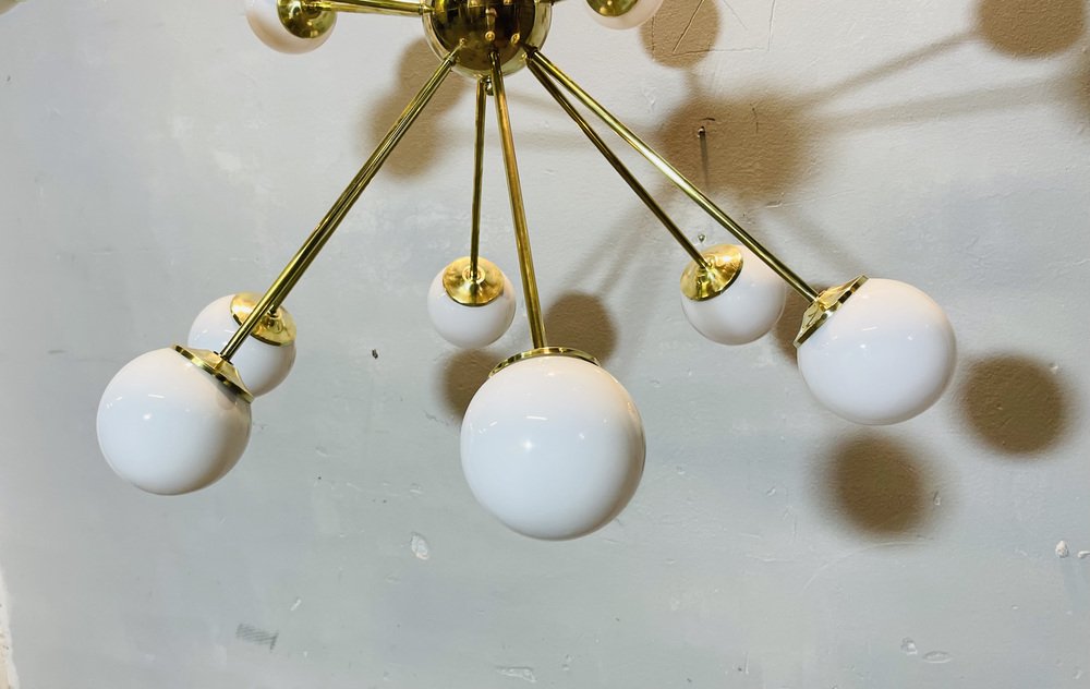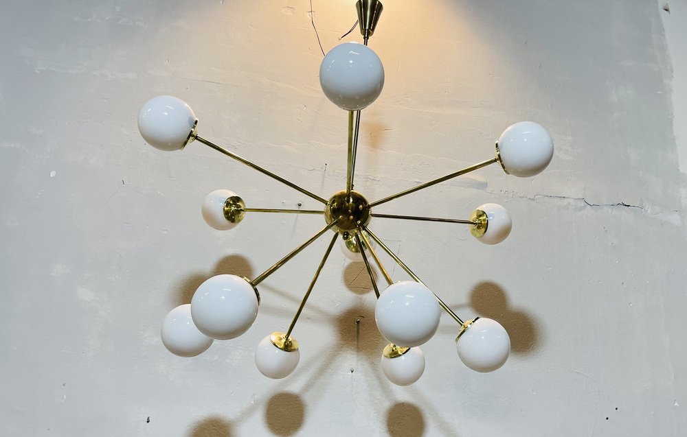 Elegante lampadario modello Sputnik risalente agli anni ’60, realizzato interamente in ottone, con una preziosa sfera centrale in bronzo che conferisce al pezzo una presenza scultorea e sofisticata. Il lampadario è dotato di 12 punti luce, ciascuno completato da un diffusore in vetro opalino bianco, per una luce morbida e diffusa.