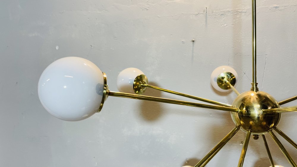Elegant chandelier model Sputnik dating from the 1960s, made entirely of brass, with a precious central bronze sphere that gives the piece a sculptural and sophisticated presence. The chandelier features 12 light points, each complemented by a white opal glass diffuser for a soft, diffused light.