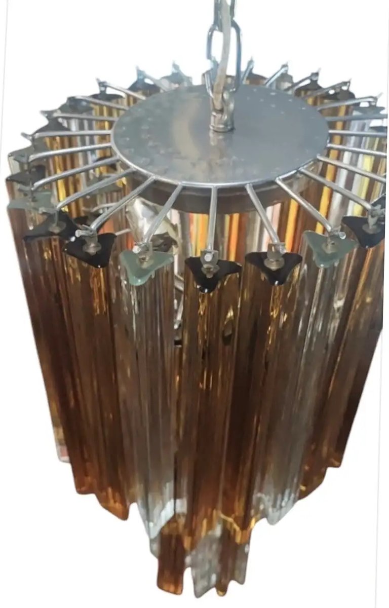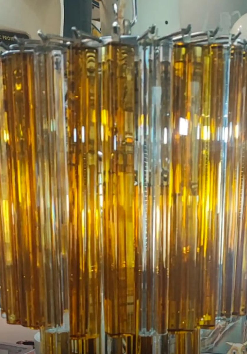 Questo lampadario a spirale trilobi in vetro di Murano giallo e bianco è uno straordinario esempio di artigianato italiano, caratterizzato da elementi in vetro soffiato a mano con un caratteristico design a tre lobi (trilobi) disposti a cascata. Questi lampadari sono spesso associati a designer famosi come Paolo Venini, che ha reso popolare il design trilobi a metà del XX secolo. Il lampadario è tipicamente costituito da moduli artigianali in cristallo massiccio, caratterizzati dalla sezione trilobata, appesi a una struttura in metallo cromato. La combinazione di vetro giallo e bianco aggiunge un tocco vibrante ma elegante, rendendolo un punto focale in qualsiasi ambiente interno. I veri pezzi di vetro di Murano sono molto apprezzati per la loro qualità e maestria. Incorporare un lampadario a cascata trilobi in vetro di Murano giallo e bianco nel vostro spazio non solo ne migliora l'estetica, ma porta anche un pezzo d'arte e di storia italiana nella vostra casa. Il lampadario è in buone condizioni, solo la parte metallica presenta segni d'uso e d'età.