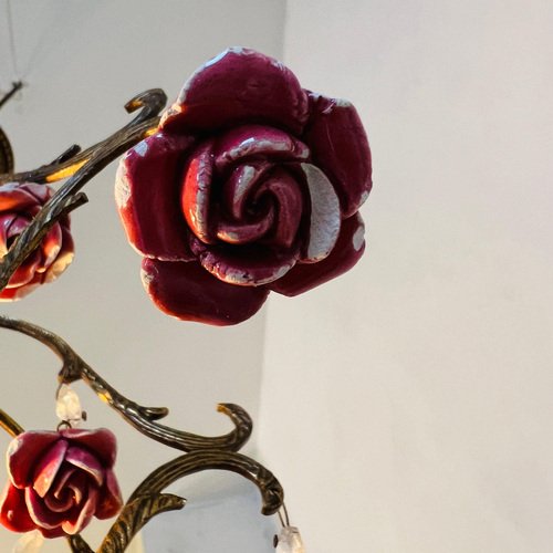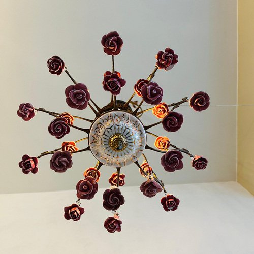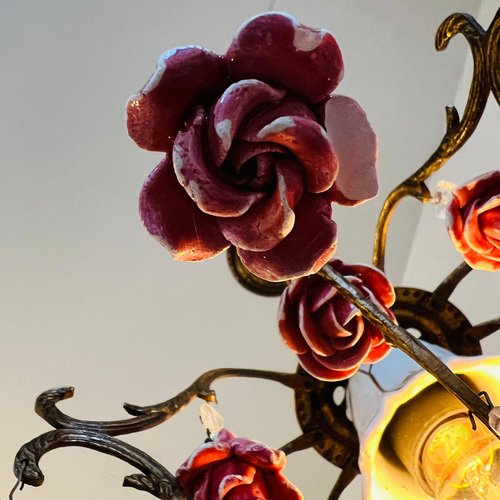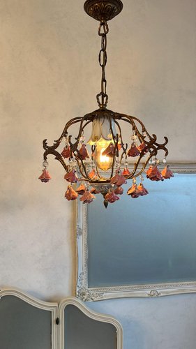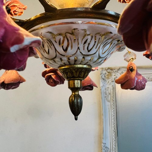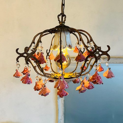 This gorgeous tole chandelier porcelain is done in delicate ornate Capodimonte style. It has a brass and porcelain body with hanging pink roses and gold-painted details. This porcelain chandelier decorated with flowers, in a soft pink color and mixed with gold brass, makes a huge visual impact in every room it might be put into! Perfect structural condition and is working just perfectly. Measures: Long with chain: 51 cm / 20 inches. Width: 30 cm / 11.8 inches. Checked, tested, functional. It Fits E27 and E26 bulbs. Perfectly functional in Europe, the US, Canada, and Japan. The pendant can work at 220v also at 120v. Condition: Some flowers/roses are a bit damaged, see the photos. All the items in our shop are vintage, mostly used. See the photos for full details and the of any imperfections.