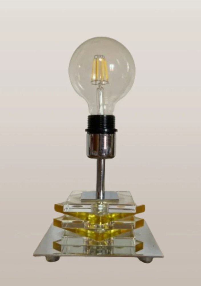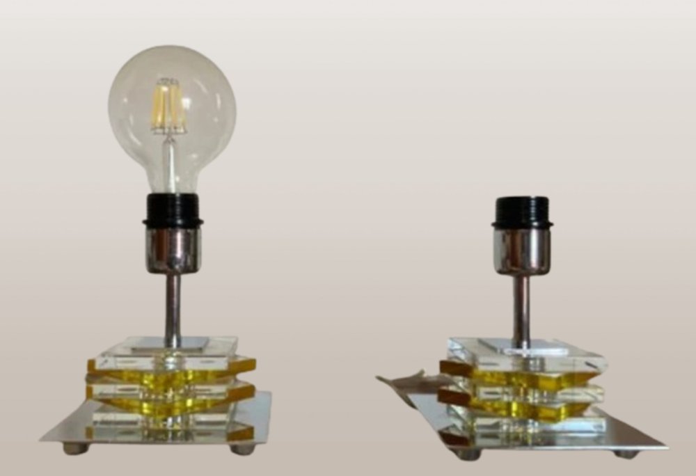 We present our impressive vintage bedside table lamps made of high-quality chrome-plated brass and superimposed cubes of transparent chrome and yellow colored glass, a perfect combination of functionality and retro charm that is both cubist and industrial. Made from high-quality metal and featuring a unique design, these lamps are a stylish addition to any nightstand or desk. with its timeless aesthetic, which dates back to the turn of the century, those wonderful 2000s, it effortlessly enhances any vintage or contemporary decor. The chrome metal details further elevate the elegance of these lamps, creating a striking piece that draws attention. Whether you're reading your favorite book before bed or working late into the night, these vintage bedside lamps provide just the right amount of warm ambient light. Don't miss the opportunity to add a touch of nostalgia and sophistication to your living space.